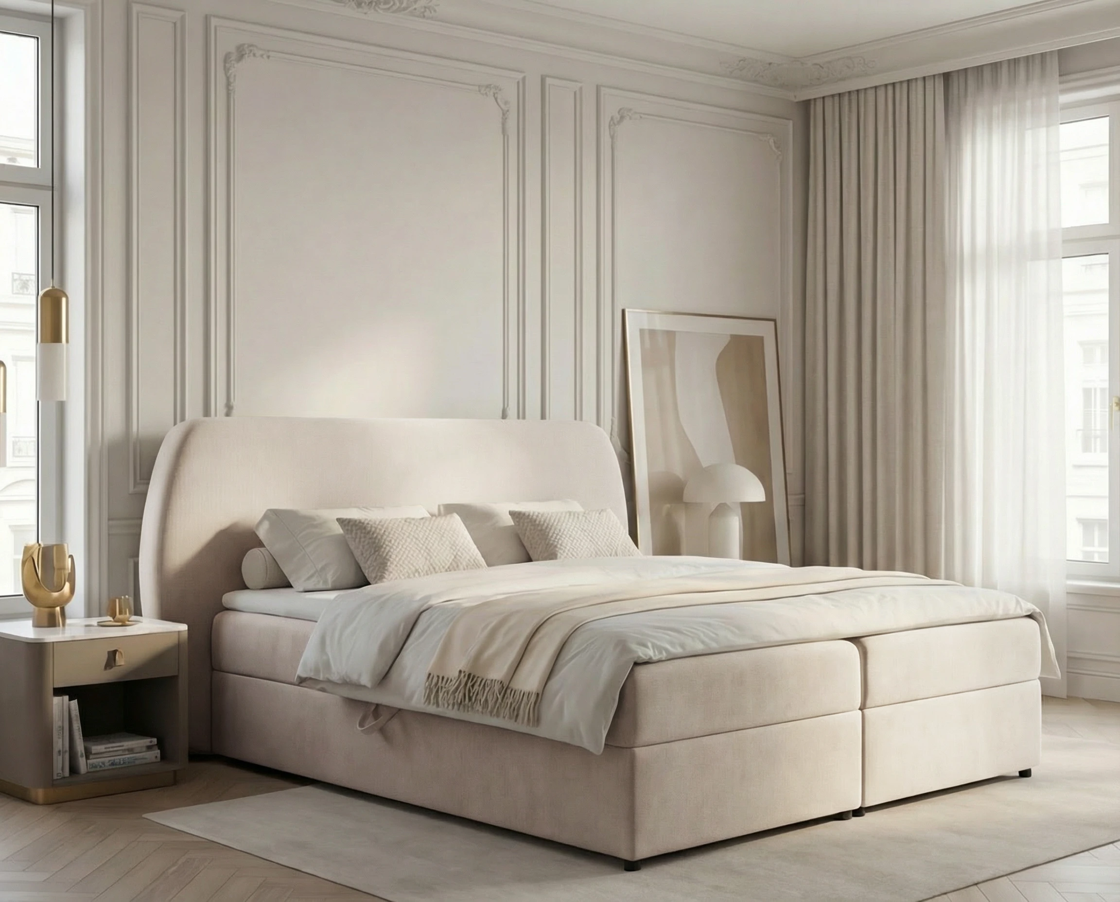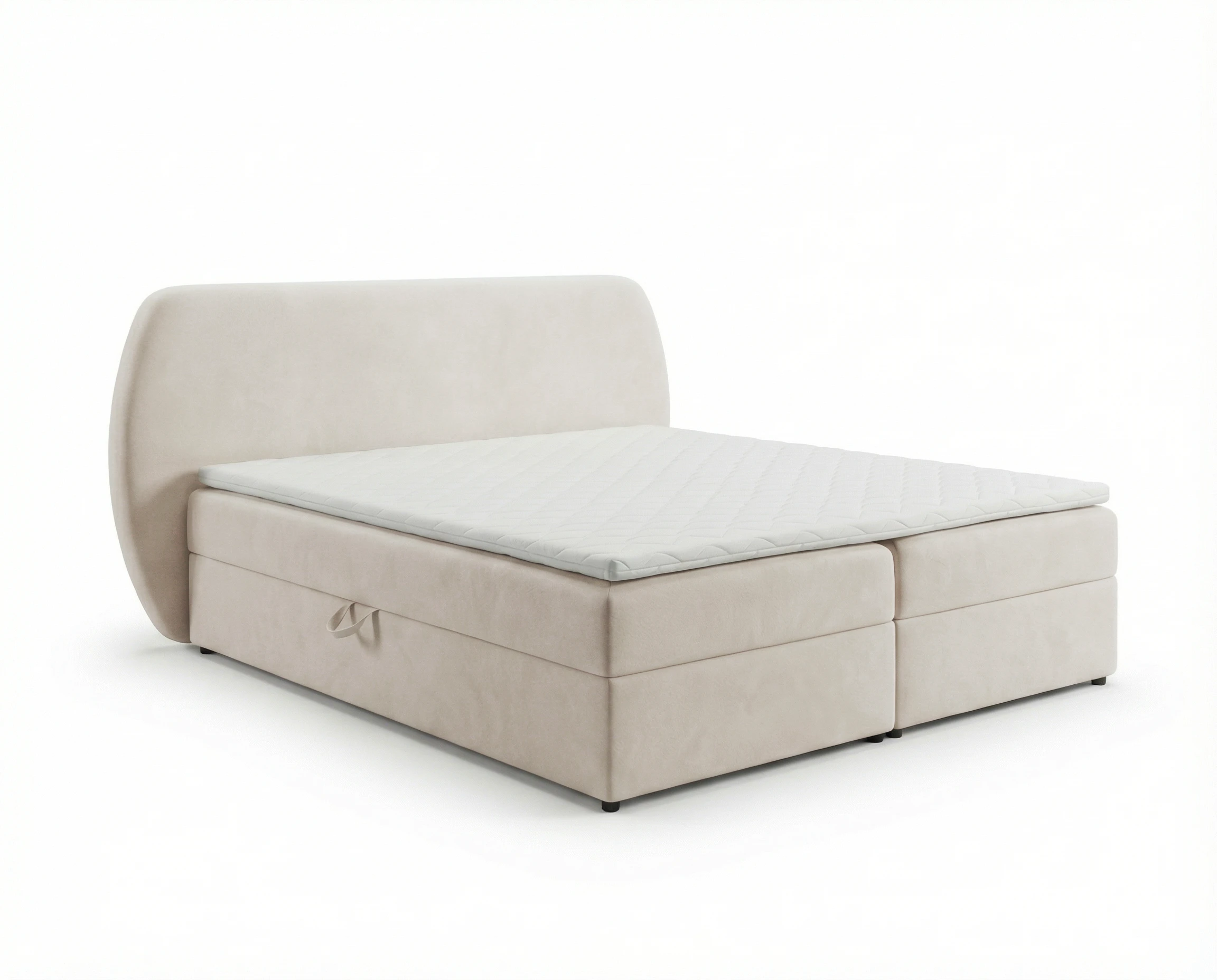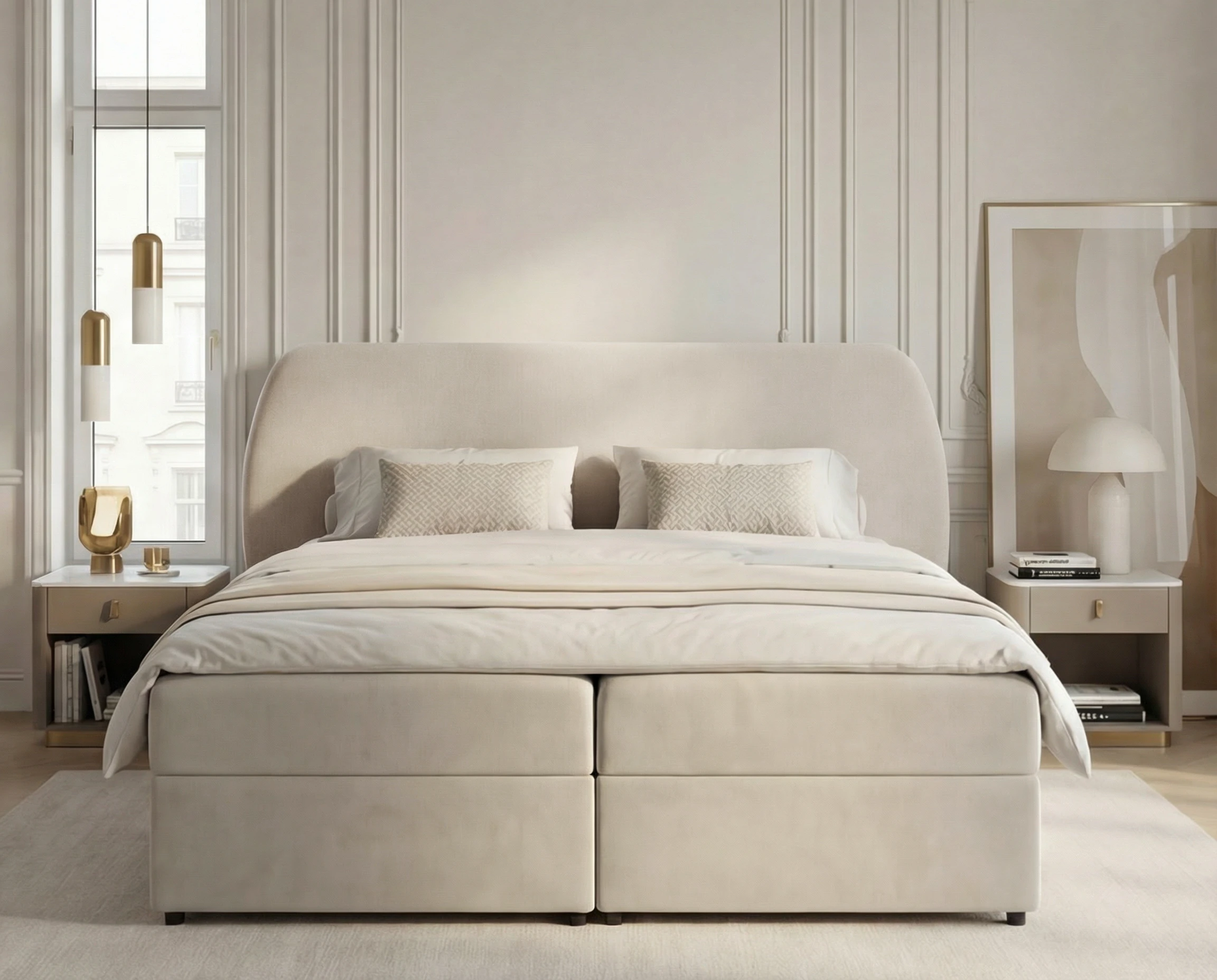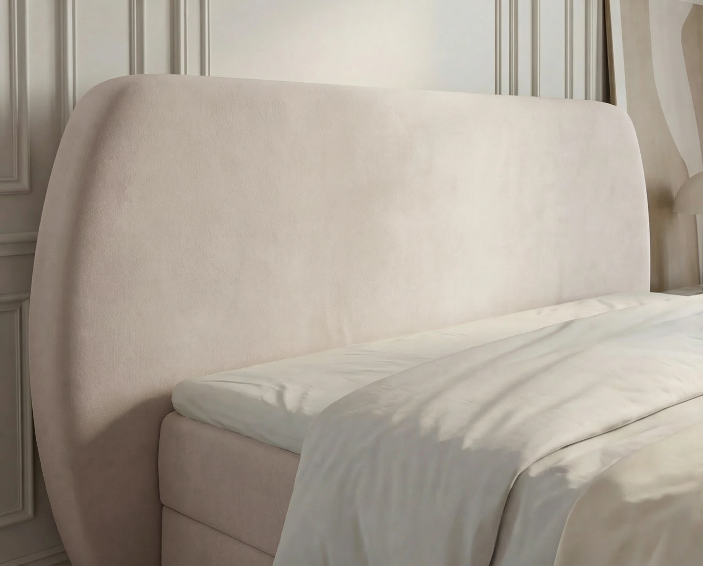 Łóżko kontynentalne Bloom to połączenie elegancji, funkcjonalności i najwyższej wygody snu. Model wyróżnia się modnym, obłym kształtem wezgłowia, które nadaje sypialni miękkości i subtelnej, nowoczesnej formy. Zaokrąglona linia zagłówka doskonale wpisuje się w aktualne trendy wnętrzarskie, tworząc przytulną, a jednocześnie stylową przestrzeń do wypoczynku.