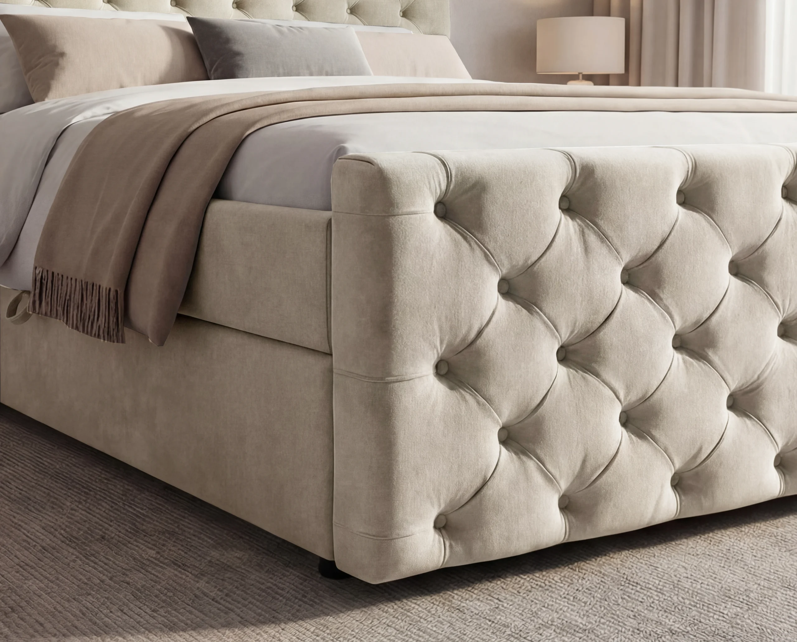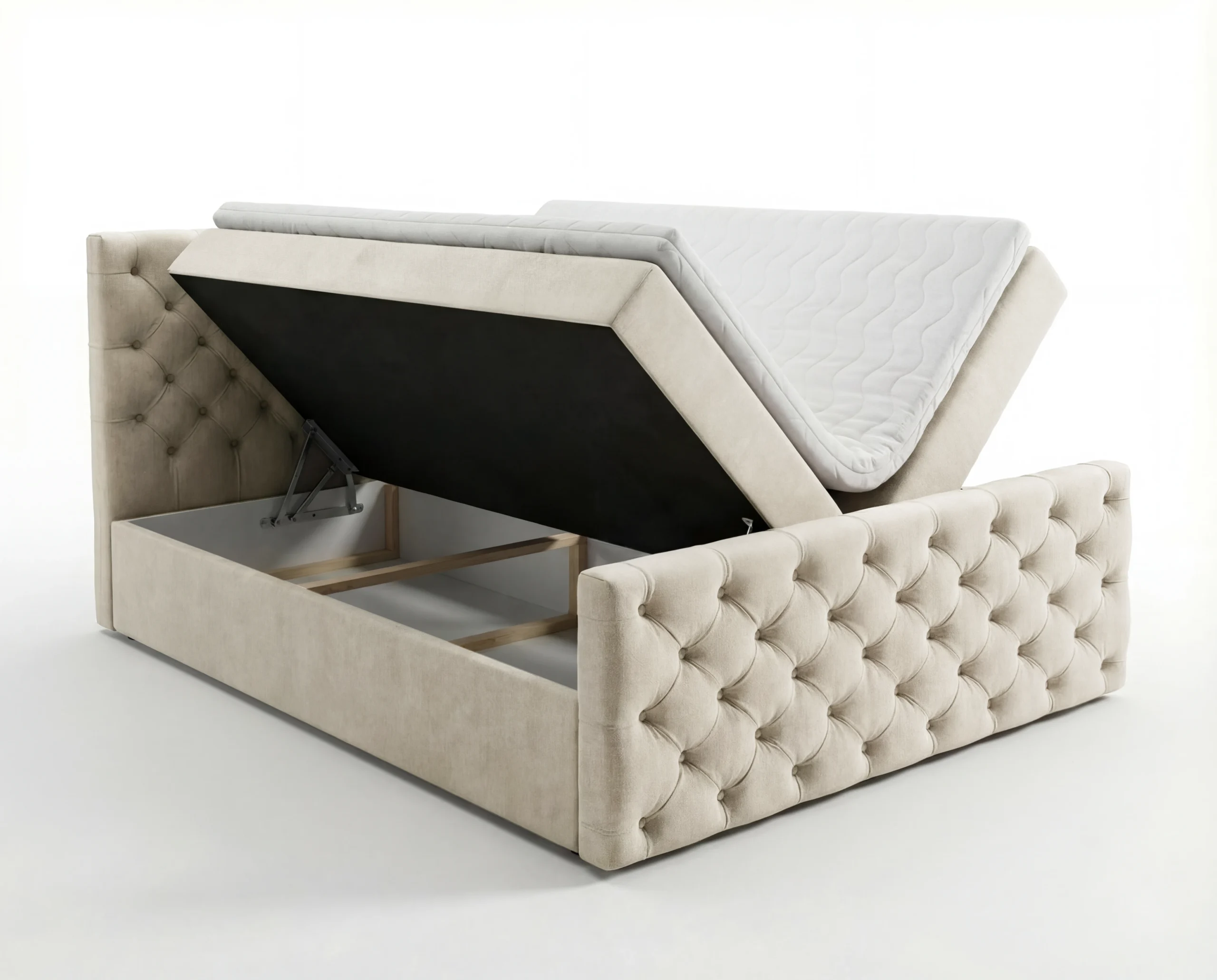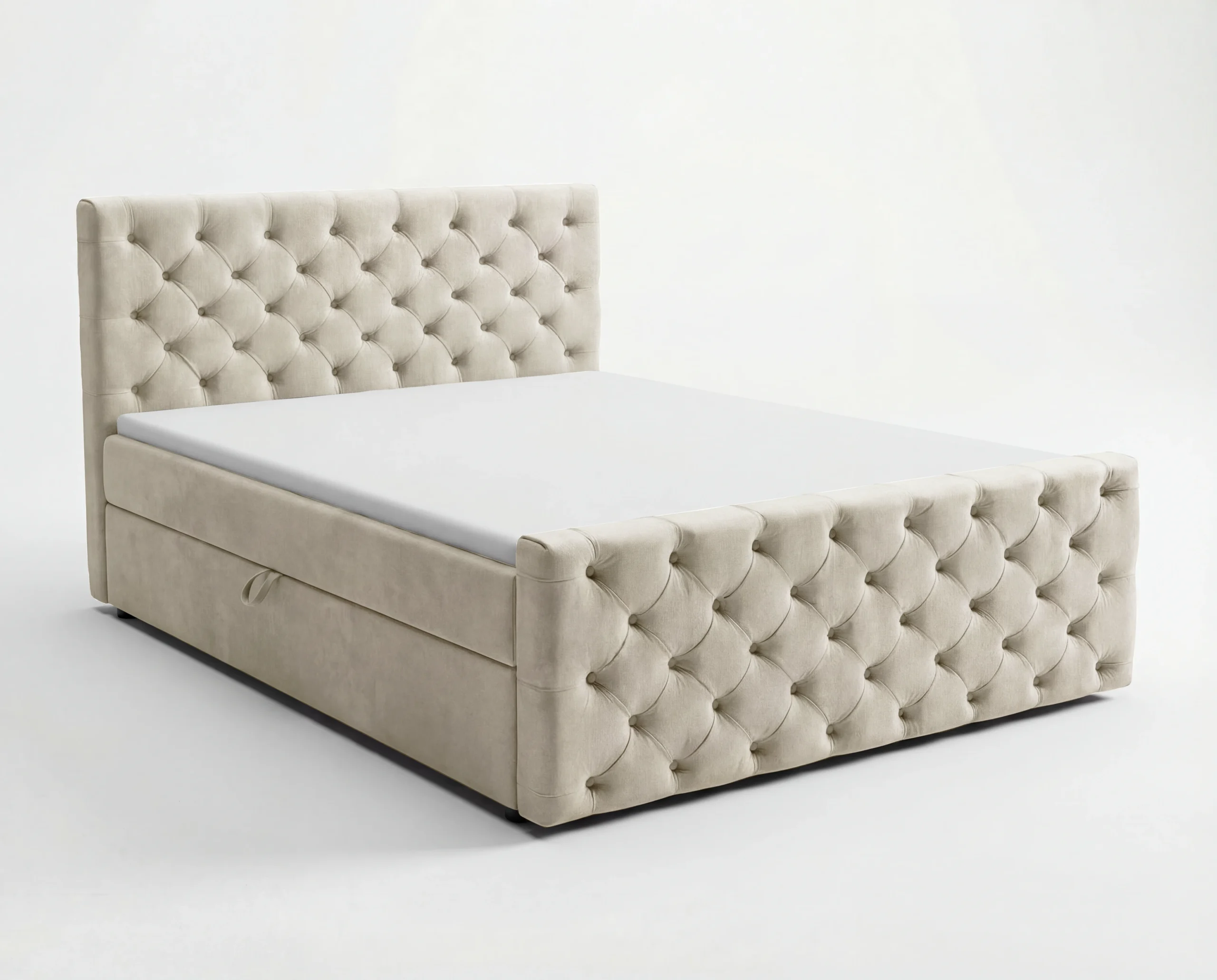 Zagłówek oraz przód łóżka zostały wykonane w eleganckim stylu Chesterfield, z efektownym, głębokim pikowaniem i dekoracyjnymi guzikami. Każdy detal podkreśla staranność wykonania i dbałość o estetykę.