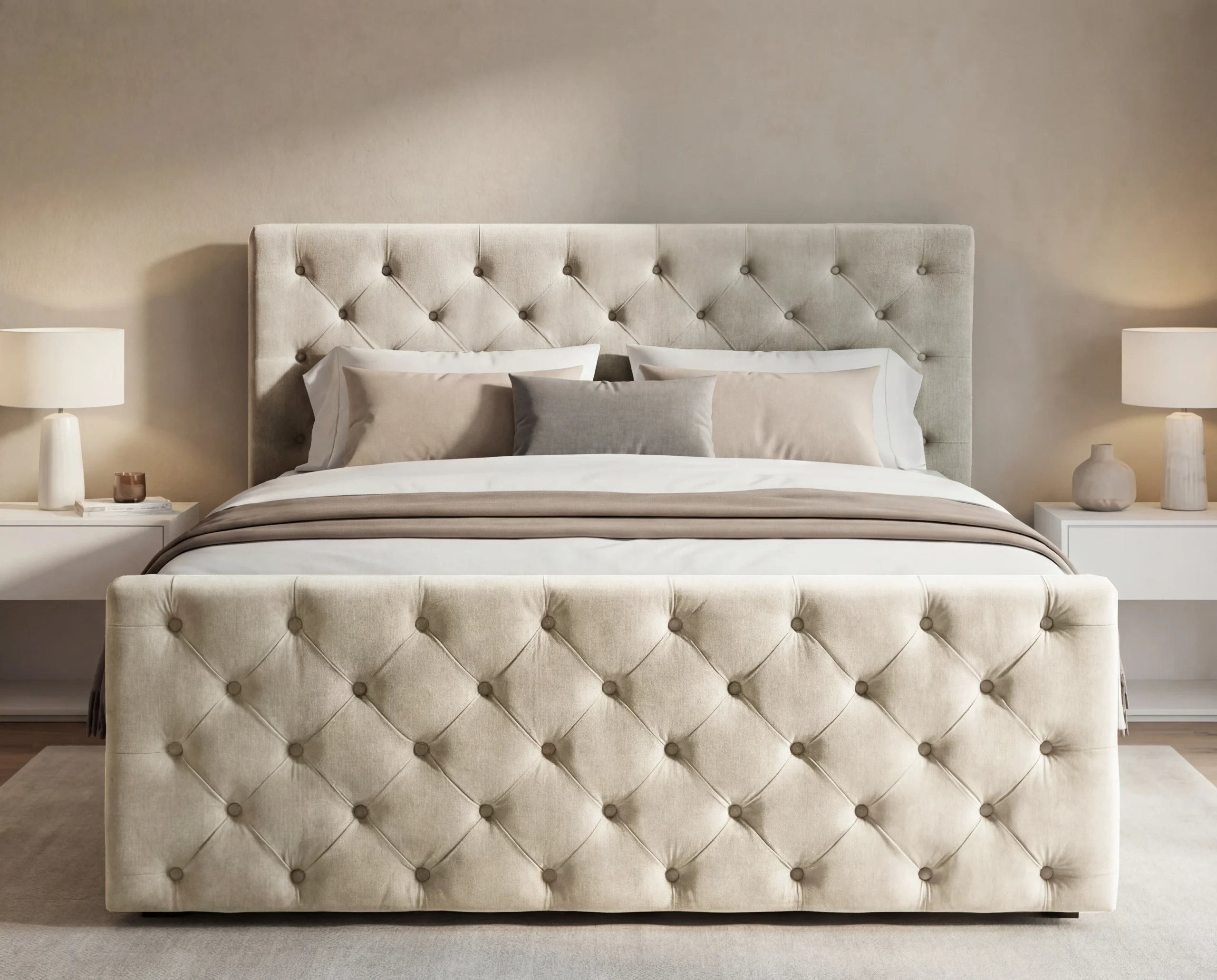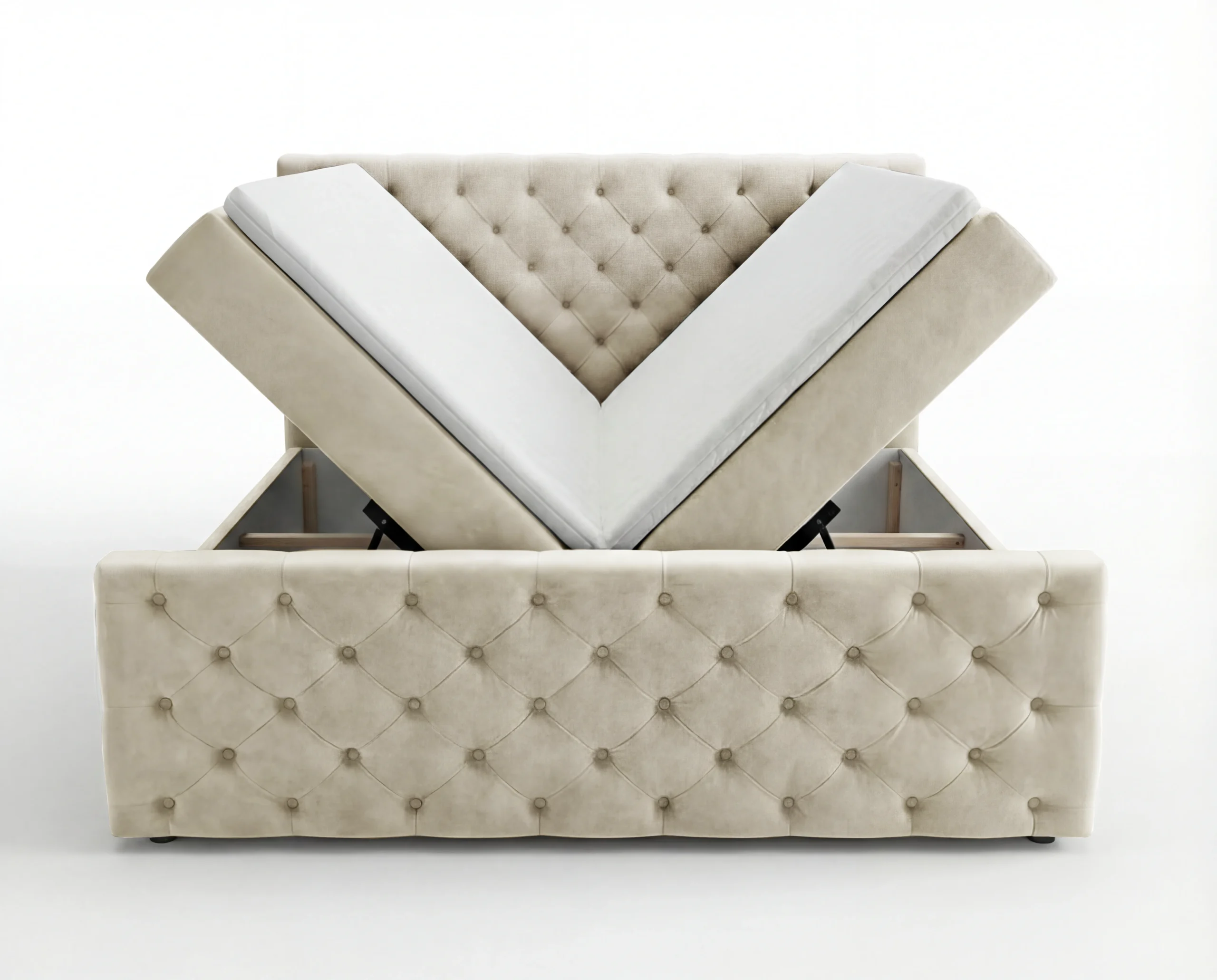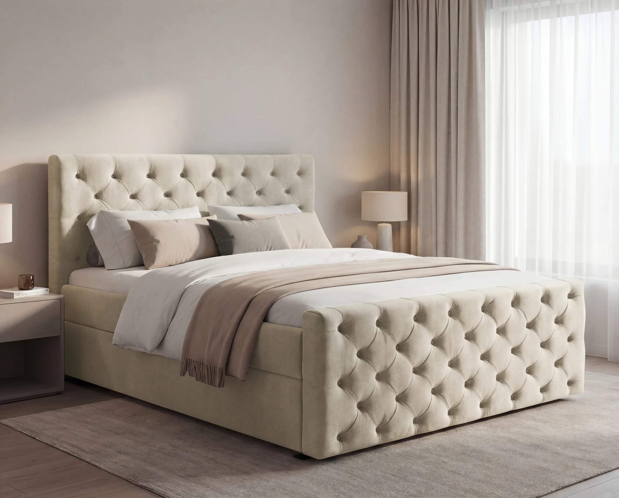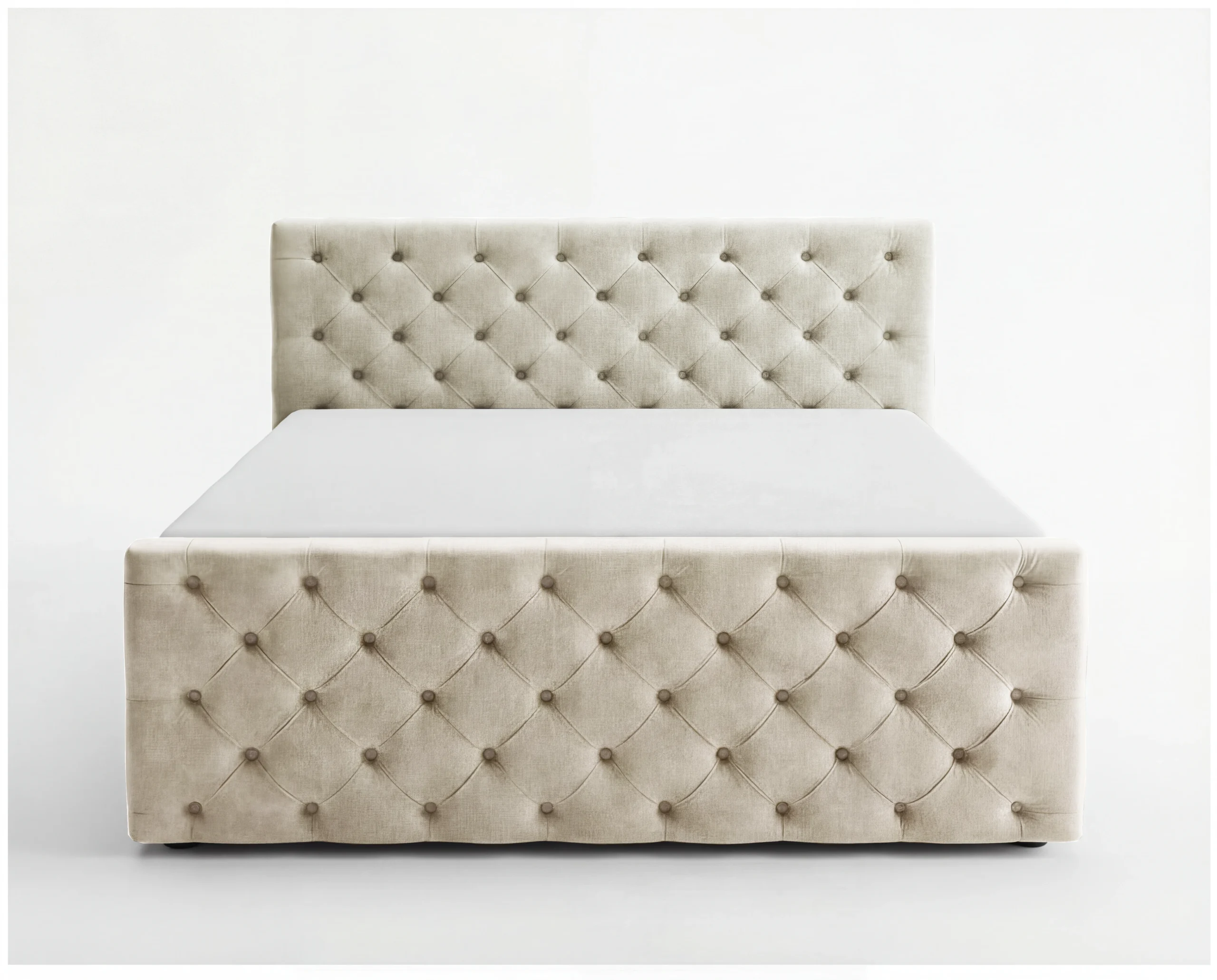 Zagłówek oraz przód łóżka zostały wykonane w eleganckim stylu Chesterfield, z efektownym, głębokim pikowaniem i dekoracyjnymi guzikami. Każdy detal podkreśla staranność wykonania i dbałość o estetykę.