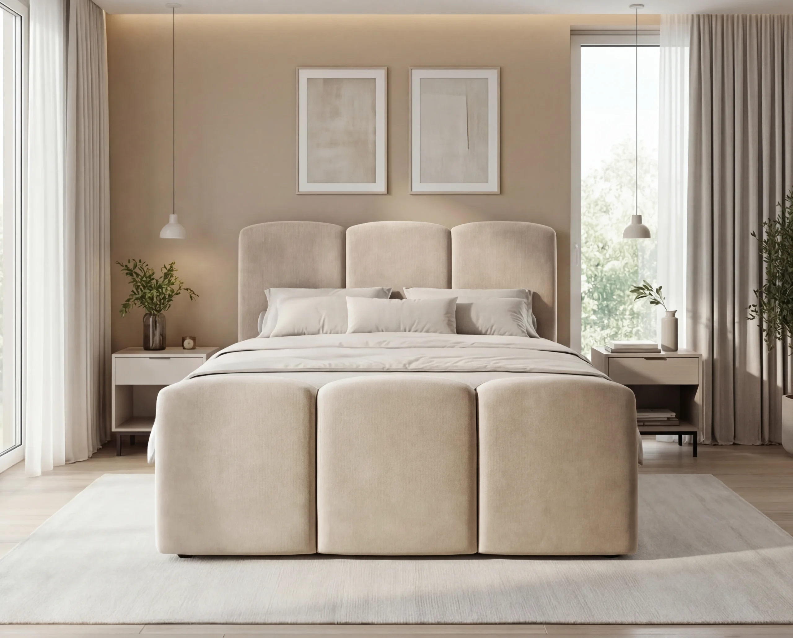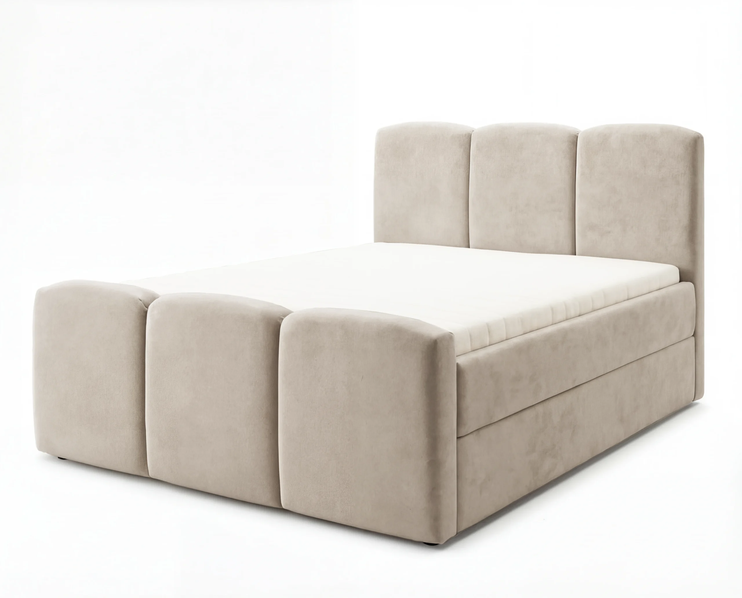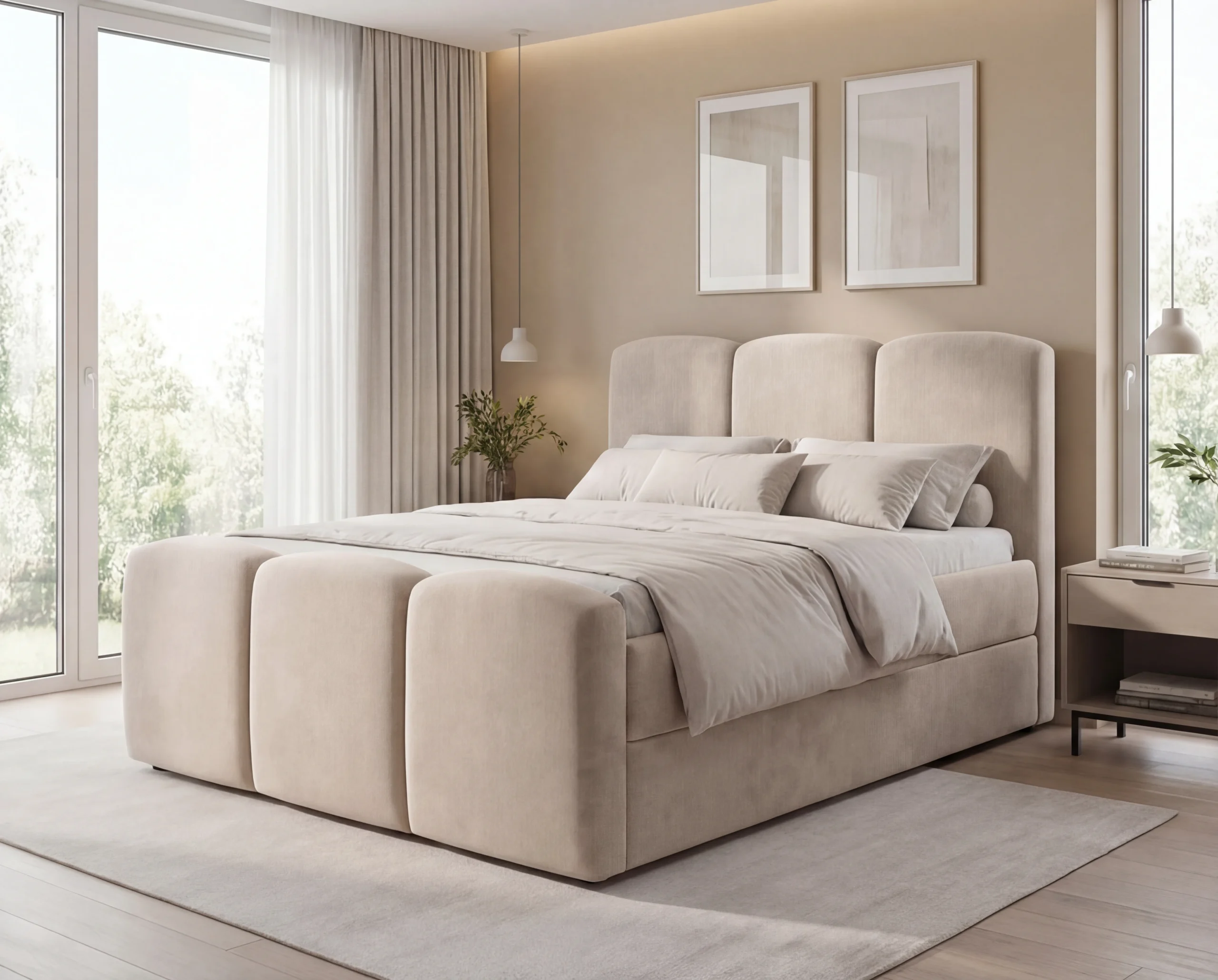 Nowoczesne łóżko kontynentalne to idealne połączenie elegancji, wygody i funkcjonalności. Model wyróżnia się masywną, miękką bryłą oraz efektownym zagłówkiem z pionowymi głębokimi wciągami, które nadają wnętrzu luksusowego charakteru. To doskonały wybór do sypialni w stylu nowoczesnym, glamour lub minimalistycznym.