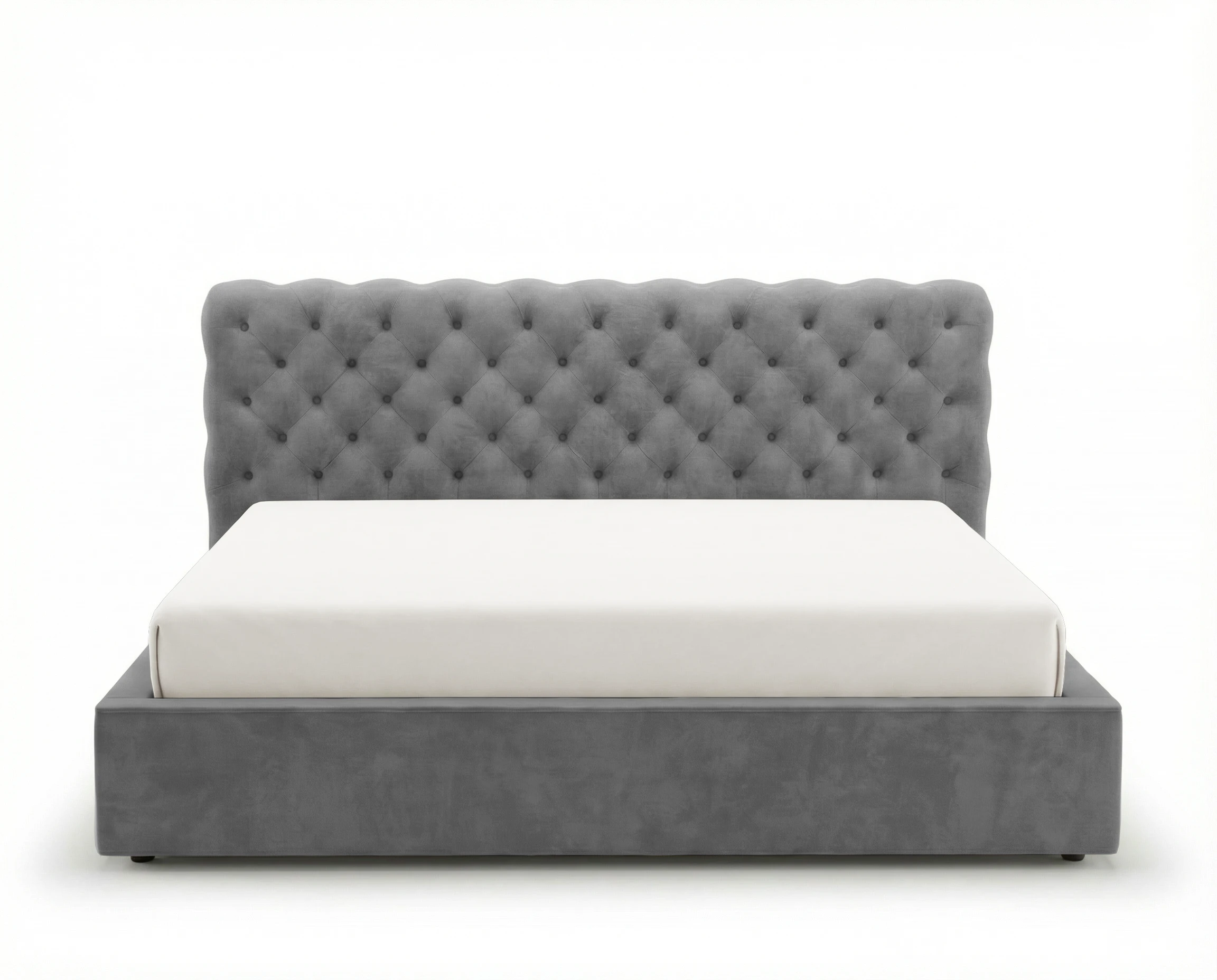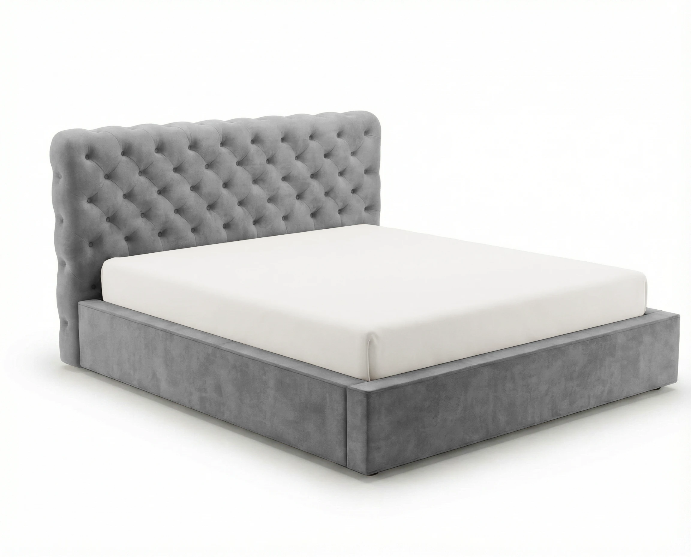 Wysokie, miękkie wezgłowie zostało starannie pikowane i ozdobione guzikami, tworząc charakterystyczny efekt głębokiego tłoczenia. Boczne elementy oraz przód łóżka wykończone są subtelną, elegancką lamówką ozdobną, która podkreśla wyjątkowy charakter mebla i dbałość o detale.