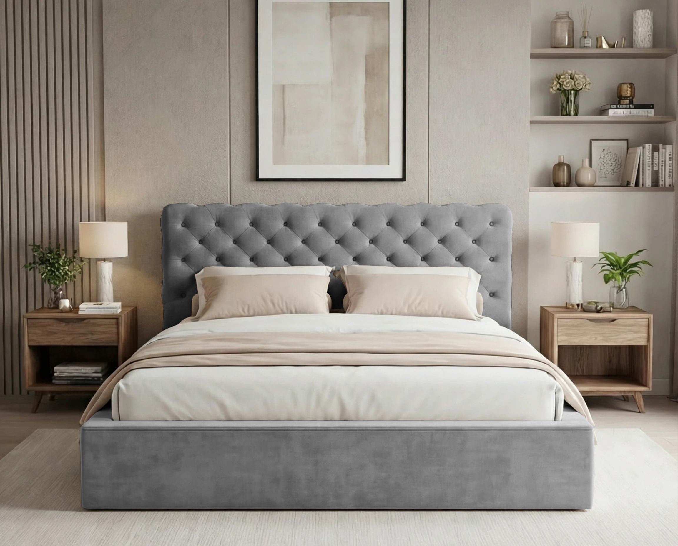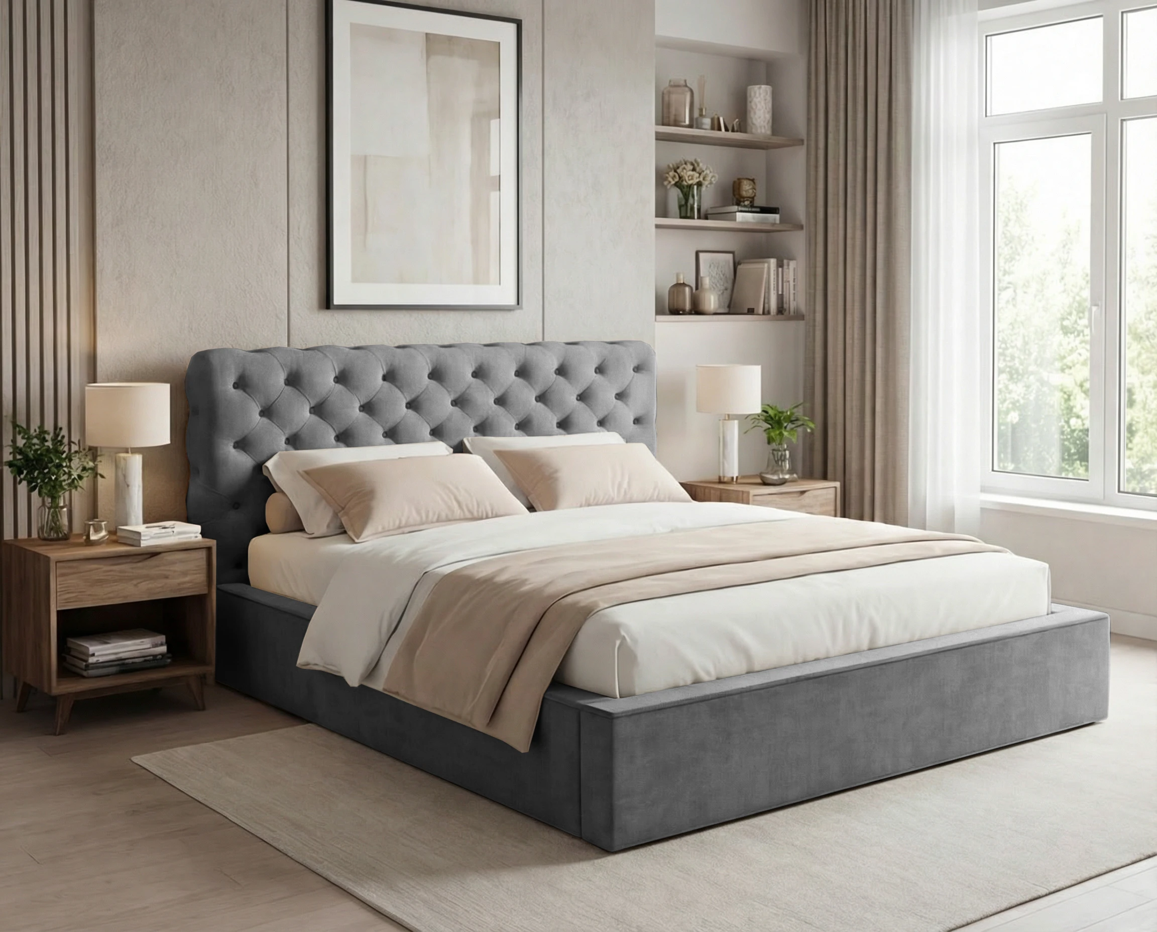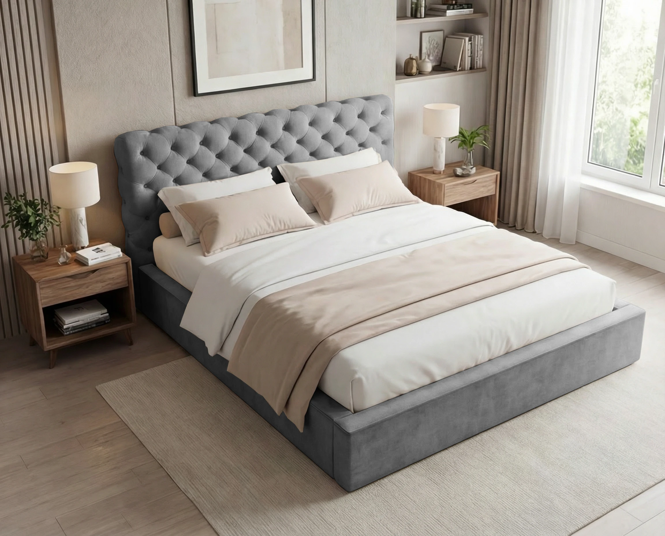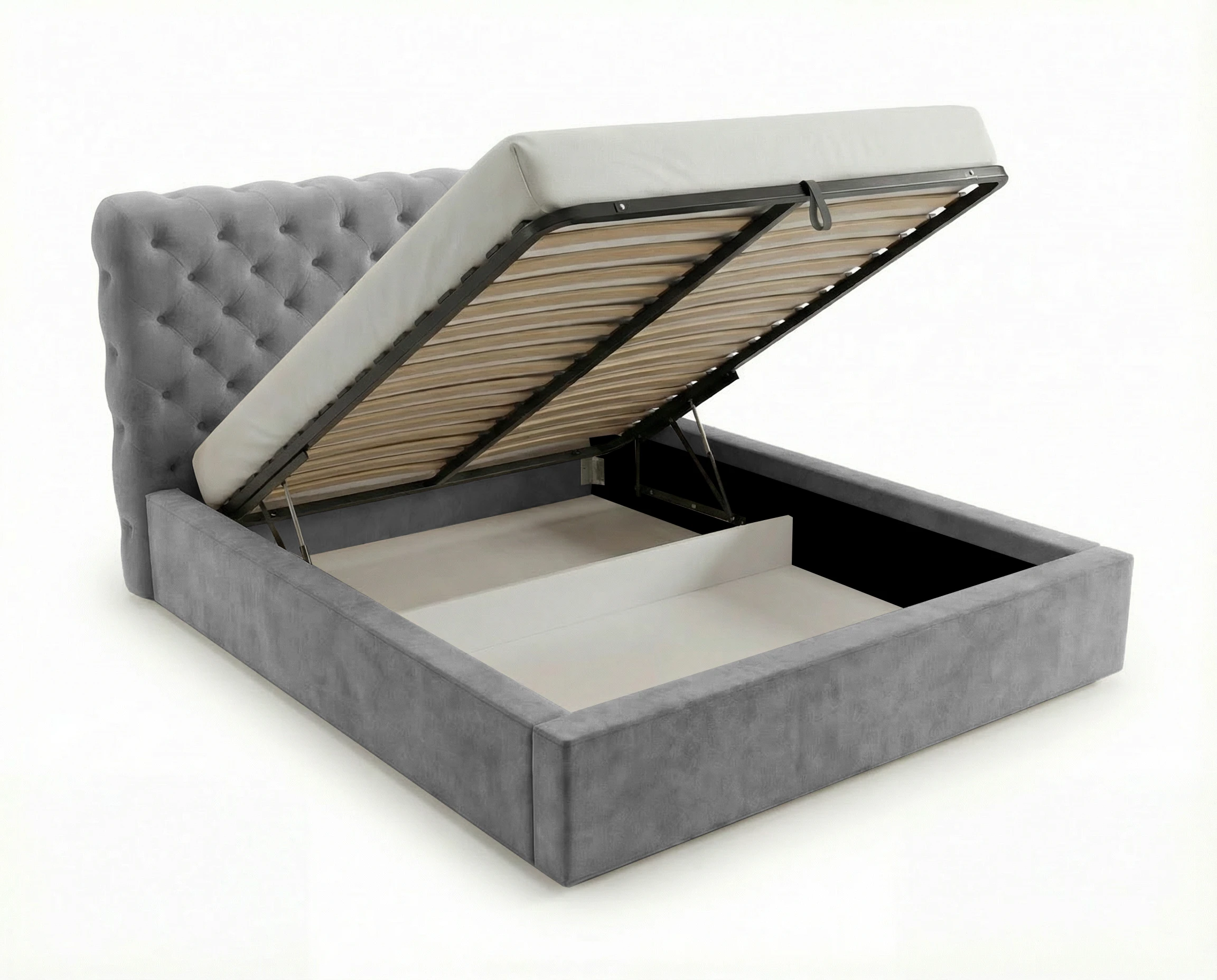 Łóżko tapicerowane z pojemnikiem i stelażem metalowym Apollo – pikowane w stylu chesterfield