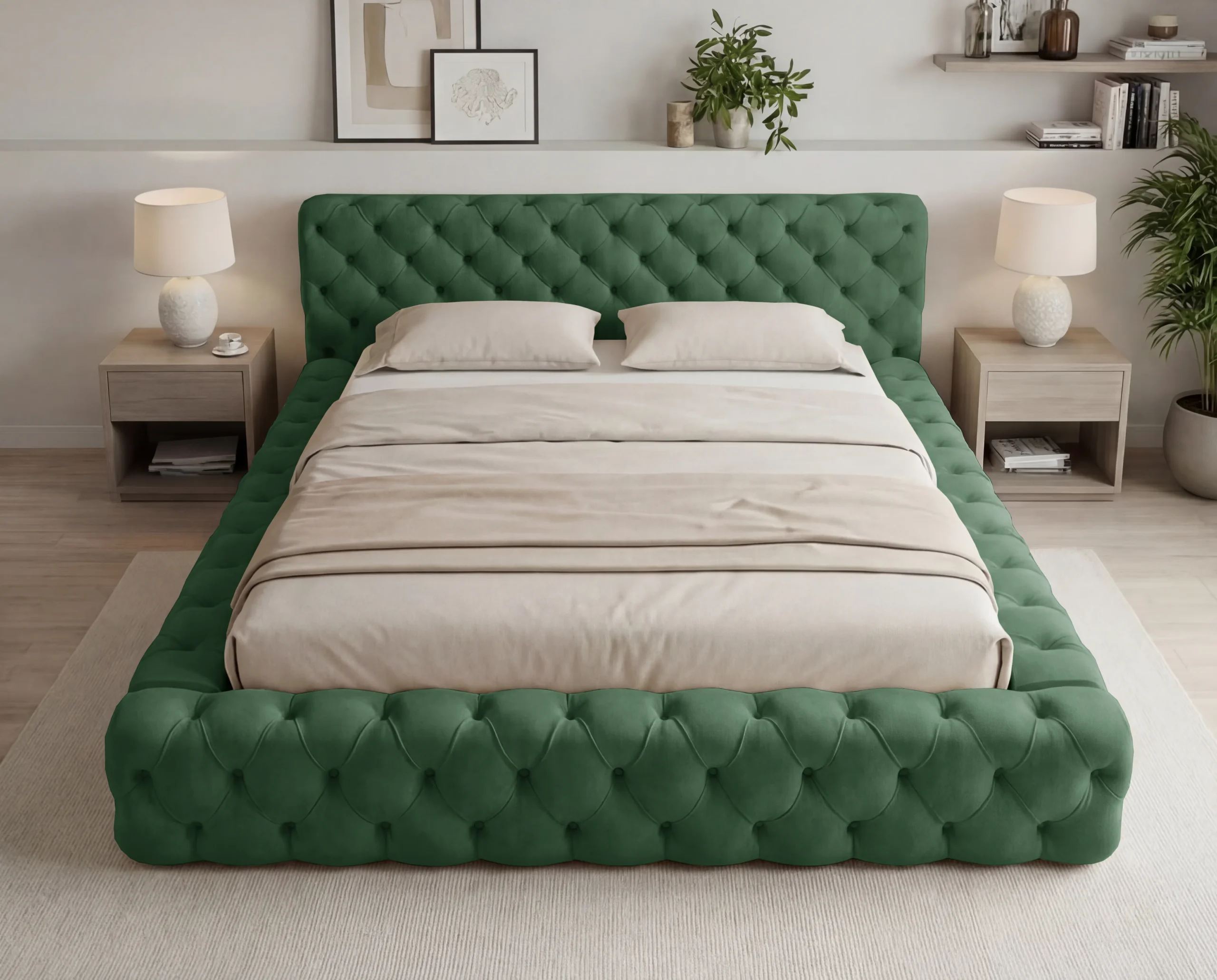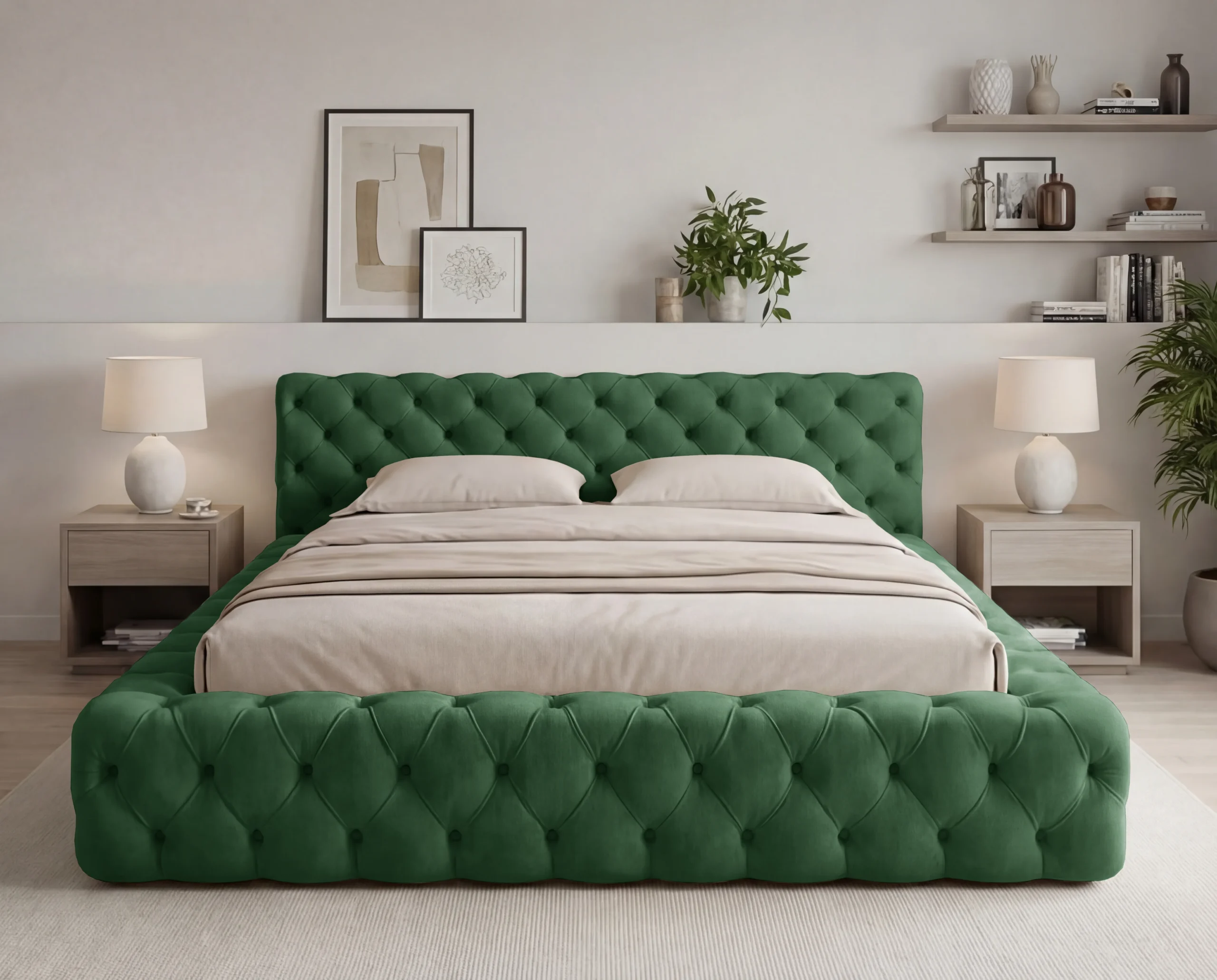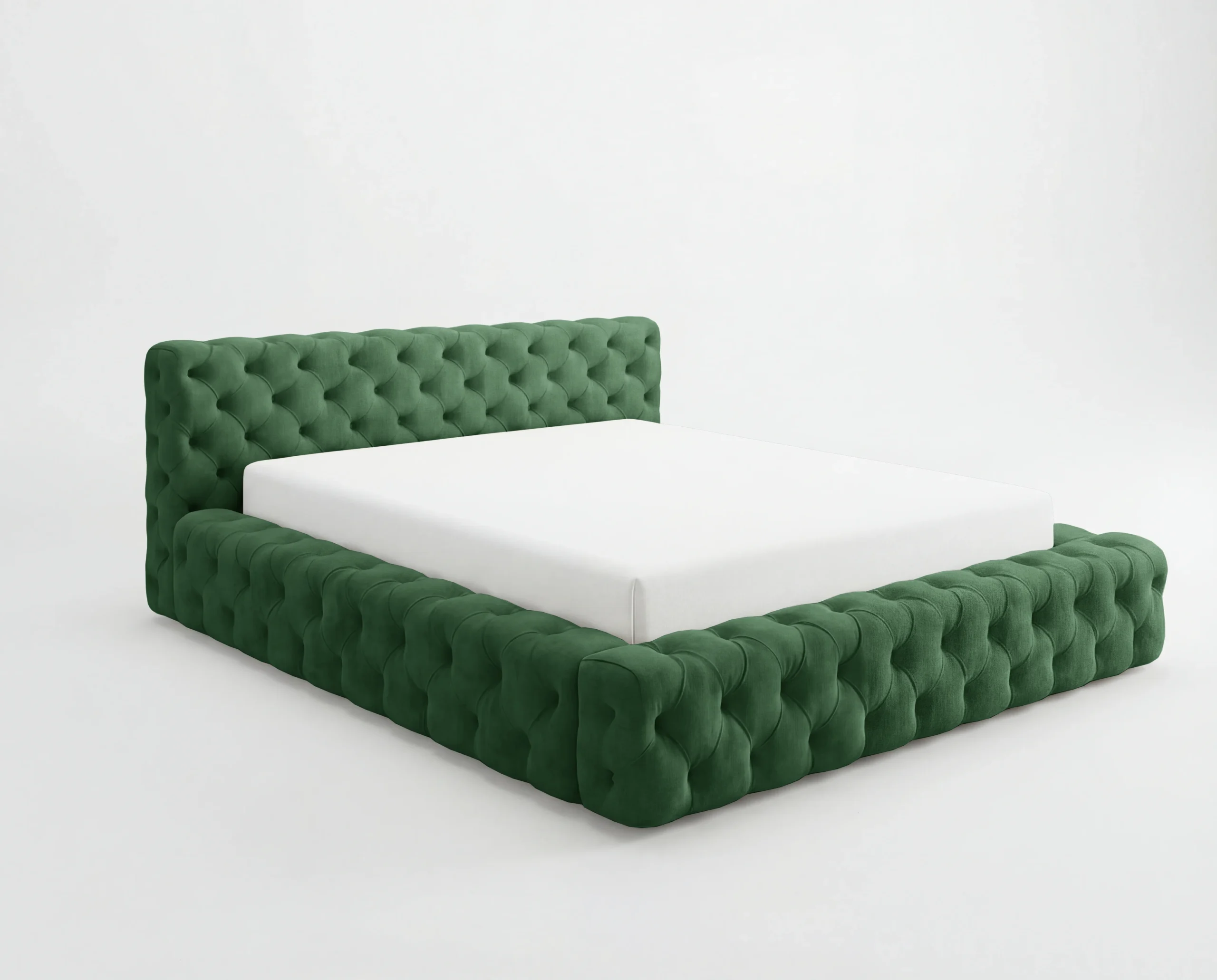 Łóżko Winston to masywne, eleganckie łóżko tapicerowane w stylu chesterfield, wykonane w luksusowej tkaninie Magic Velvet. Głębokie pikowania na zagłówku i całej ramie nadają mu prestiżowy, ponadczasowy charakter, idealny do sypialni glamour i modern classic.
