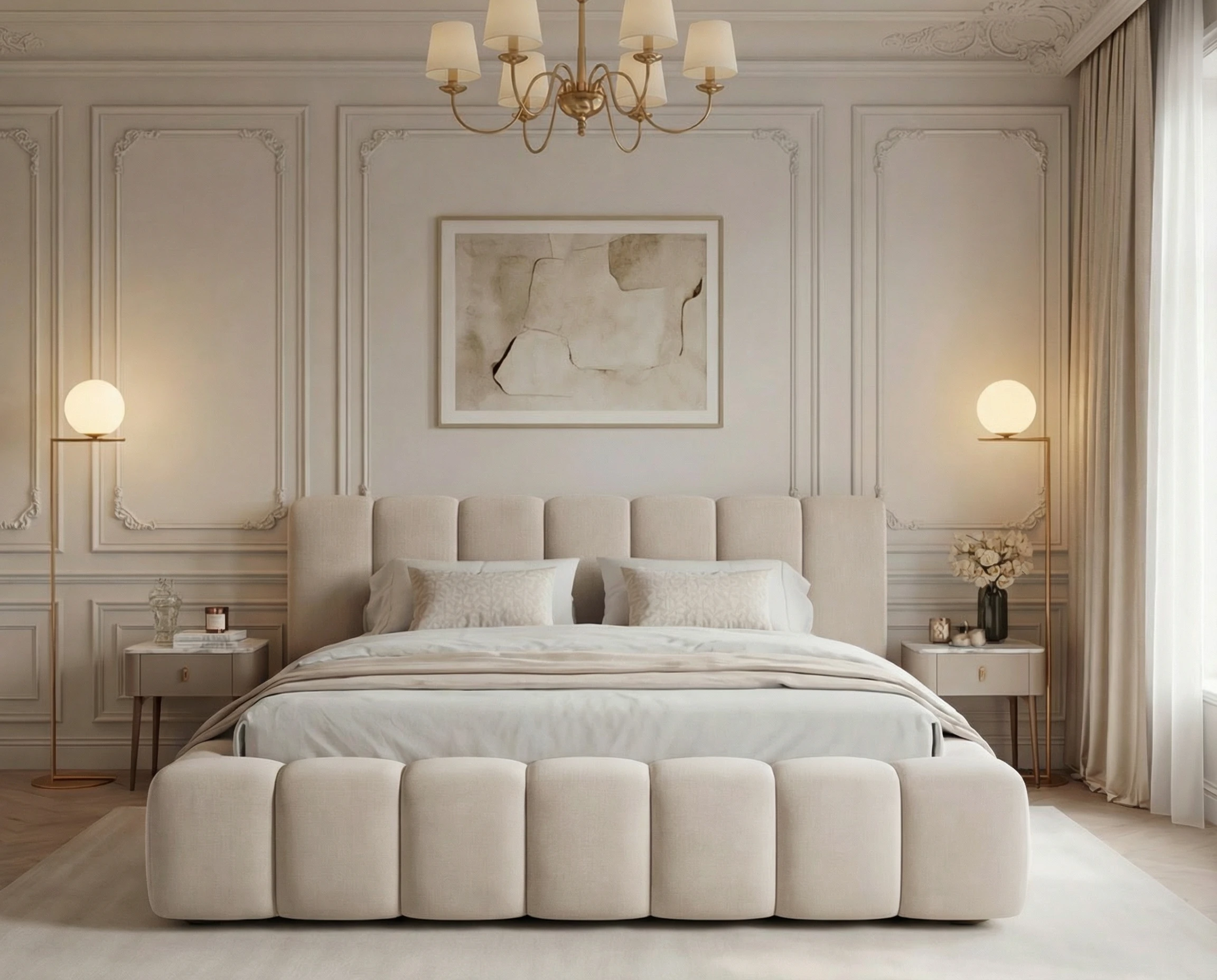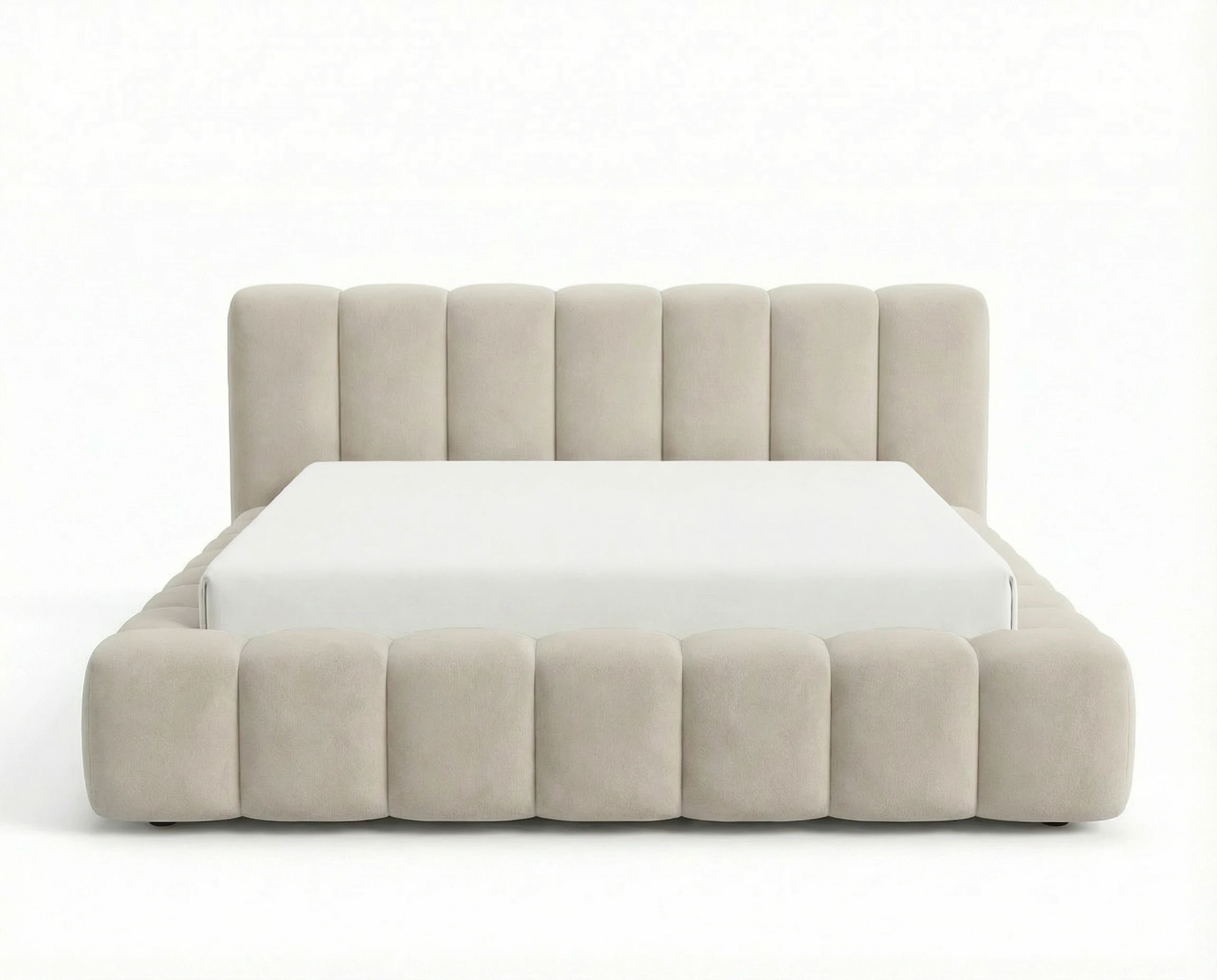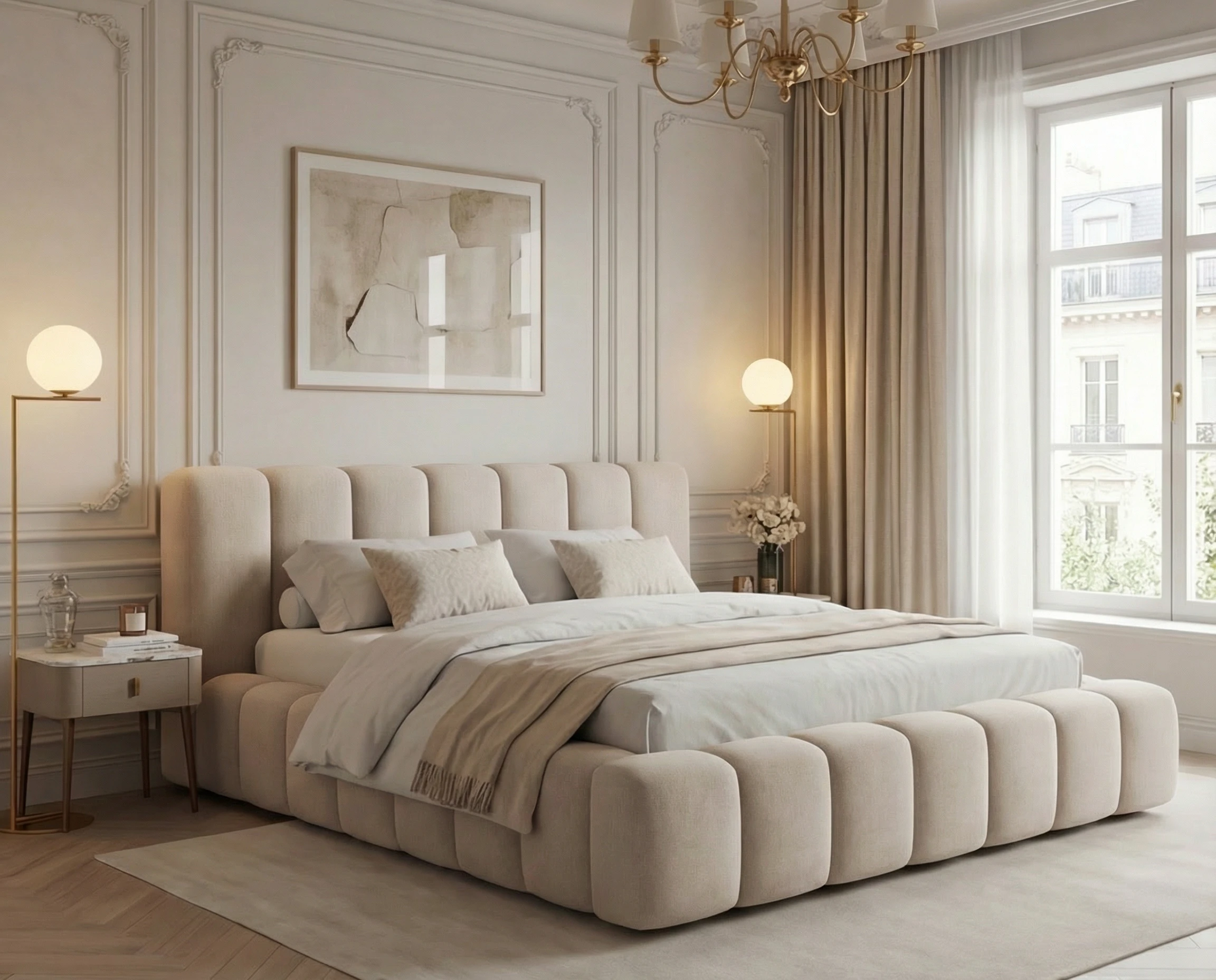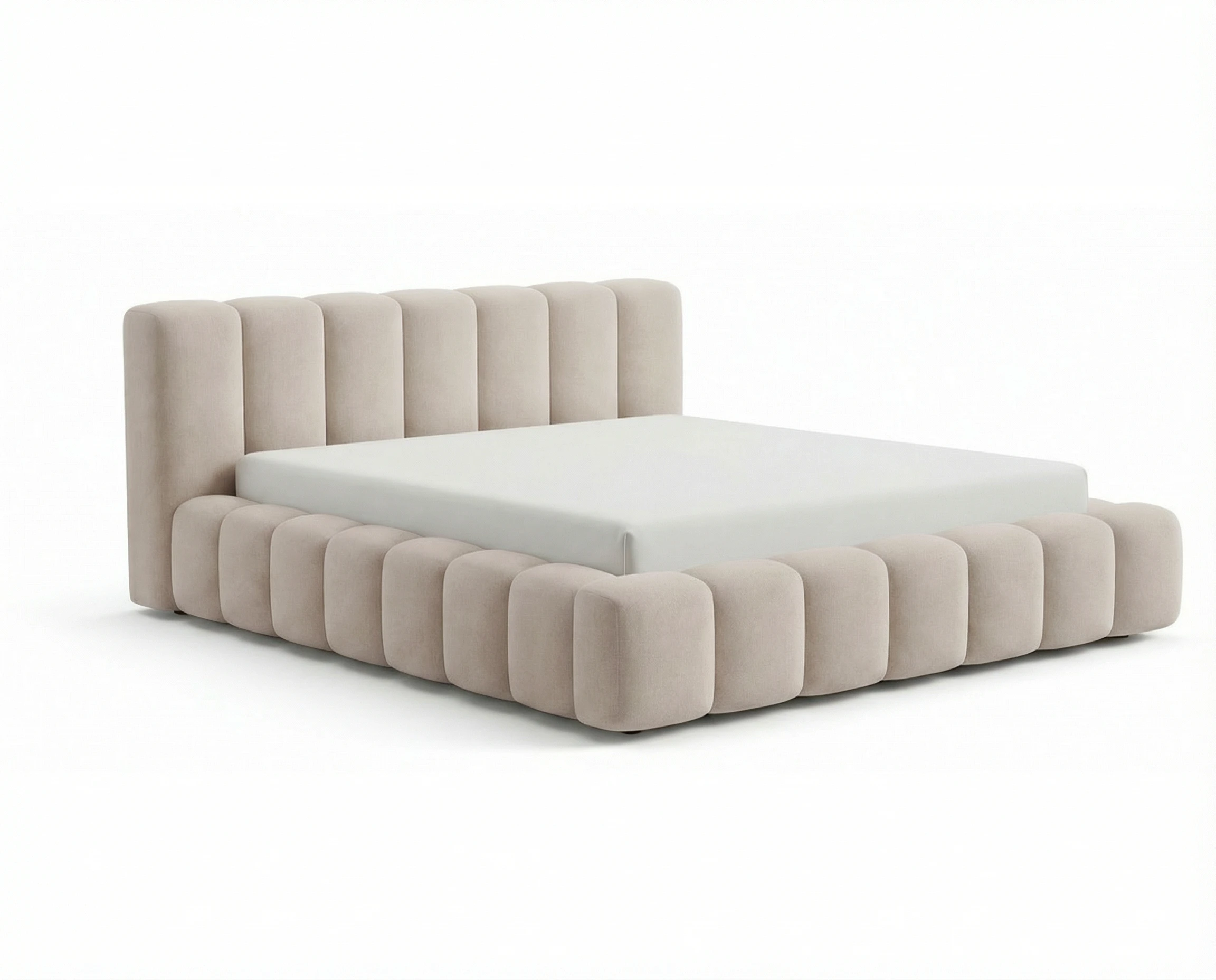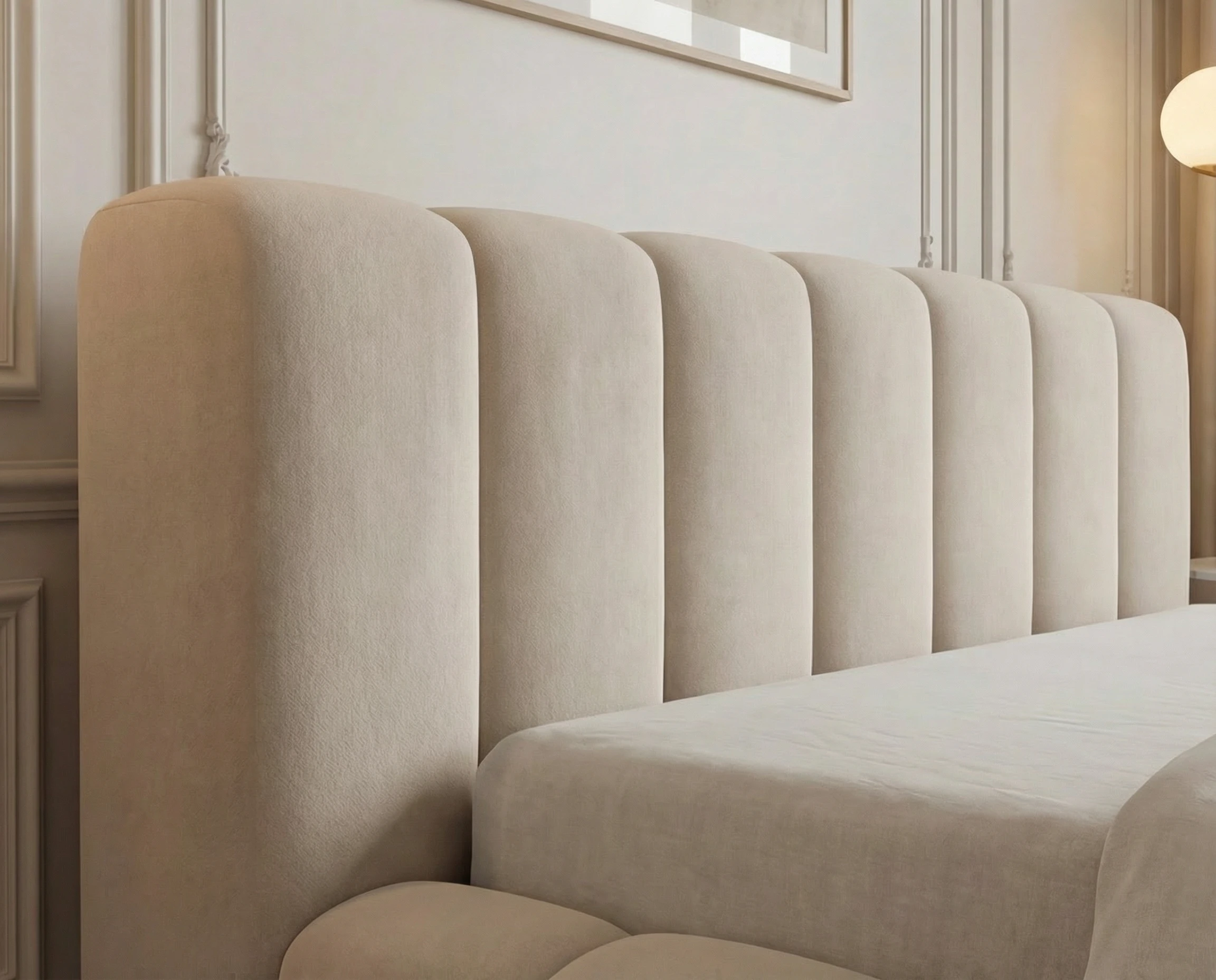 Najbardziej wyróżniającym elementem modelu są głębokie pionowe wciągi, które zdobią zarówno zagłówek, jak i ramę łóżka. Ten efektowny detal nadaje całości nowoczesnego, a zarazem luksusowego wyglądu, wprowadzając do wnętrza przytulną i elegancką atmosferę.
