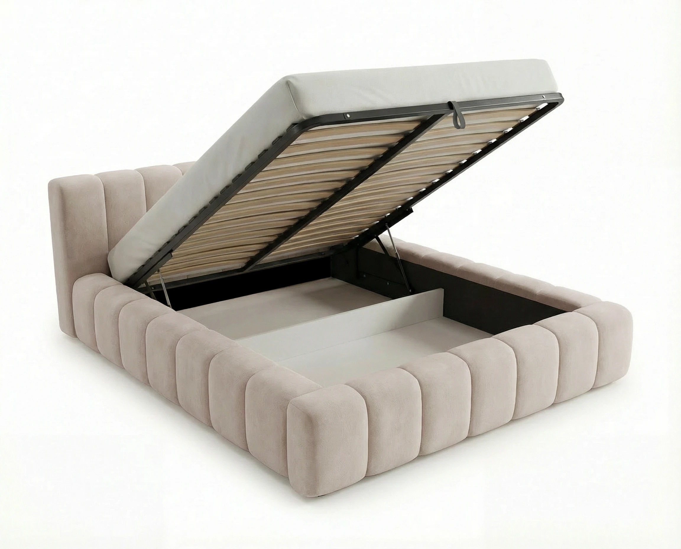 Łóżko Bergamo zostało zaprojektowane z myślą o codziennym komforcie użytkowania. Wyposażone jest w solidny metalowy stelaż podnoszony na automacie hydraulicznym, który umożliwia łatwy i wygodny dostęp do pojemnika na pościel. Mechanizm działa płynnie i bez wysiłku, co sprawia, że przechowywanie staje się wyjątkowo praktyczne.