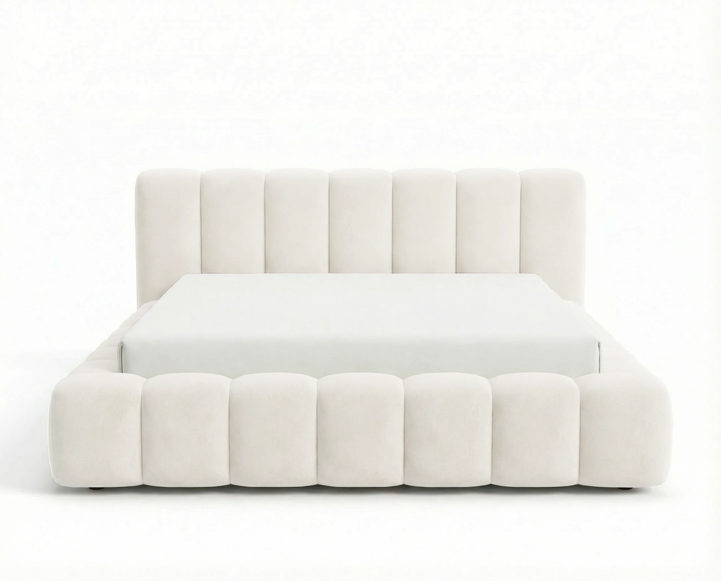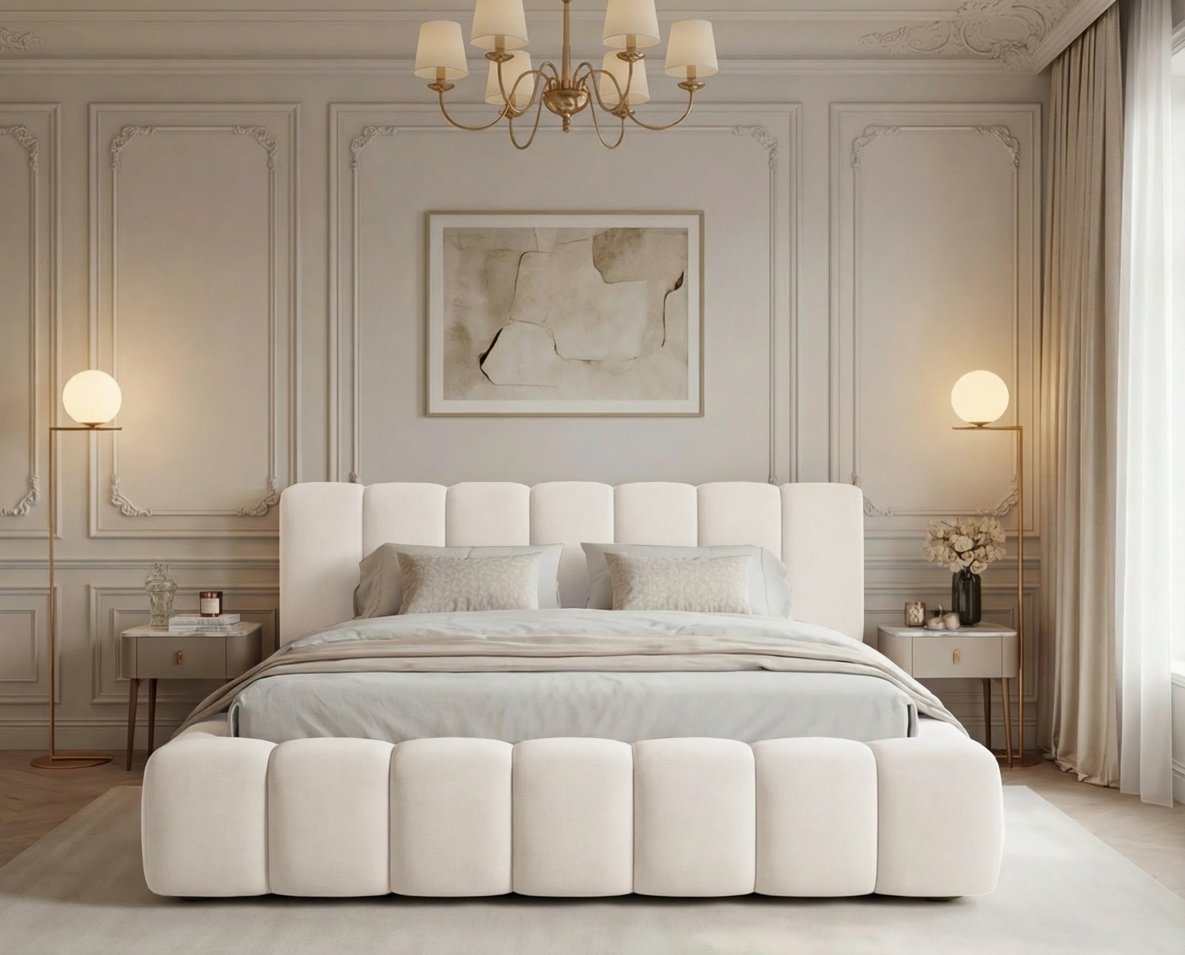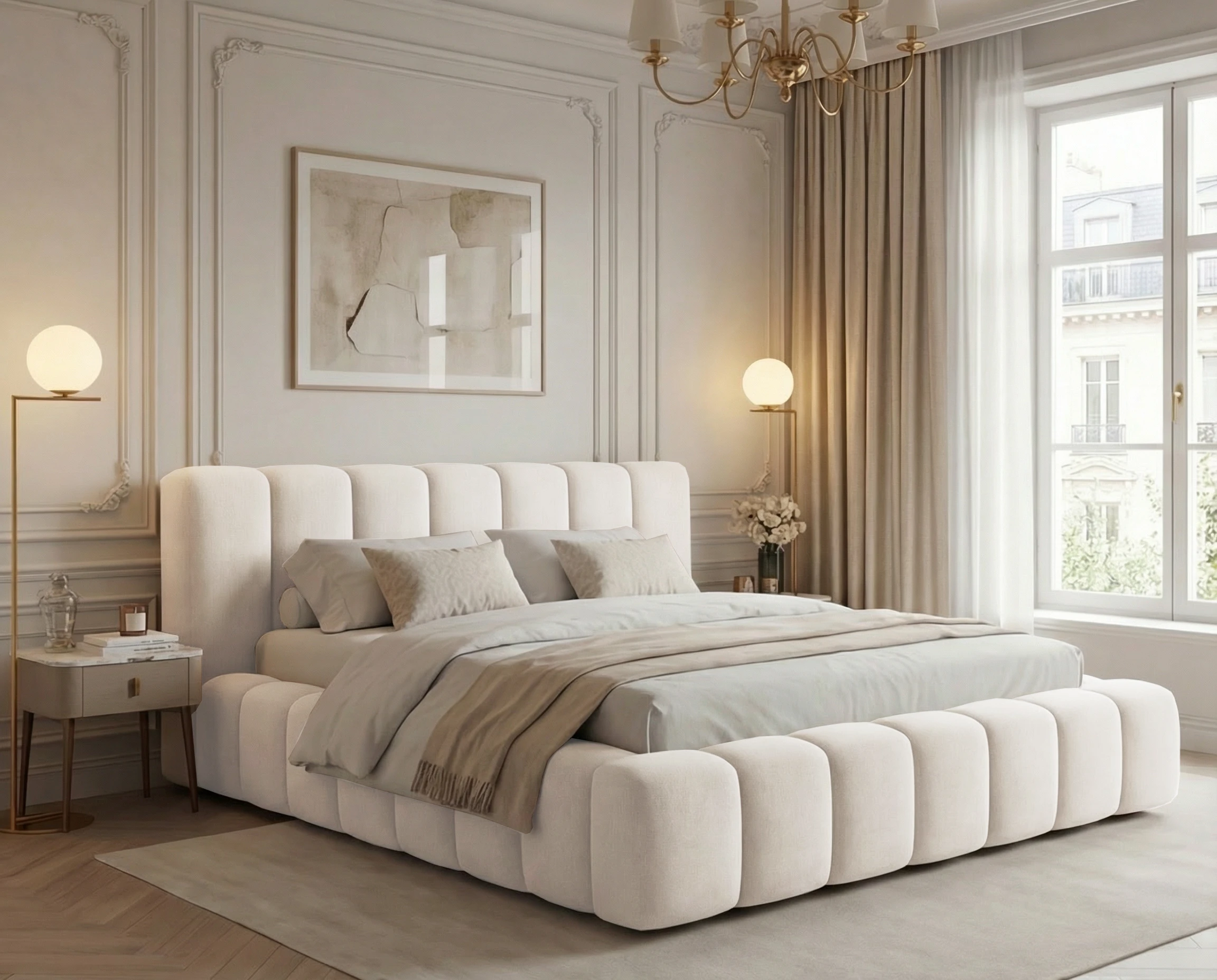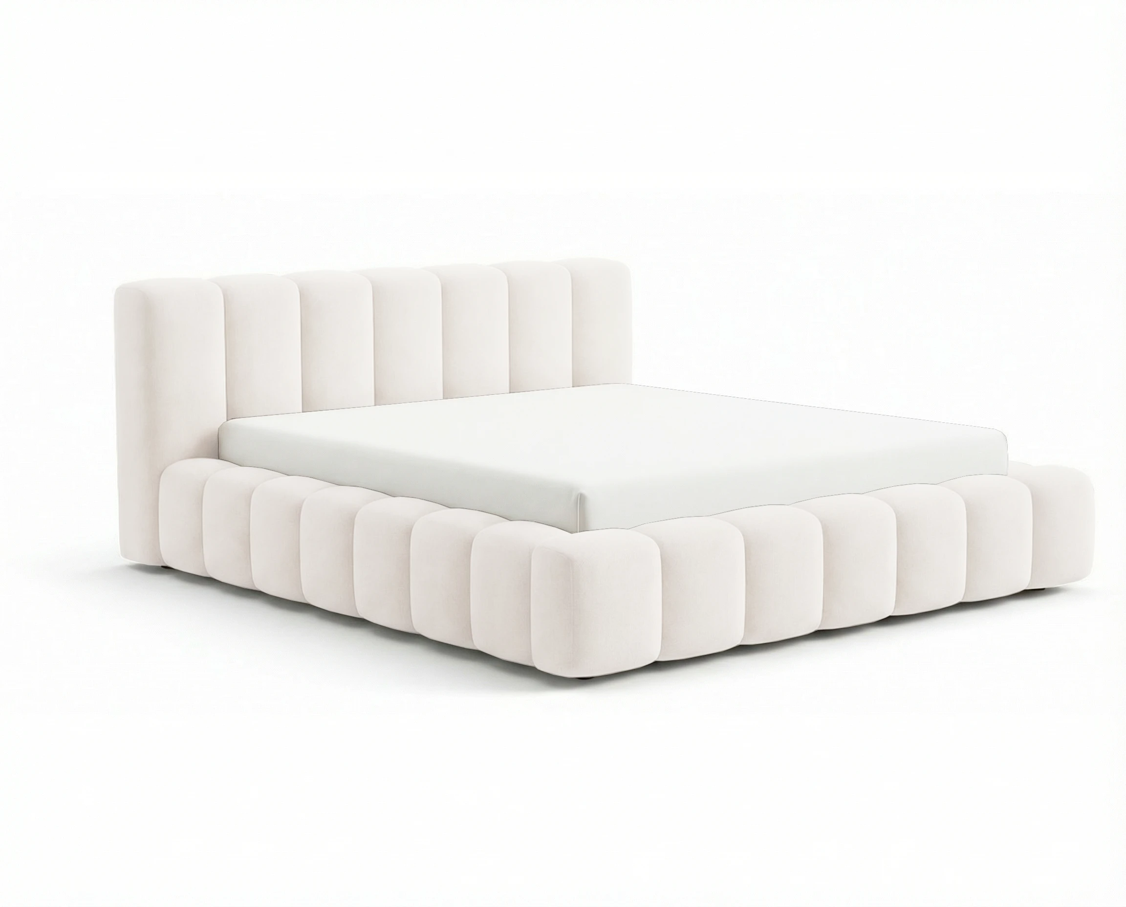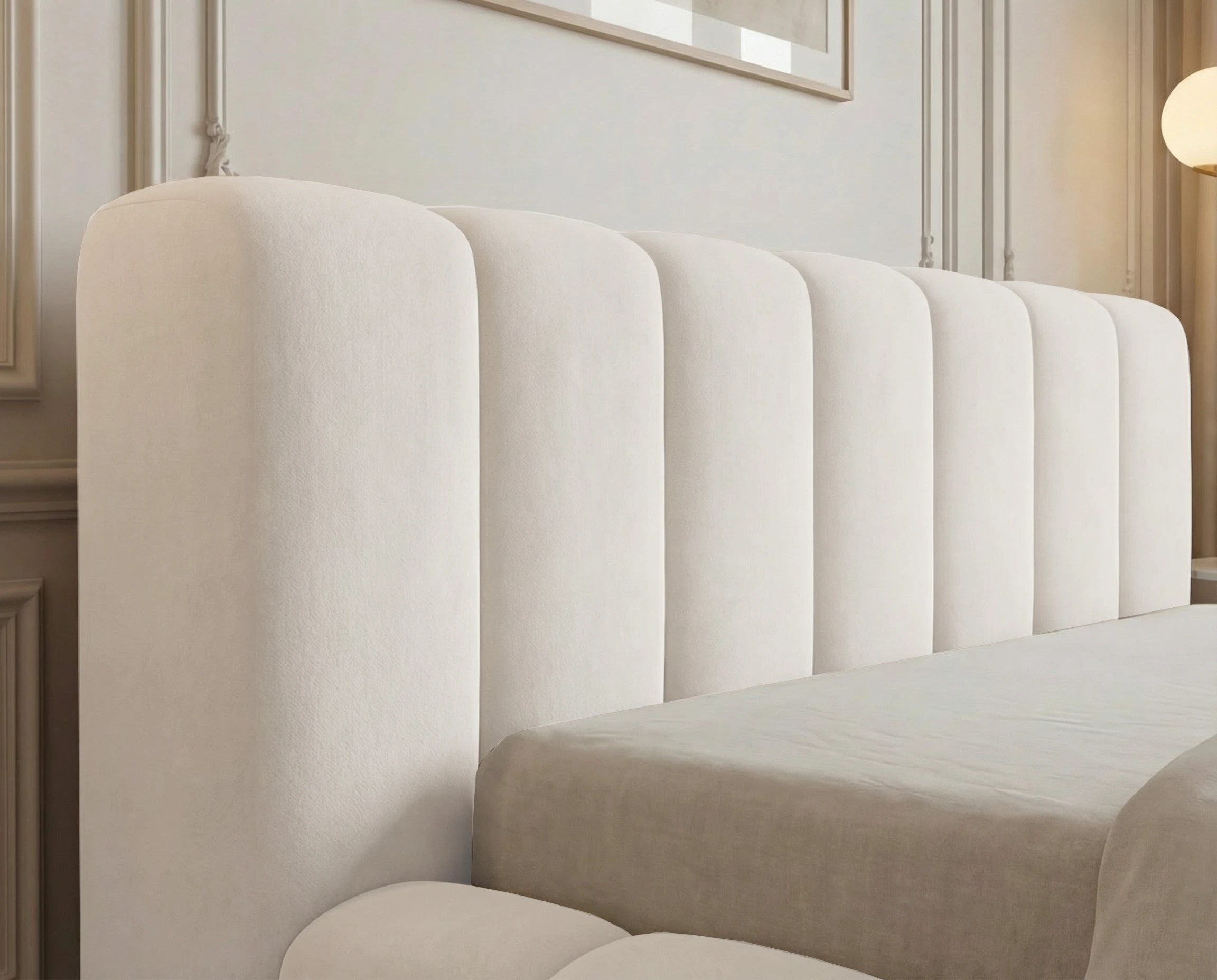 Najbardziej wyróżniającym elementem modelu są głębokie pionowe wciągi, które zdobią zarówno zagłówek, jak i ramę łóżka. Ten efektowny detal nadaje całości nowoczesnego, a zarazem luksusowego wyglądu, wprowadzając do wnętrza przytulną i elegancką atmosferę.