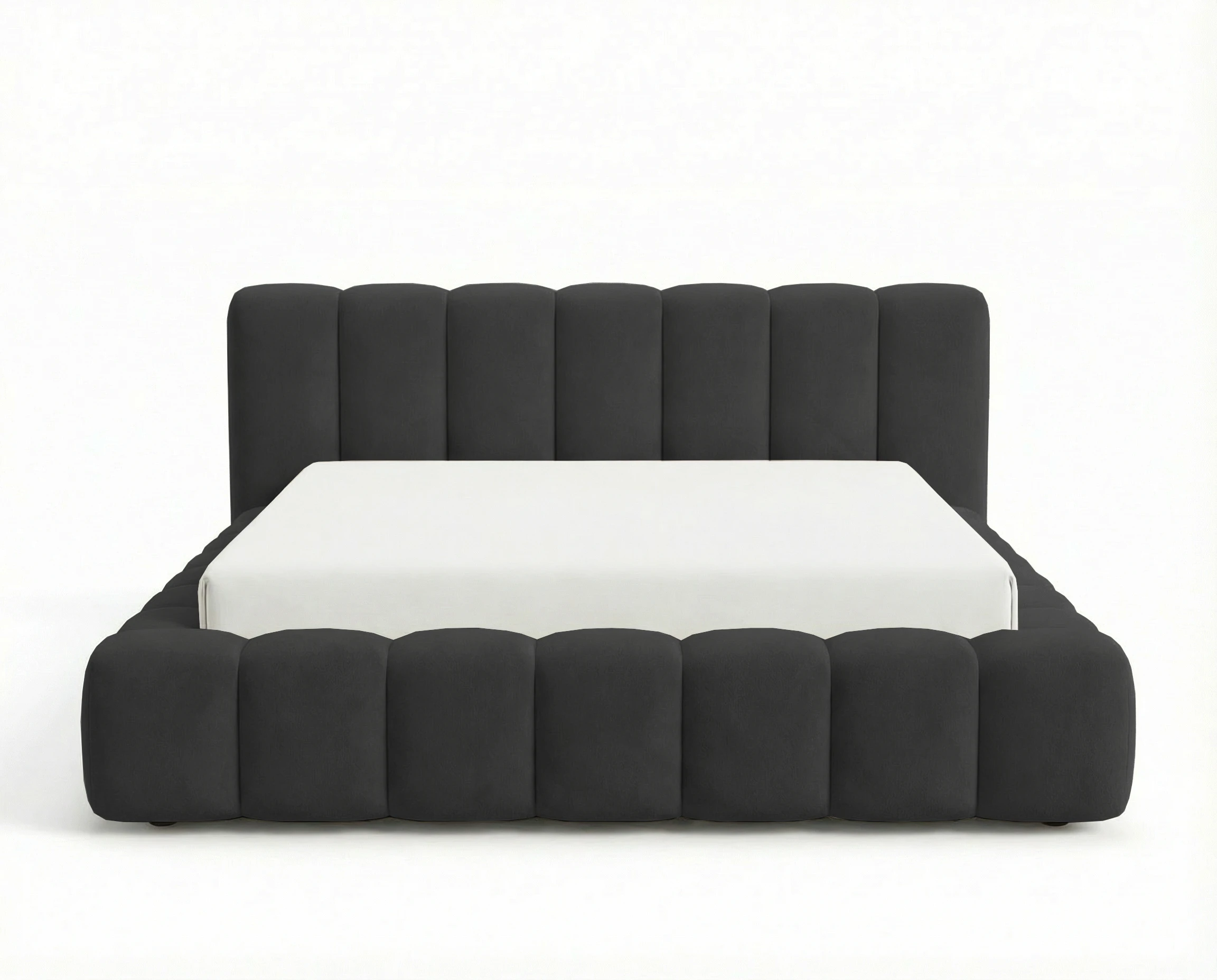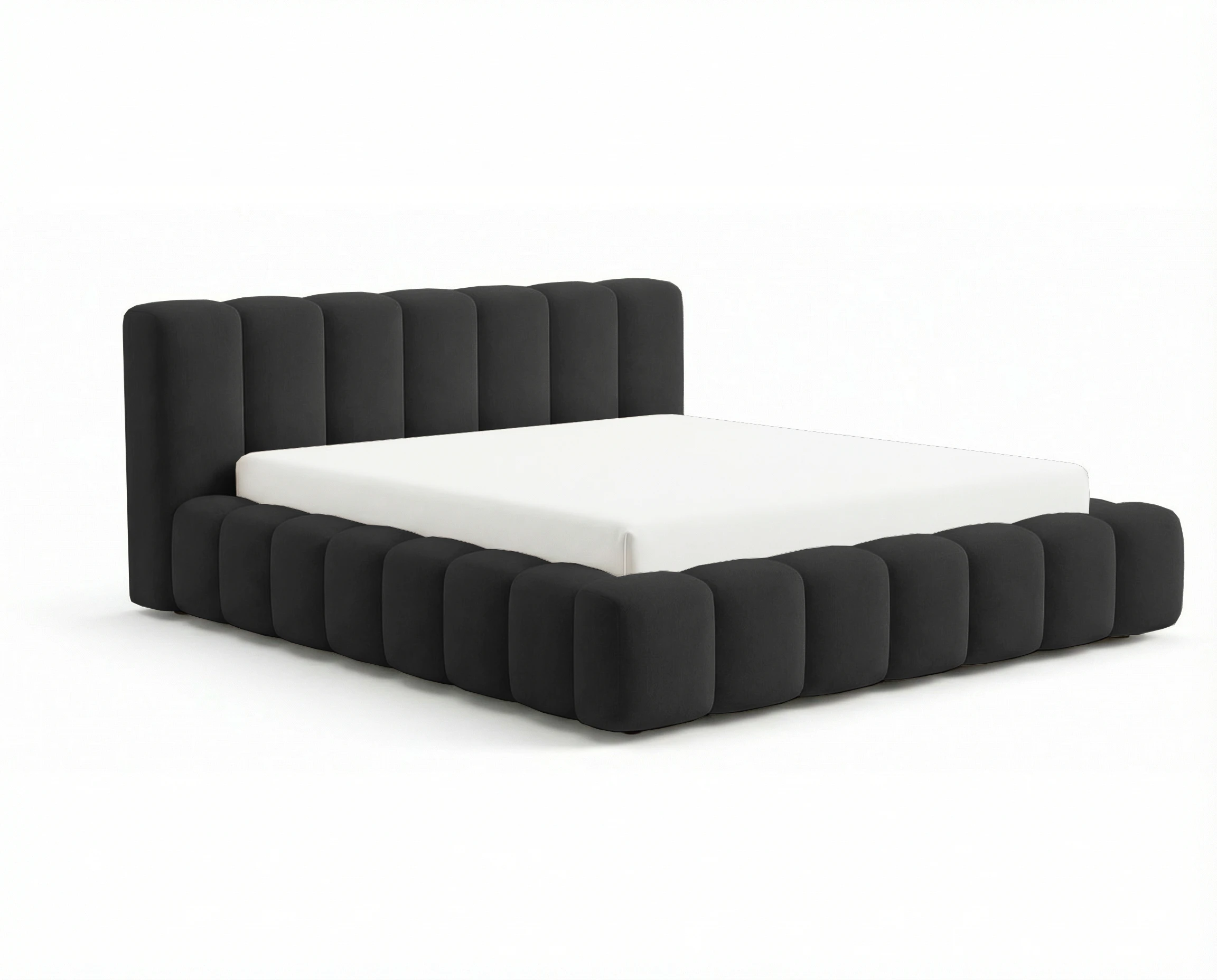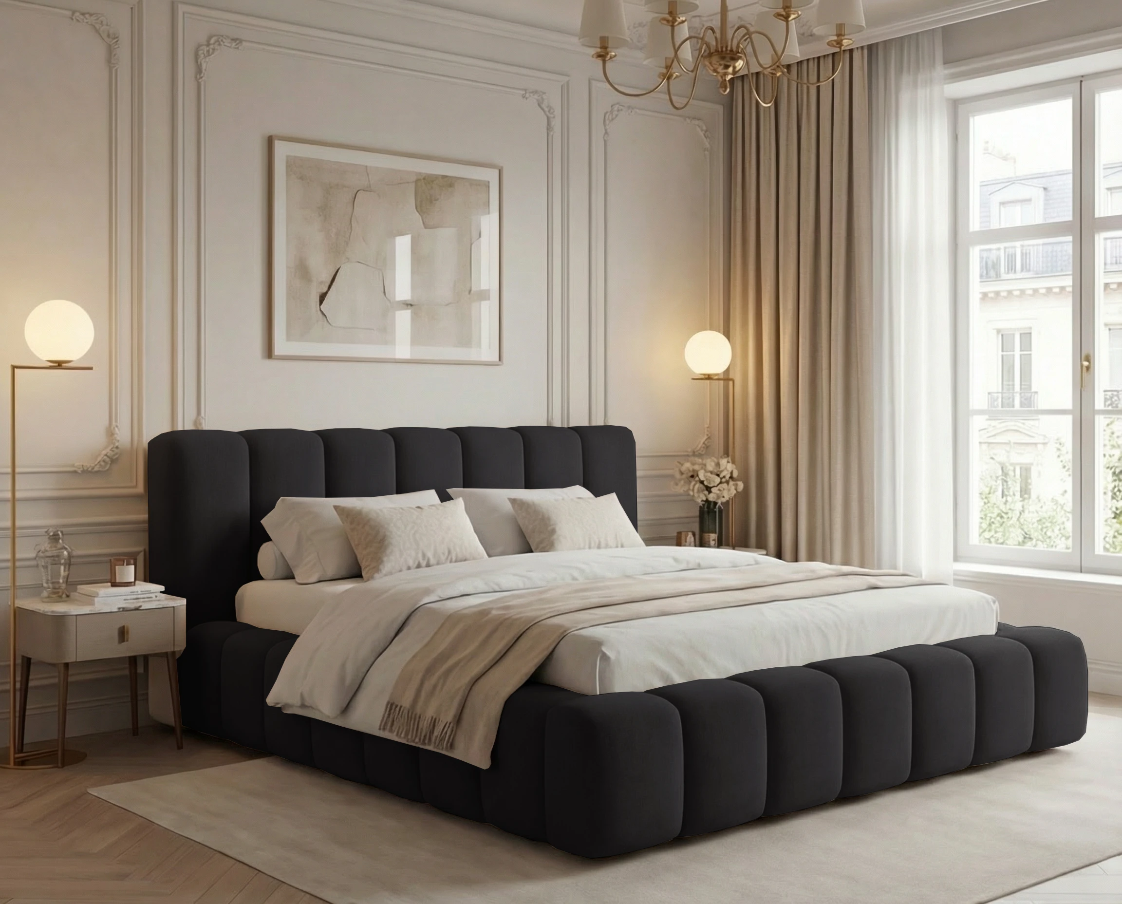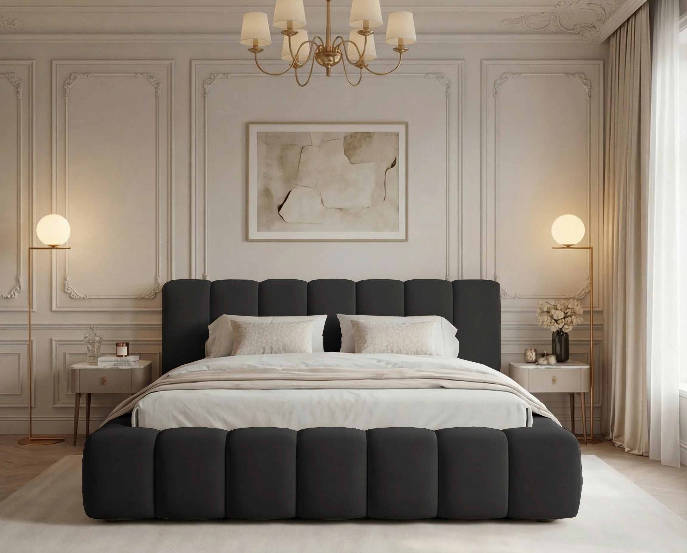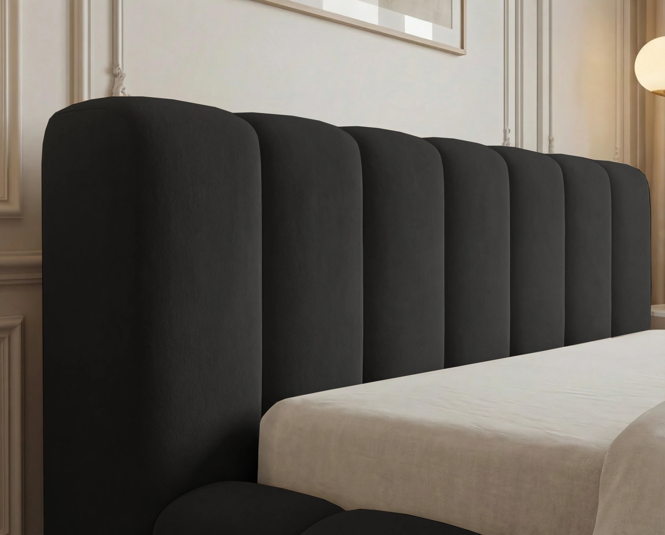 Najbardziej wyróżniającym elementem modelu są głębokie pionowe wciągi, które zdobią zarówno zagłówek, jak i ramę łóżka. Ten efektowny detal nadaje całości nowoczesnego, a zarazem luksusowego wyglądu, wprowadzając do wnętrza przytulną i elegancką atmosferę.