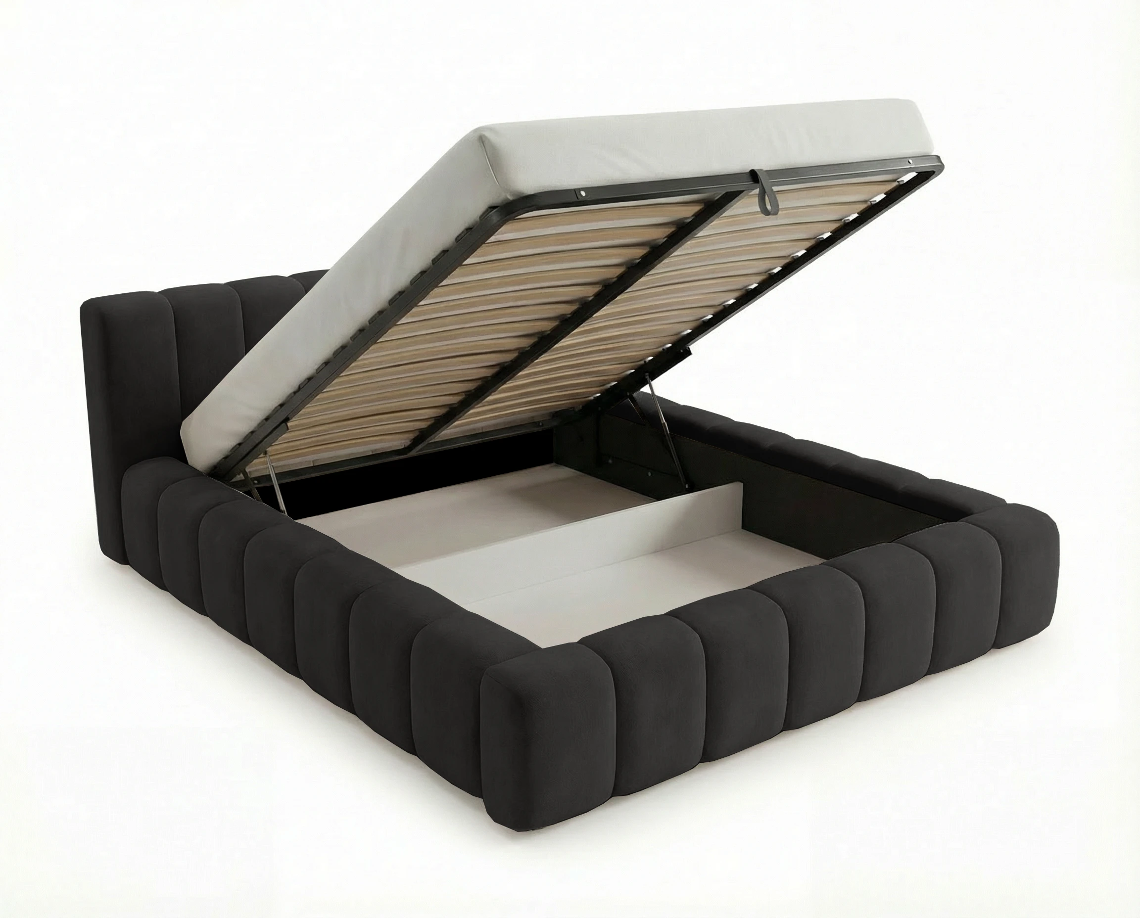 Łóżko Bergamo zostało zaprojektowane z myślą o codziennym komforcie użytkowania. Wyposażone jest w solidny metalowy stelaż podnoszony na automacie hydraulicznym, który umożliwia łatwy i wygodny dostęp do pojemnika na pościel. Mechanizm działa płynnie i bez wysiłku, co sprawia, że przechowywanie staje się wyjątkowo praktyczne.