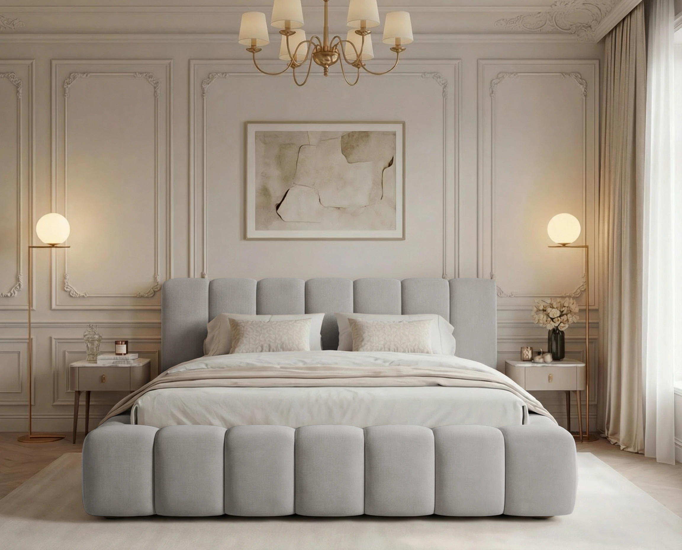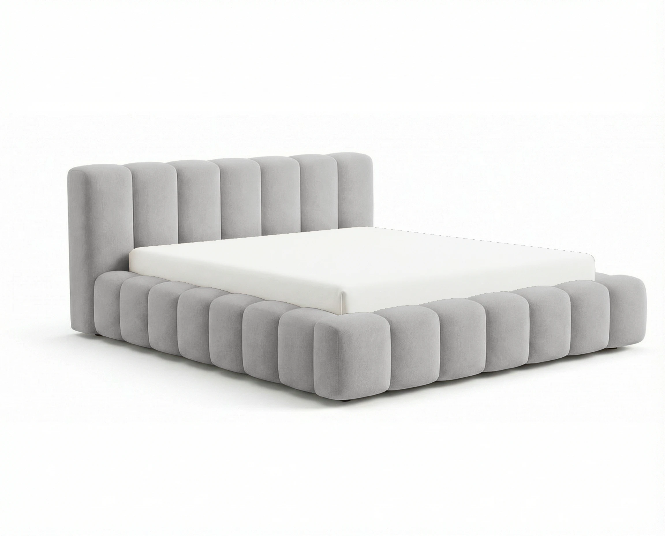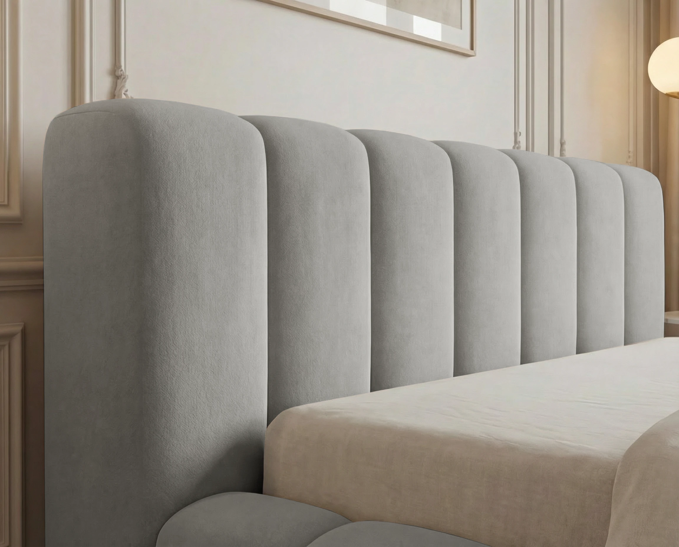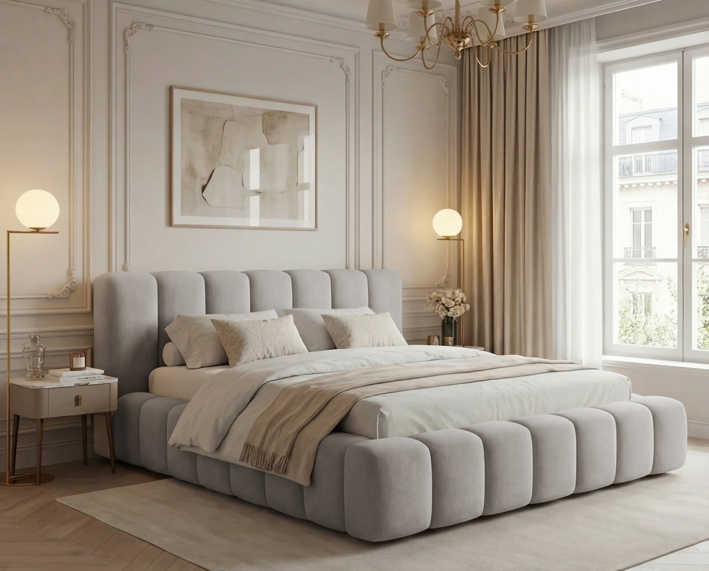 Najbardziej wyróżniającym elementem modelu są głębokie pionowe wciągi, które zdobią zarówno zagłówek, jak i ramę łóżka. Ten efektowny detal nadaje całości nowoczesnego, a zarazem luksusowego wyglądu, wprowadzając do wnętrza przytulną i elegancką atmosferę.