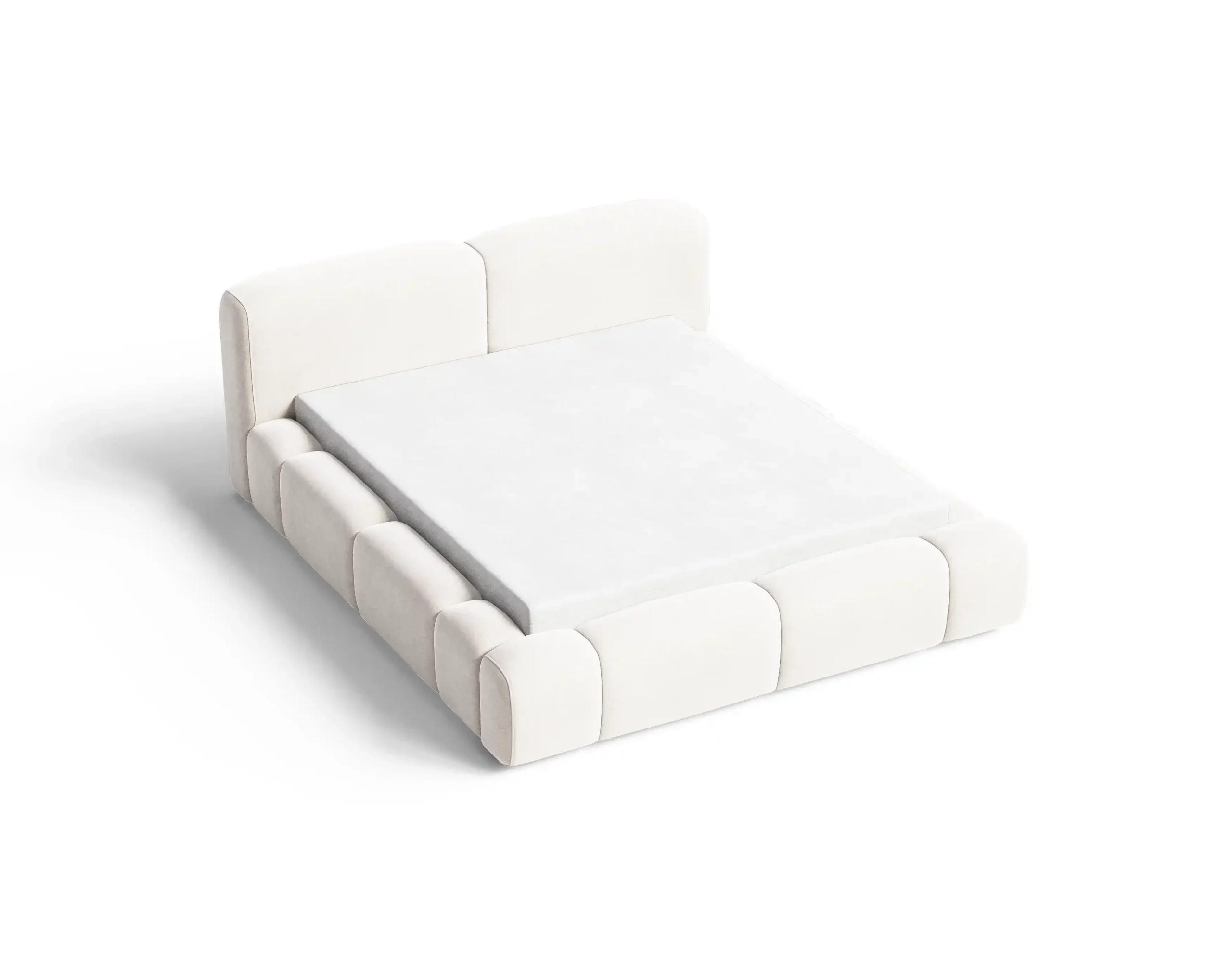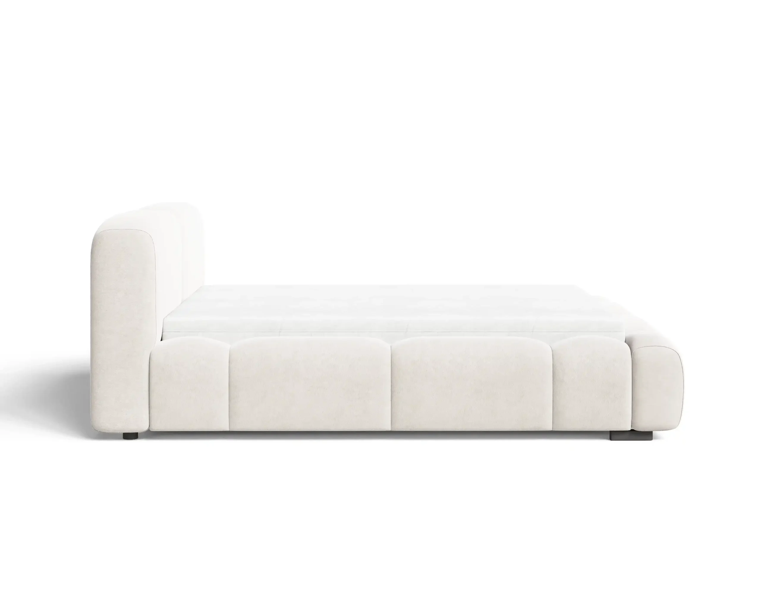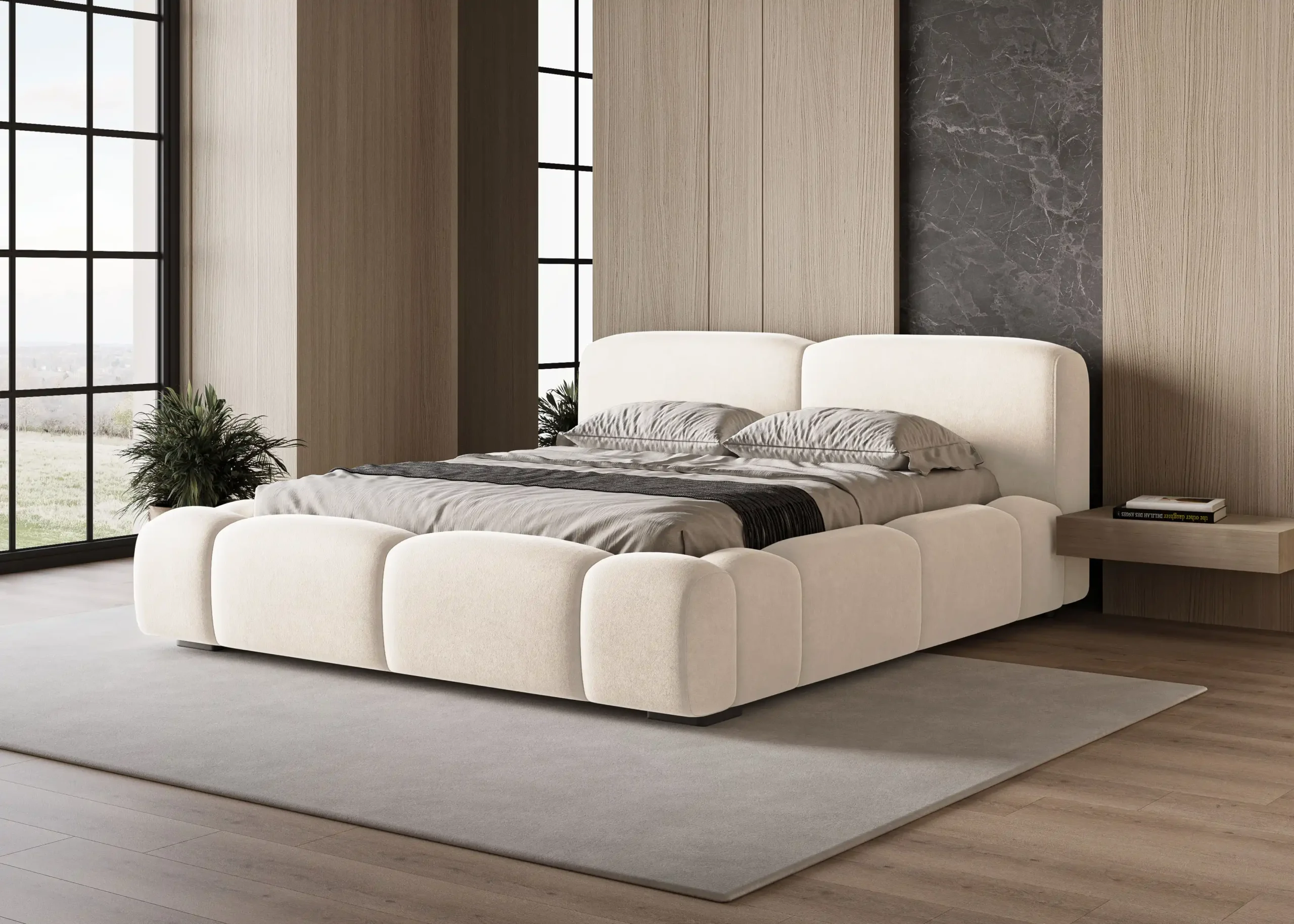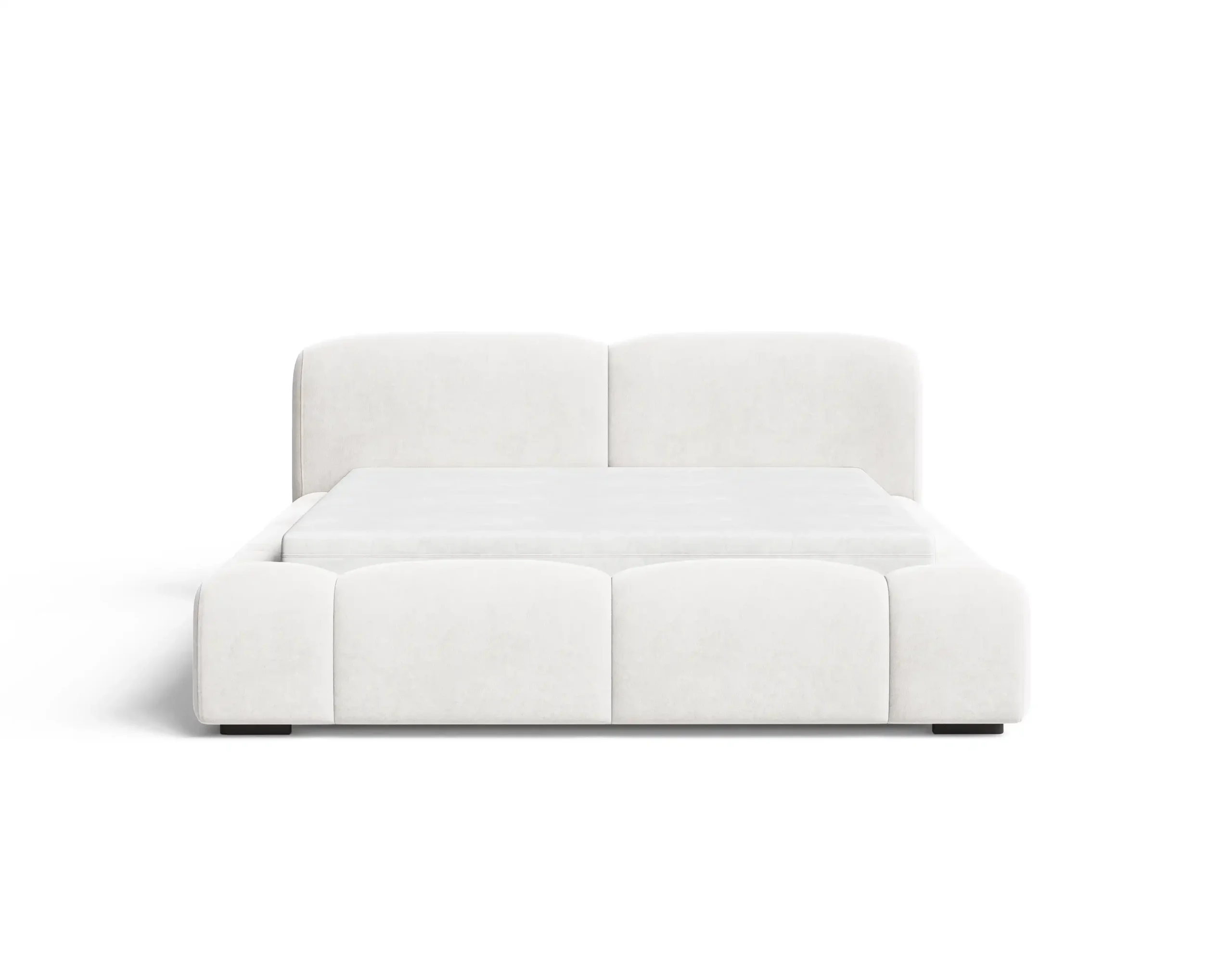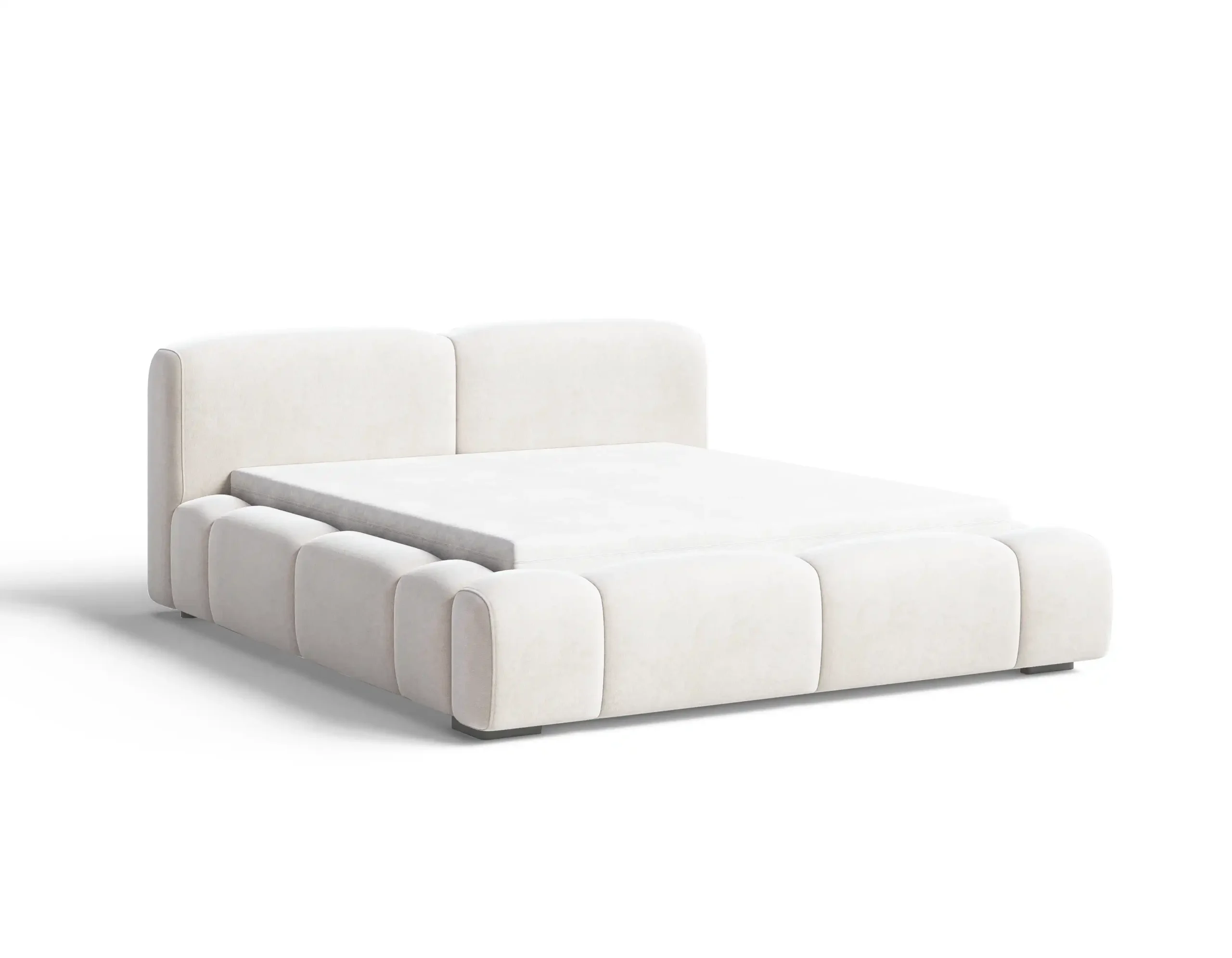 Charakterystycznym elementem są głębokie wciągi na grubej piance, które tworzą efektowny, przestrzenny wzór i nadają bryle łóżka nowoczesnej, designerskiej formy. Tapicerowane elementy o zaokrąglonych kształtach zapewniają nie tylko estetykę, ale również komfort użytkowania.