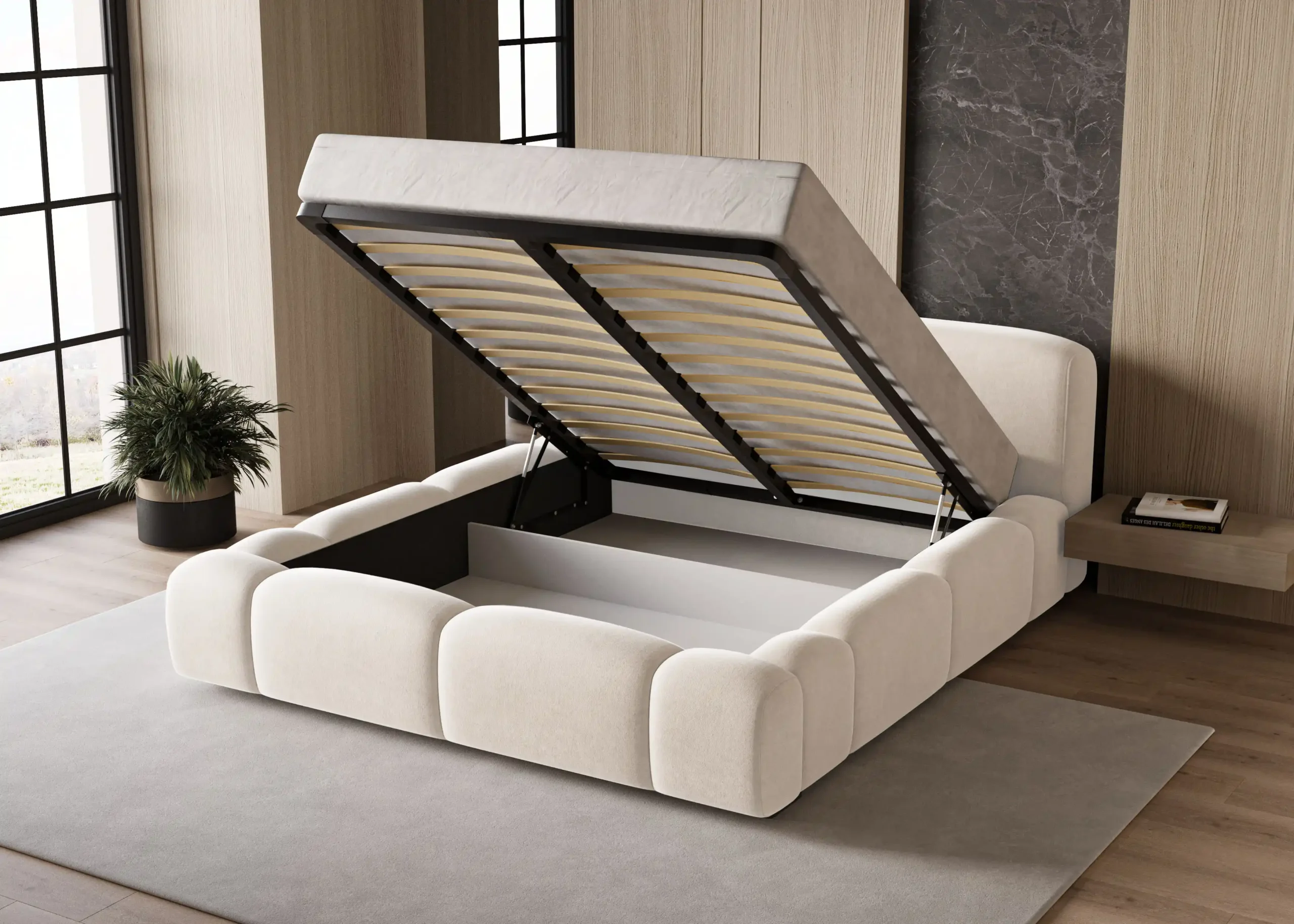Łóżko Bubble wyposażone jest w solidny metalowy stelaż otwierany na automacie hydraulicznym, który umożliwia łatwy dostęp do pojemnika na pościel. Mechanizm działa lekko i bezpiecznie, co znacząco podnosi funkcjonalność mebla i ułatwia jego codzienne użytkowanie.