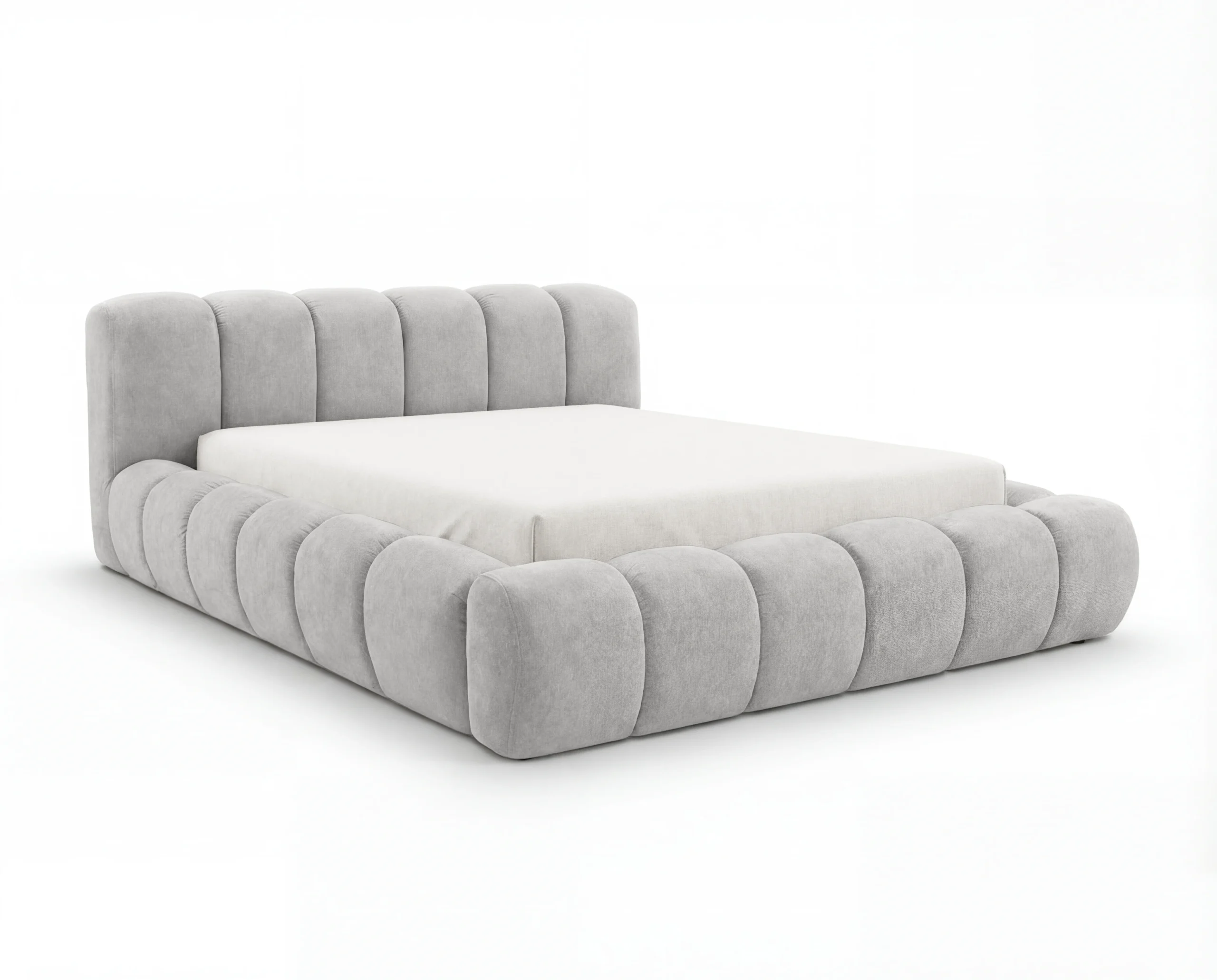 Łóżko zostało wykonane z wysokiej jakości tkaniny łatwoczyszczącej Komodo typu plusz, która jest niezwykle przyjemna w dotyku, a jednocześnie odporna na codzienne użytkowanie. Miękka, welurowa struktura materiału pięknie odbija światło, dodając wnętrzu elegancji i przytulności.
