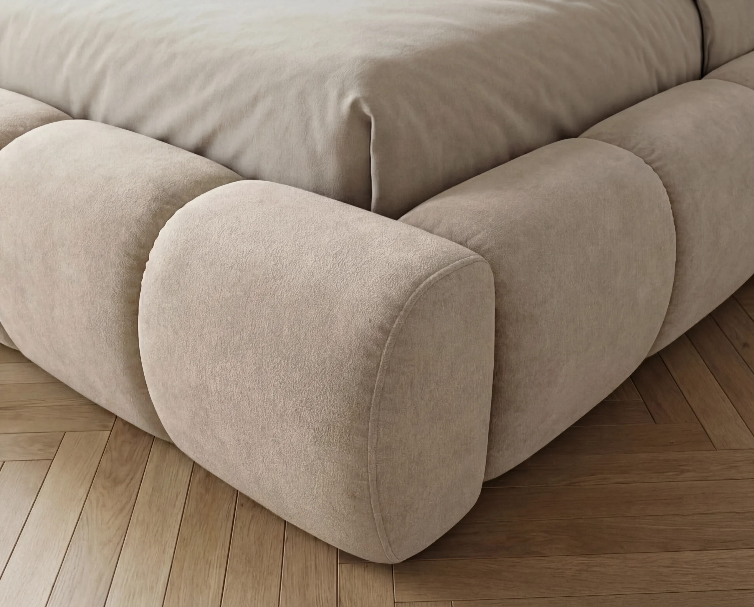 Łóżko zostało wykonane z wysokiej jakości tkaniny łatwoczyszczącej Komodo typu plusz, która jest niezwykle przyjemna w dotyku, a jednocześnie odporna na codzienne użytkowanie. Miękka, welurowa struktura materiału pięknie odbija światło, dodając wnętrzu elegancji i przytulności.