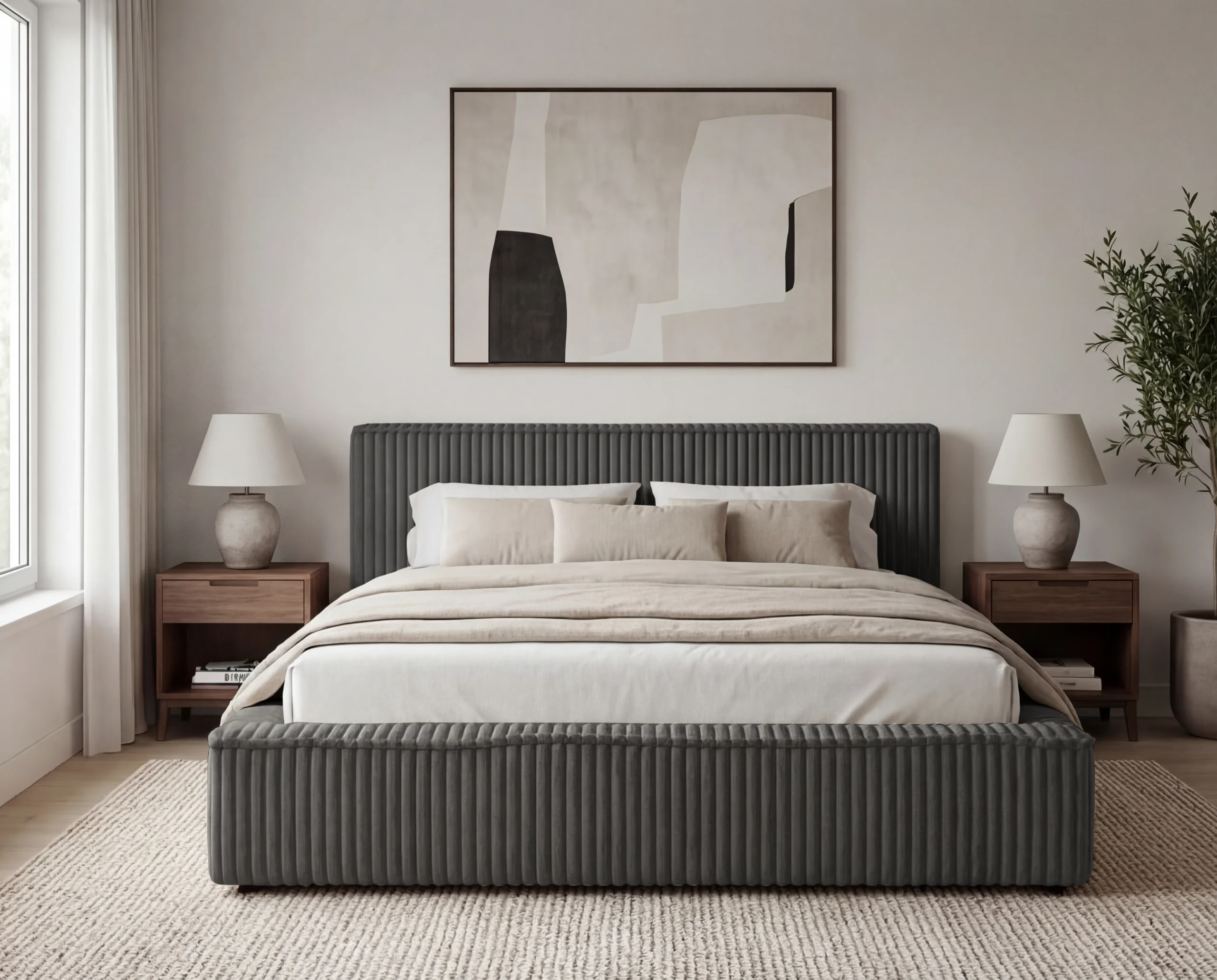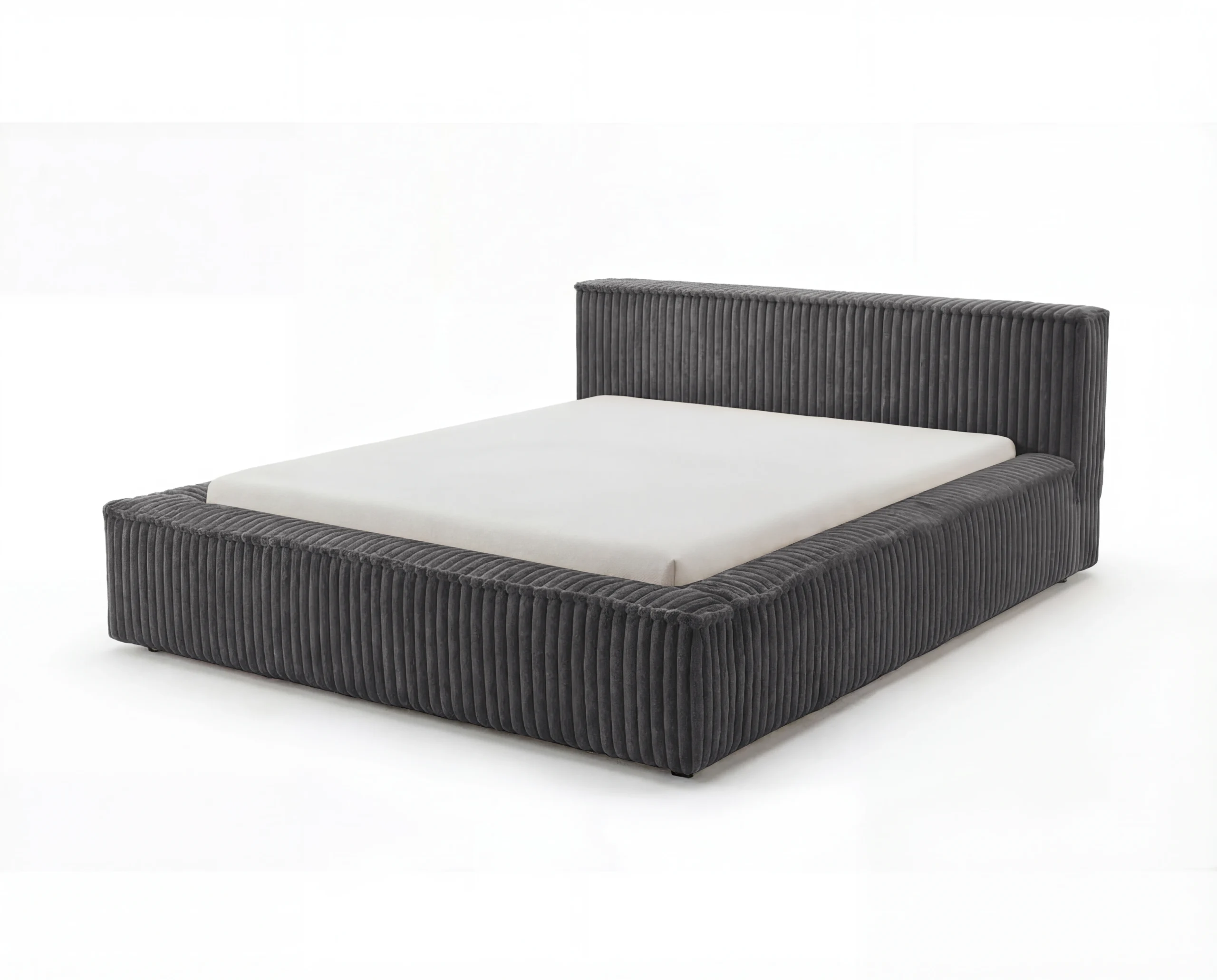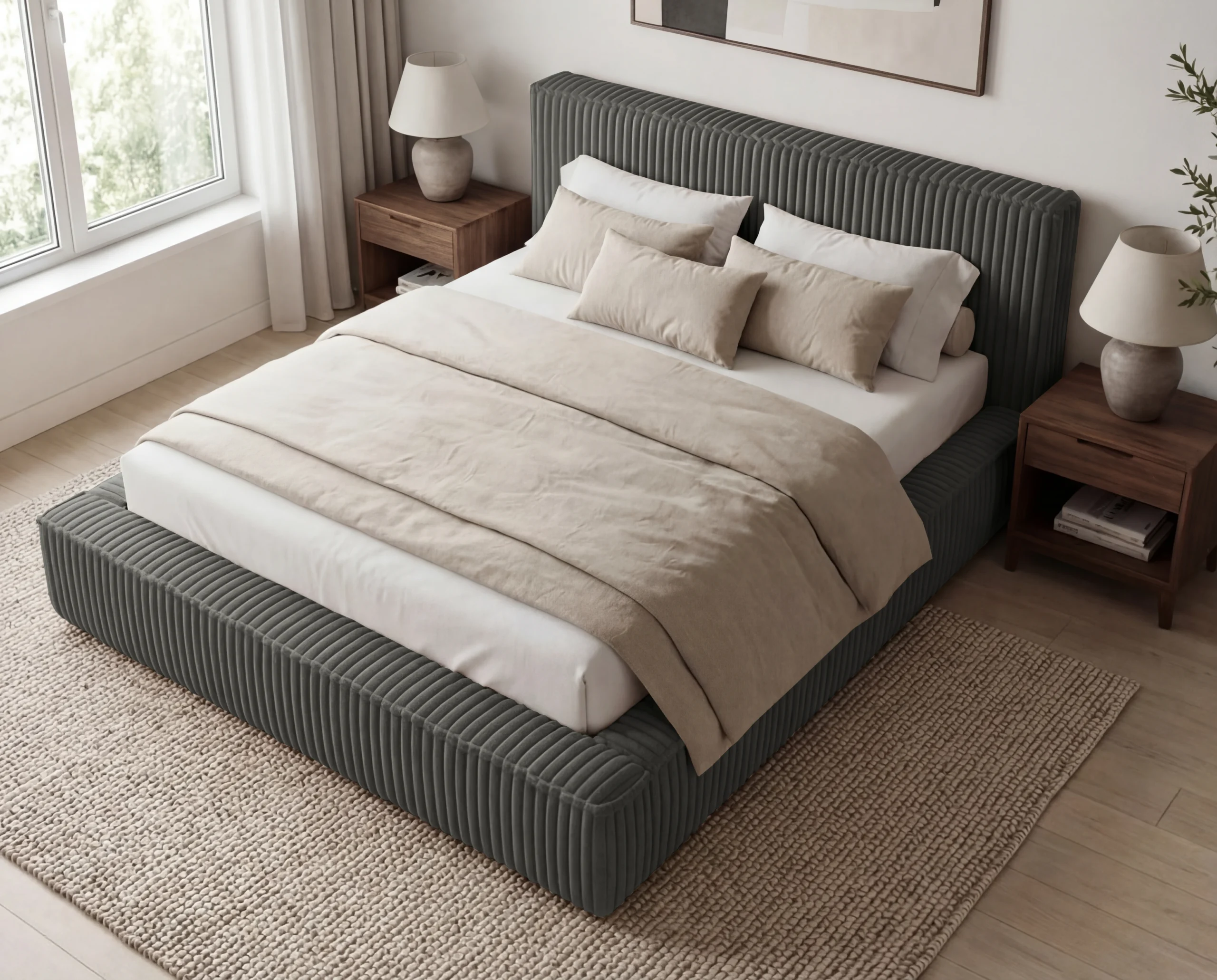 Minimalistyczna bryła łóżka została zaprojektowana z dbałością o detale – niska, szeroka rama oraz subtelny zagłówek tworzą spójną i harmonijną całość, idealną do nowoczesnej sypialni.