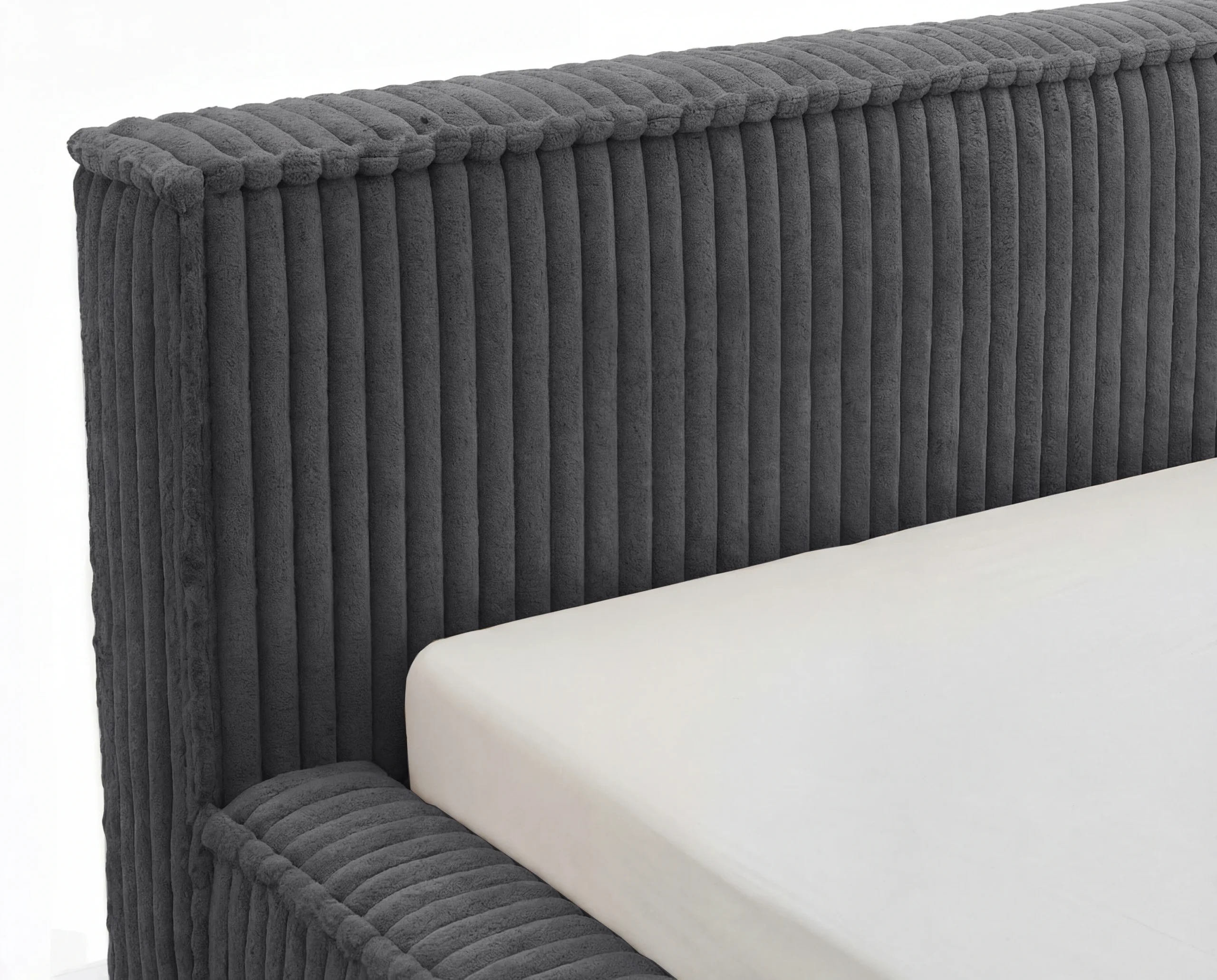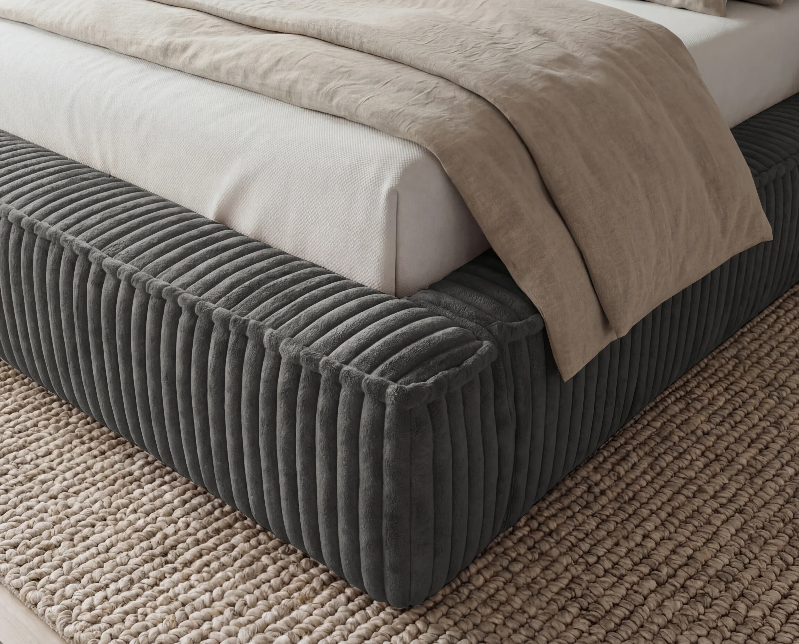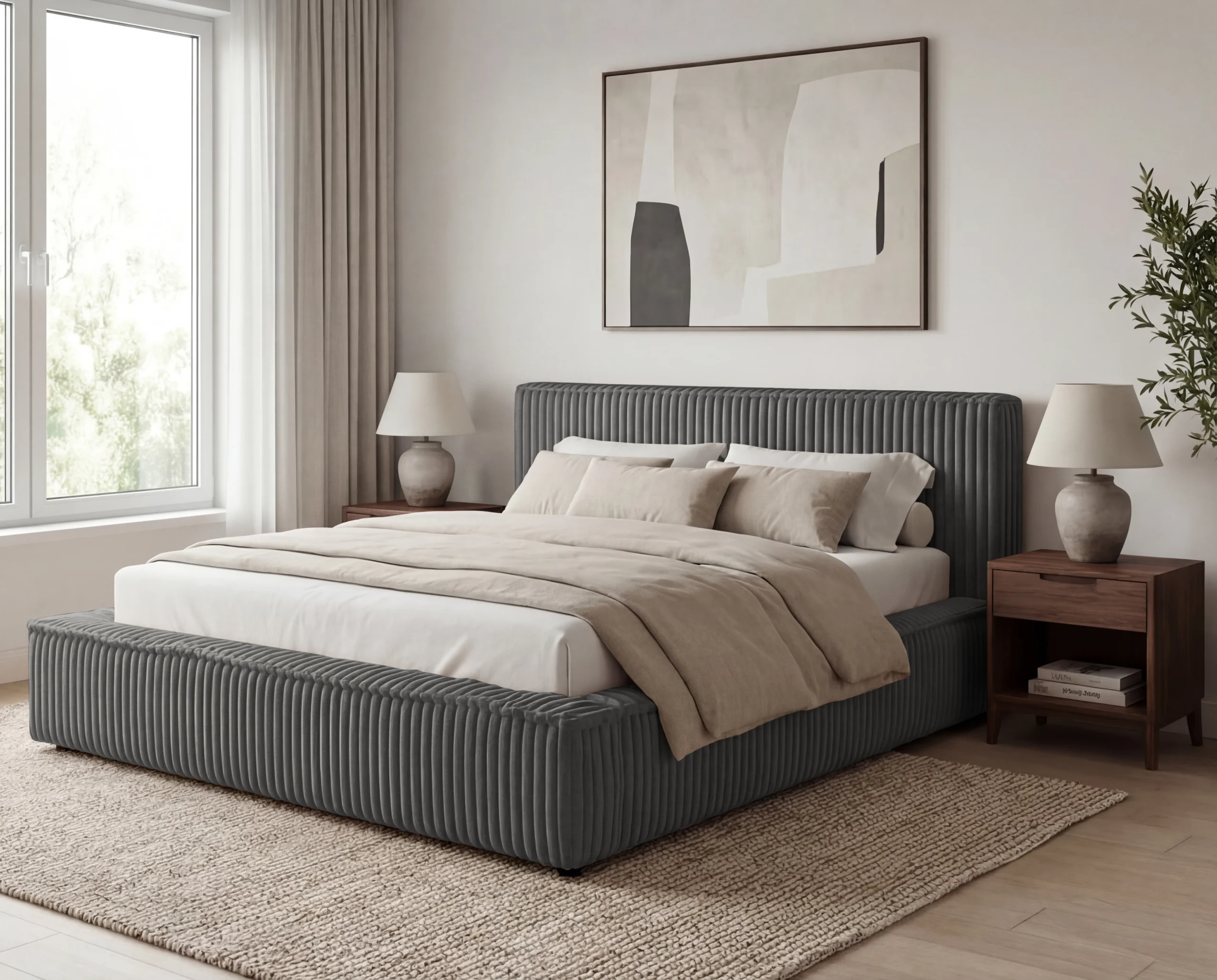 Model Leo wyróżnia się obiciem z mięsistej tkaniny typu sztruks, która nadaje meblowi wyjątkowej struktury i charakteru. Wyraźne, pionowe prążki nie tylko podkreślają design łóżka, ale również wprowadzają do wnętrza przytulność i elegancję. Materiał jest przyjemny w dotyku, trwały i odporny na codzienne użytkowanie.