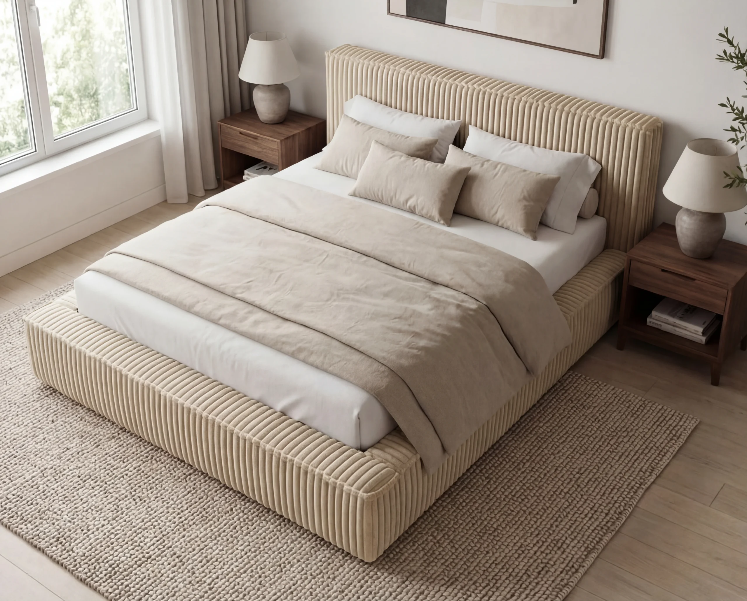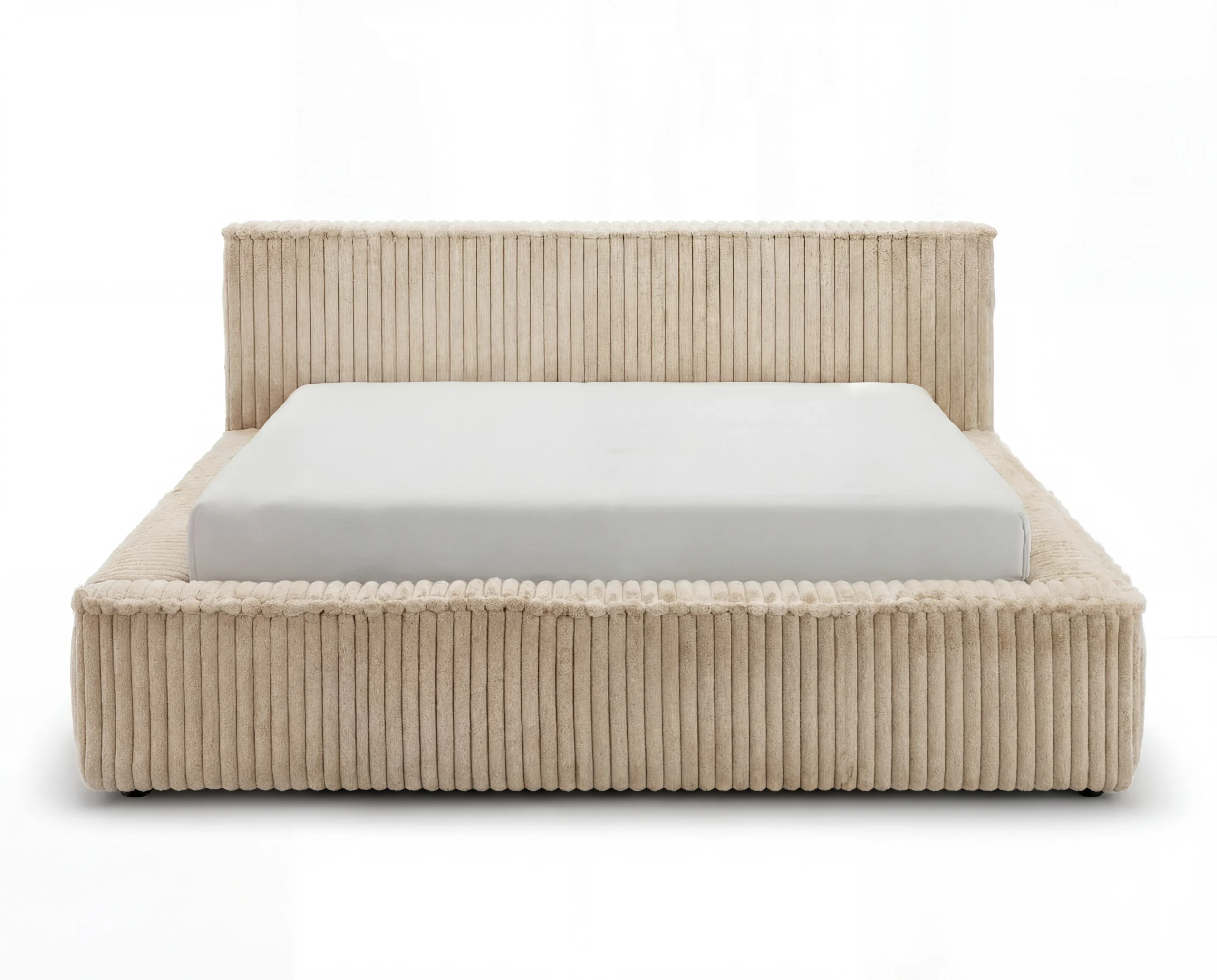 Minimalistyczna bryła łóżka została zaprojektowana z dbałością o detale – niska, szeroka rama oraz subtelny zagłówek tworzą spójną i harmonijną całość, idealną do nowoczesnej sypialni.