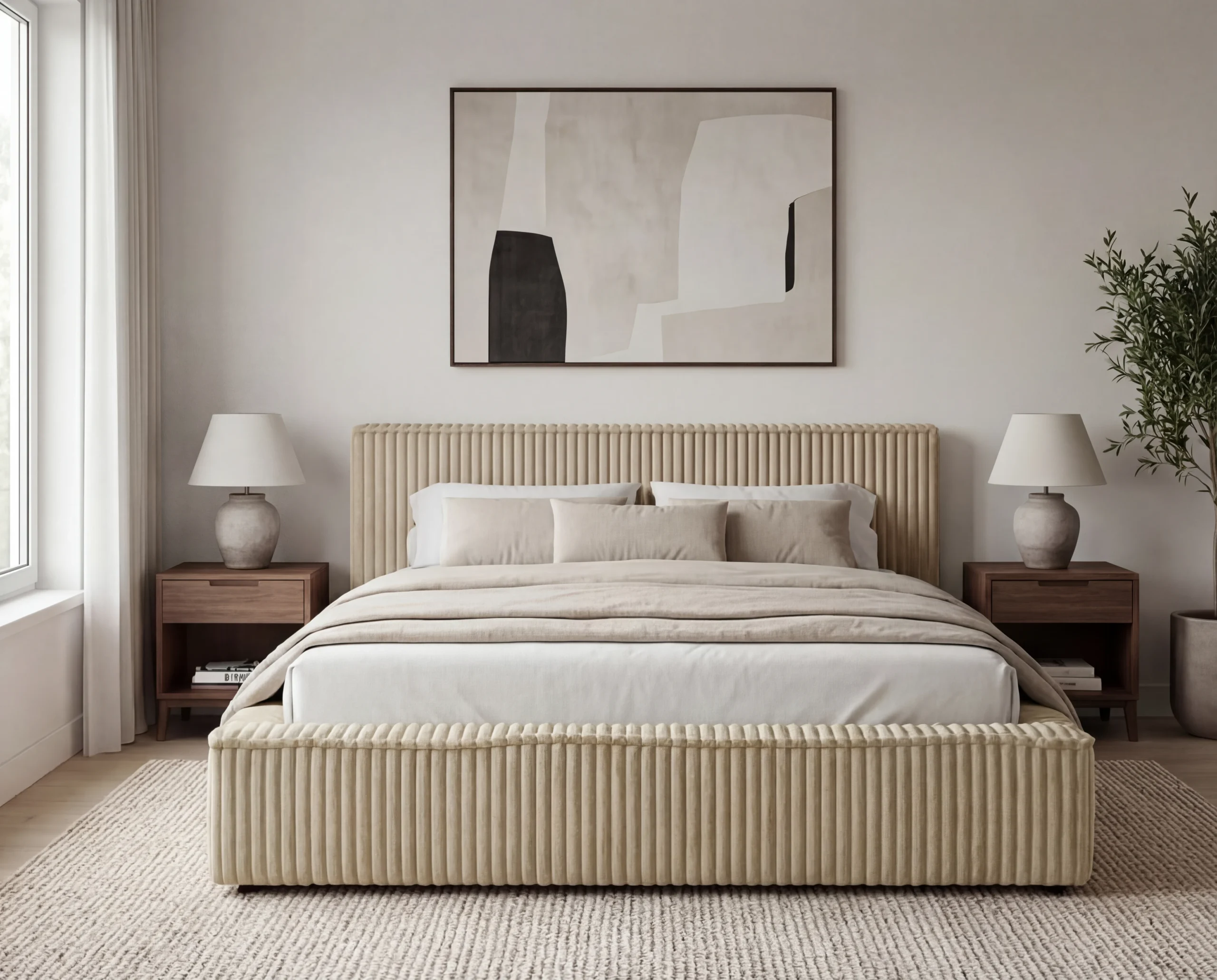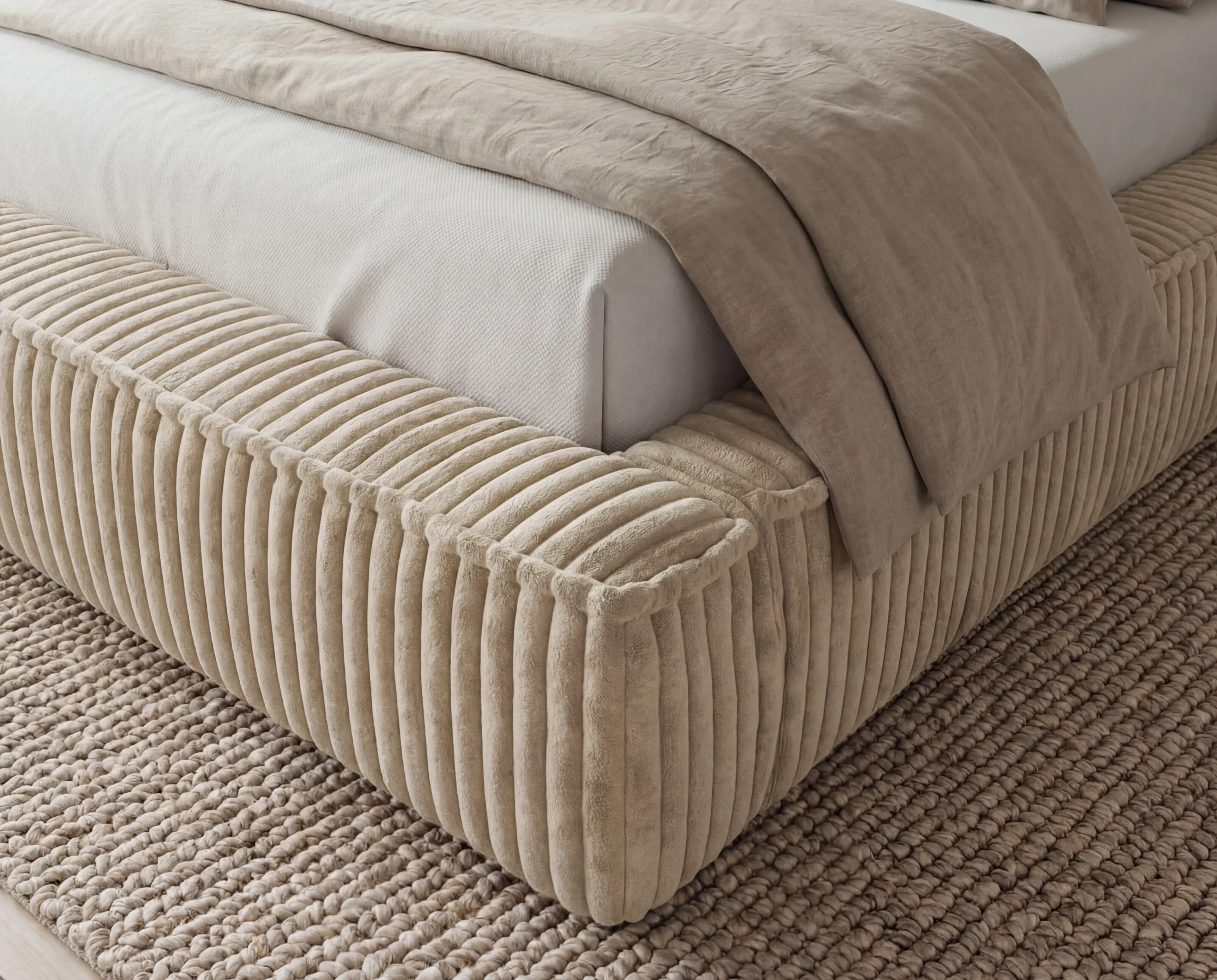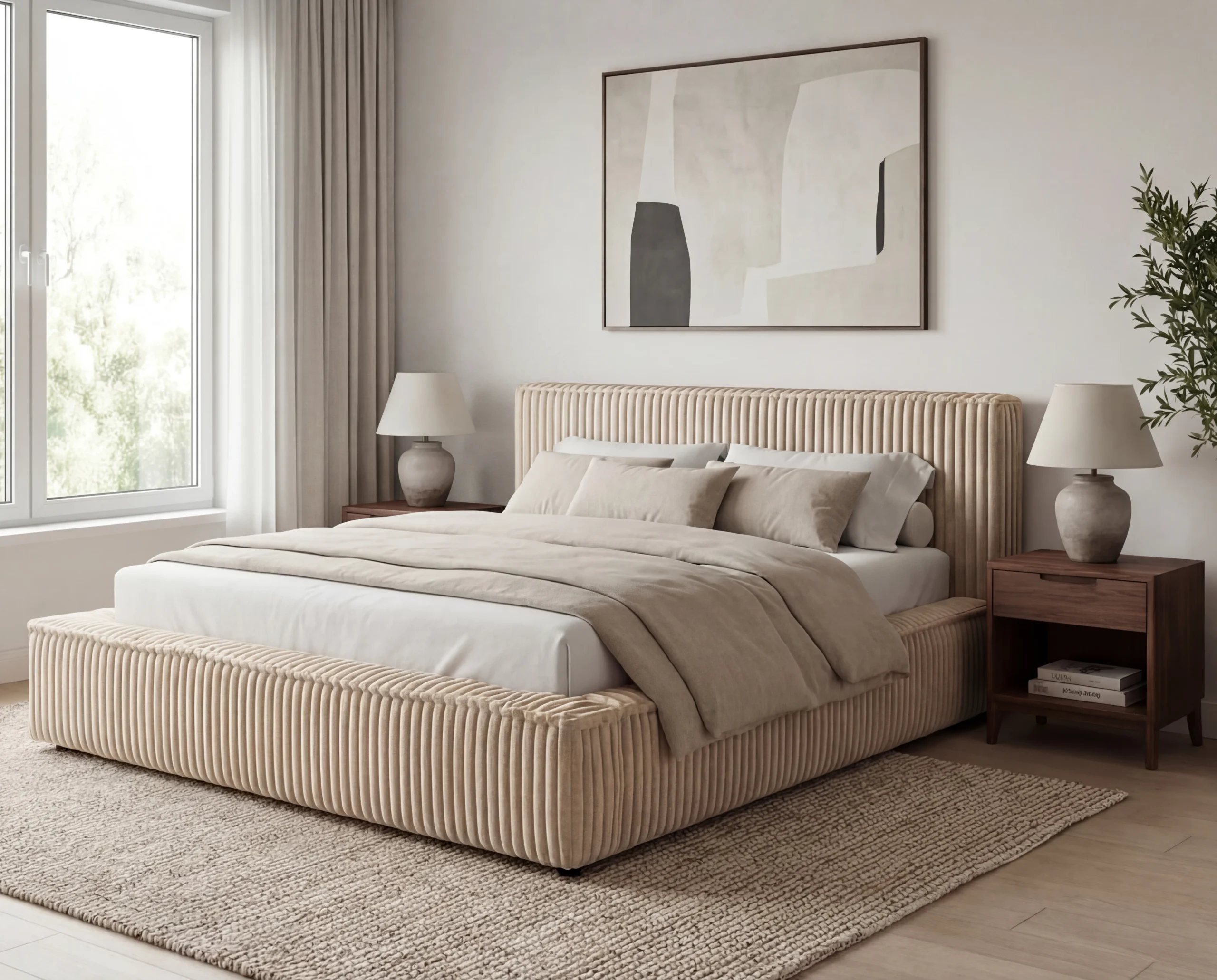 Model Leo wyróżnia się obiciem z mięsistej tkaniny typu sztruks, która nadaje meblowi wyjątkowej struktury i charakteru. Wyraźne, pionowe prążki nie tylko podkreślają design łóżka, ale również wprowadzają do wnętrza przytulność i elegancję. Materiał jest przyjemny w dotyku, trwały i odporny na codzienne użytkowanie.