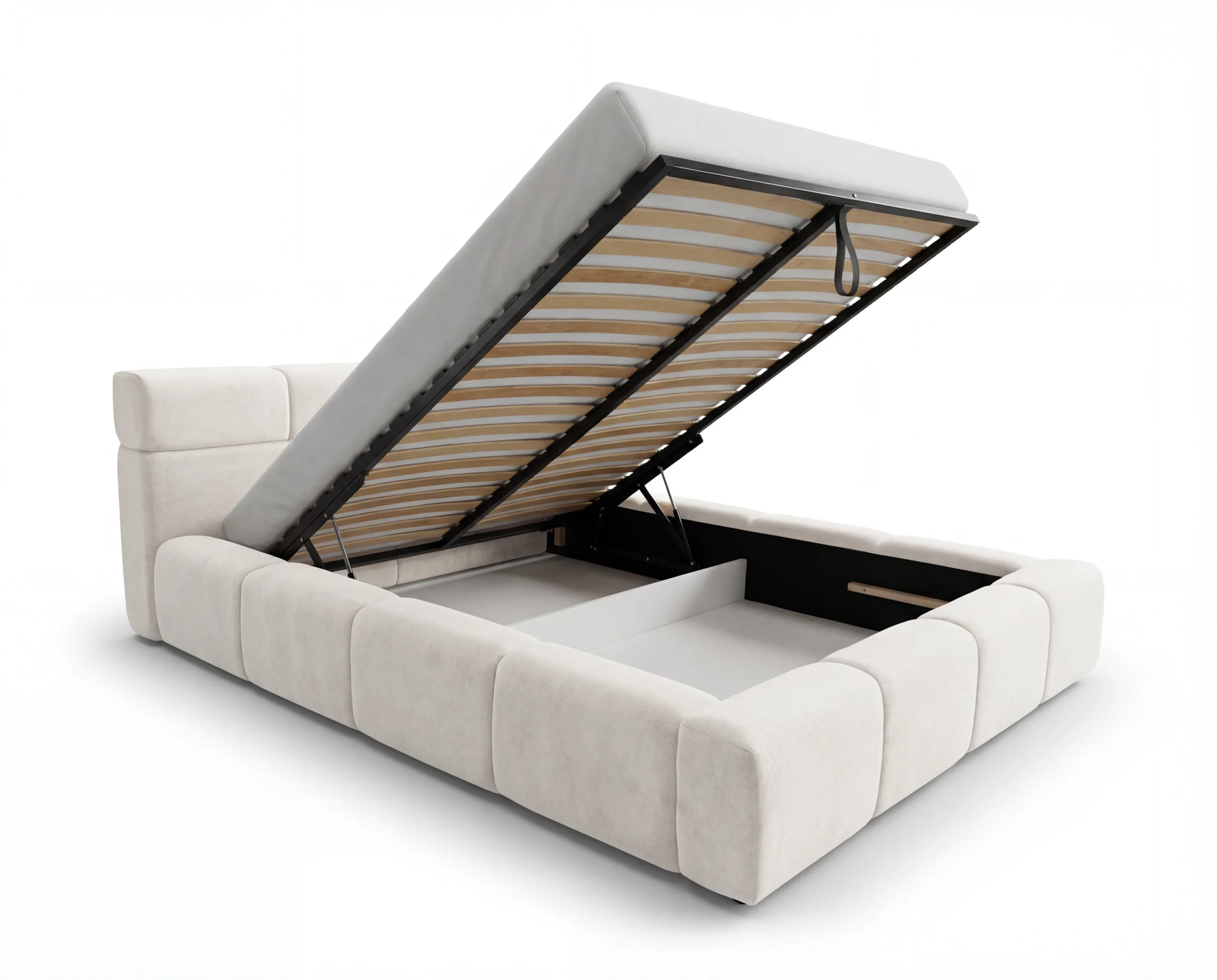 Łóżko Verso wyposażone jest w solidny, metalowy stelaż podnoszony na automacie hydraulicznym (gazowym), który umożliwia łatwe i bezpieczne unoszenie materaca. Pod stelażem znajduje się pojemny schowek na pościel, idealny do przechowywania kołder, poduszek czy sezonowych tekstyliów.