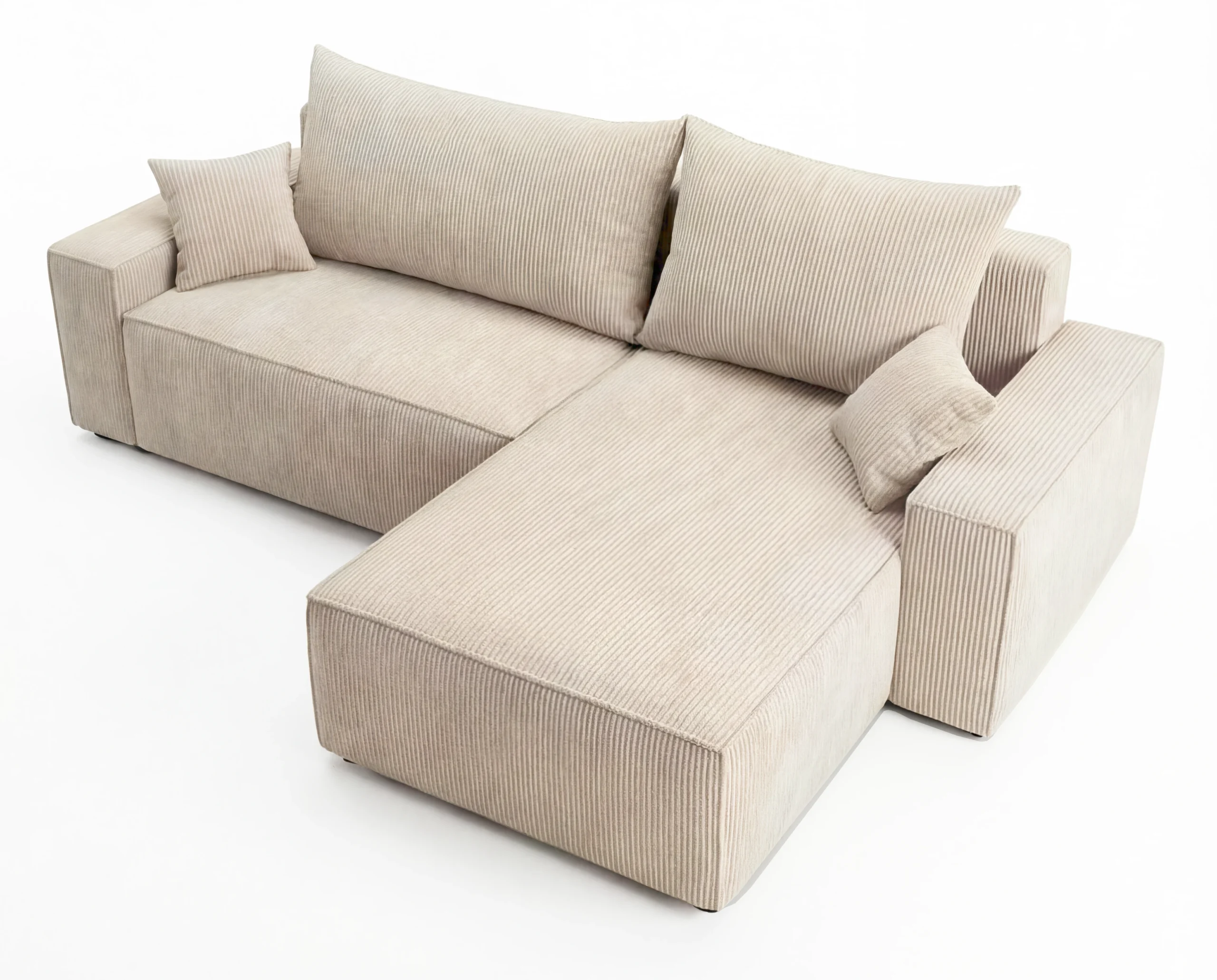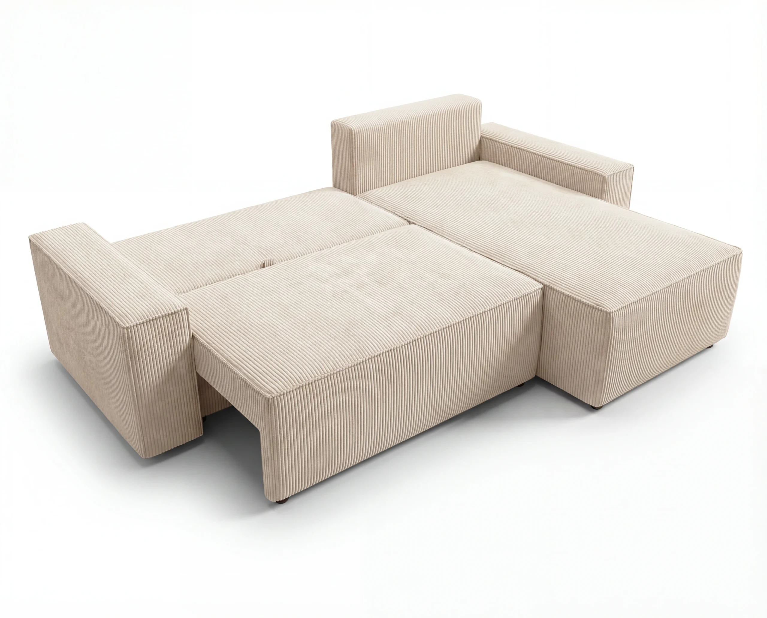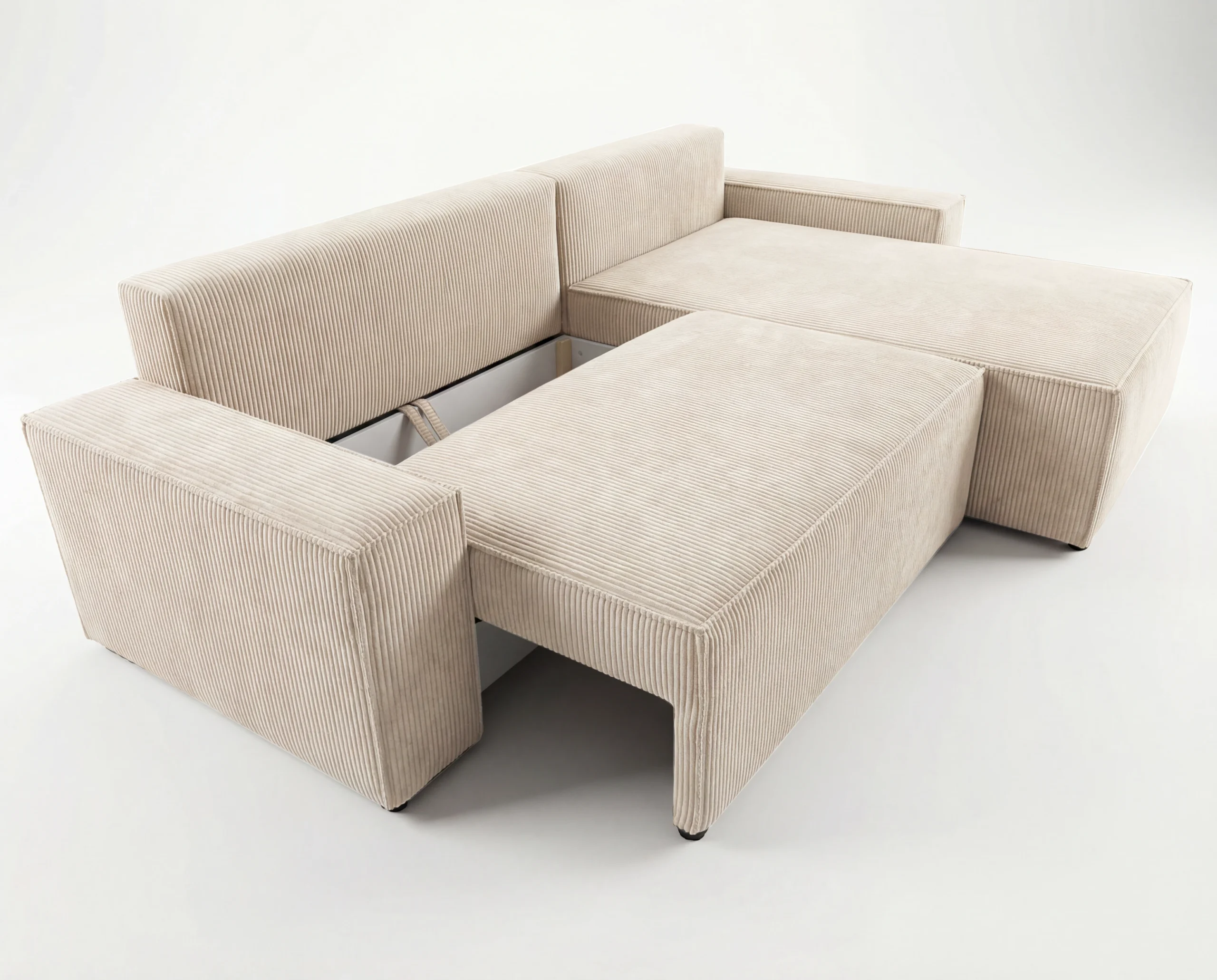 Narożnik L z funkcją spania i pojemnikiem Cord sztruks beżowy