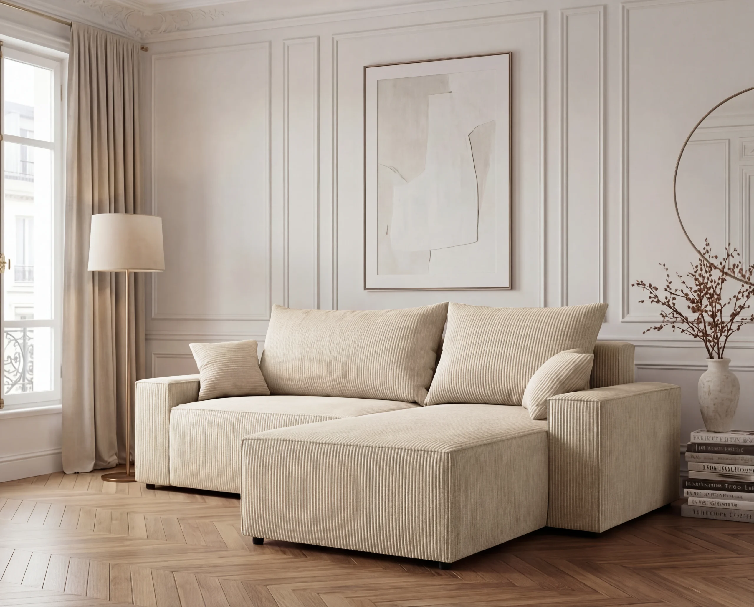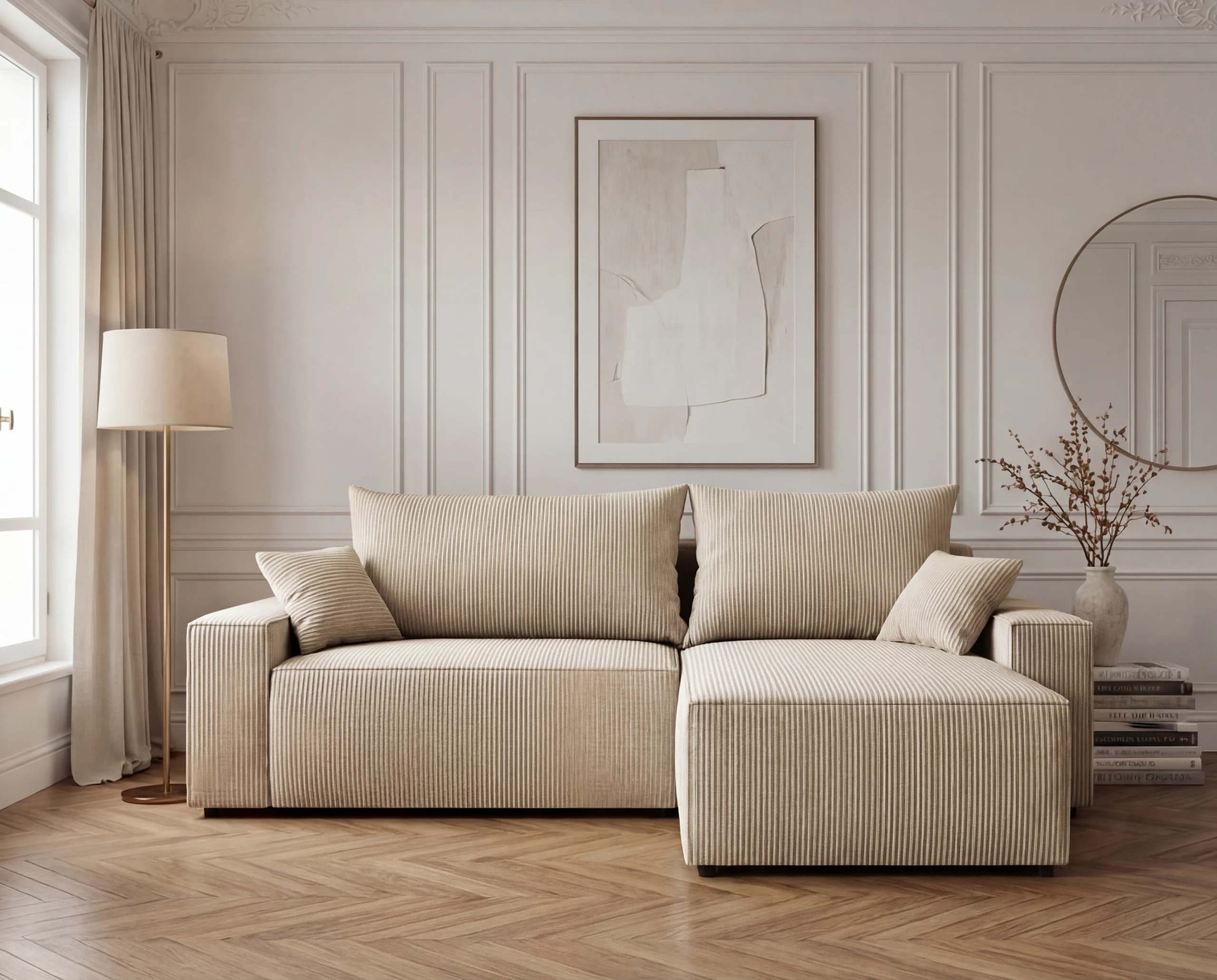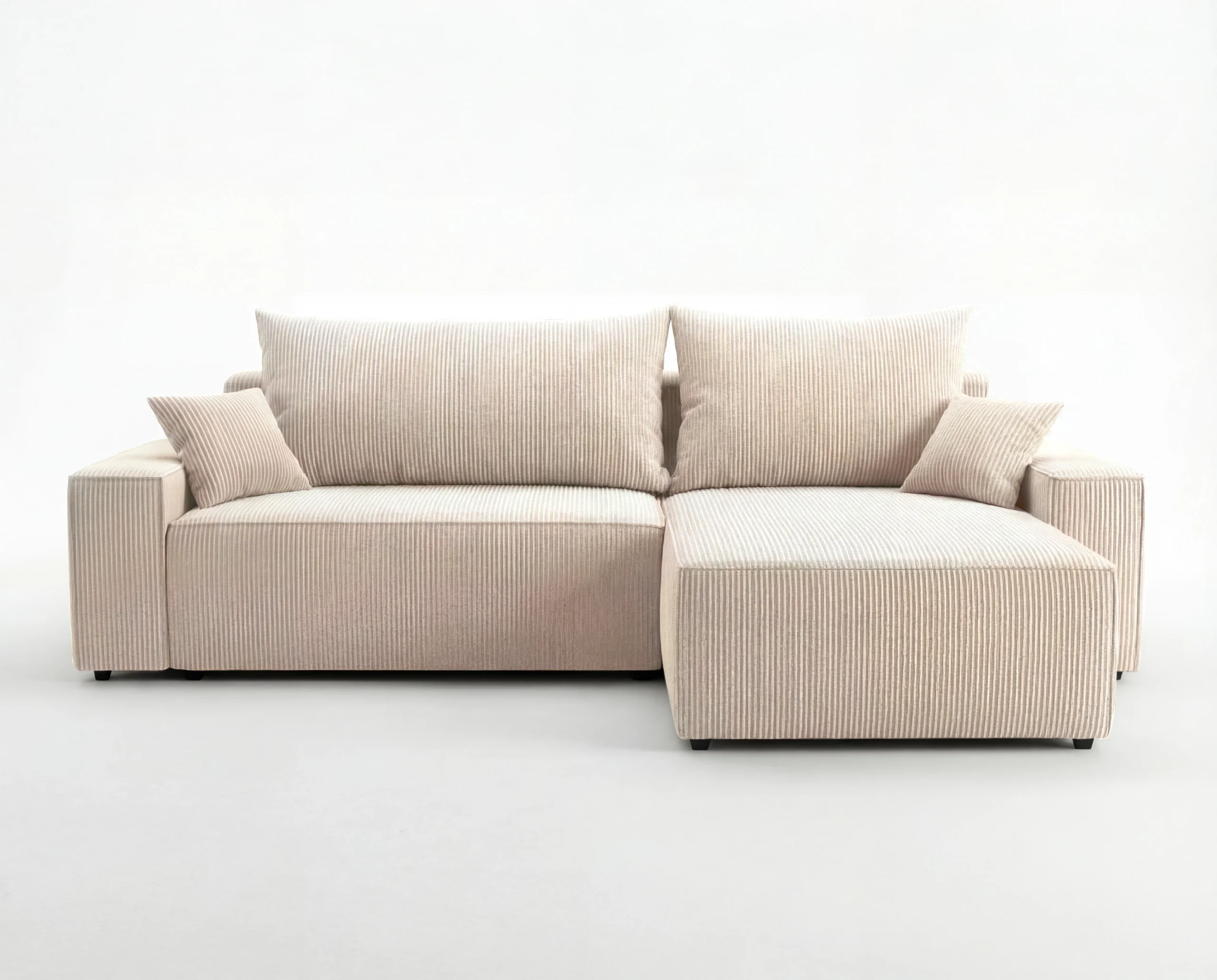 Narożnik L z funkcją spania i pojemnikiem Cord sztruks beżowy