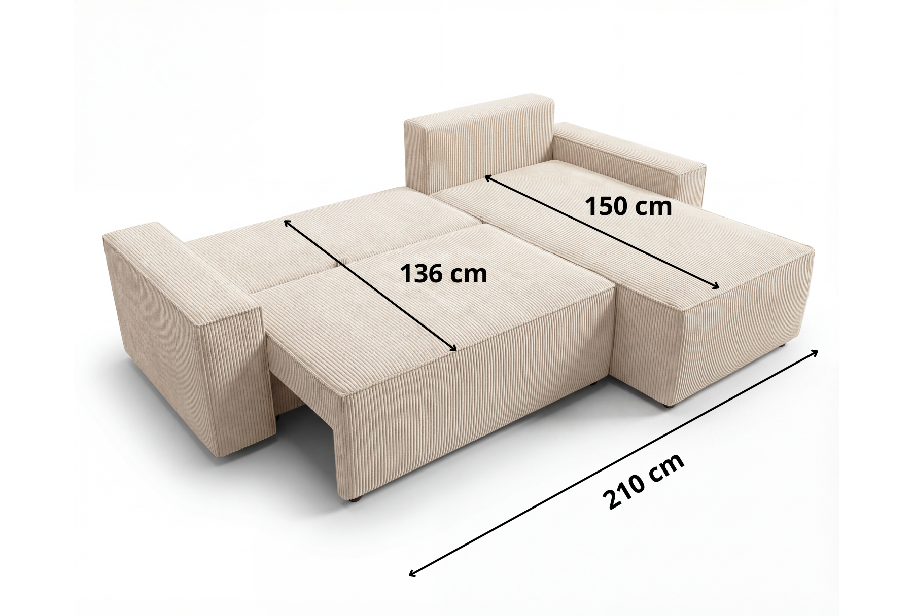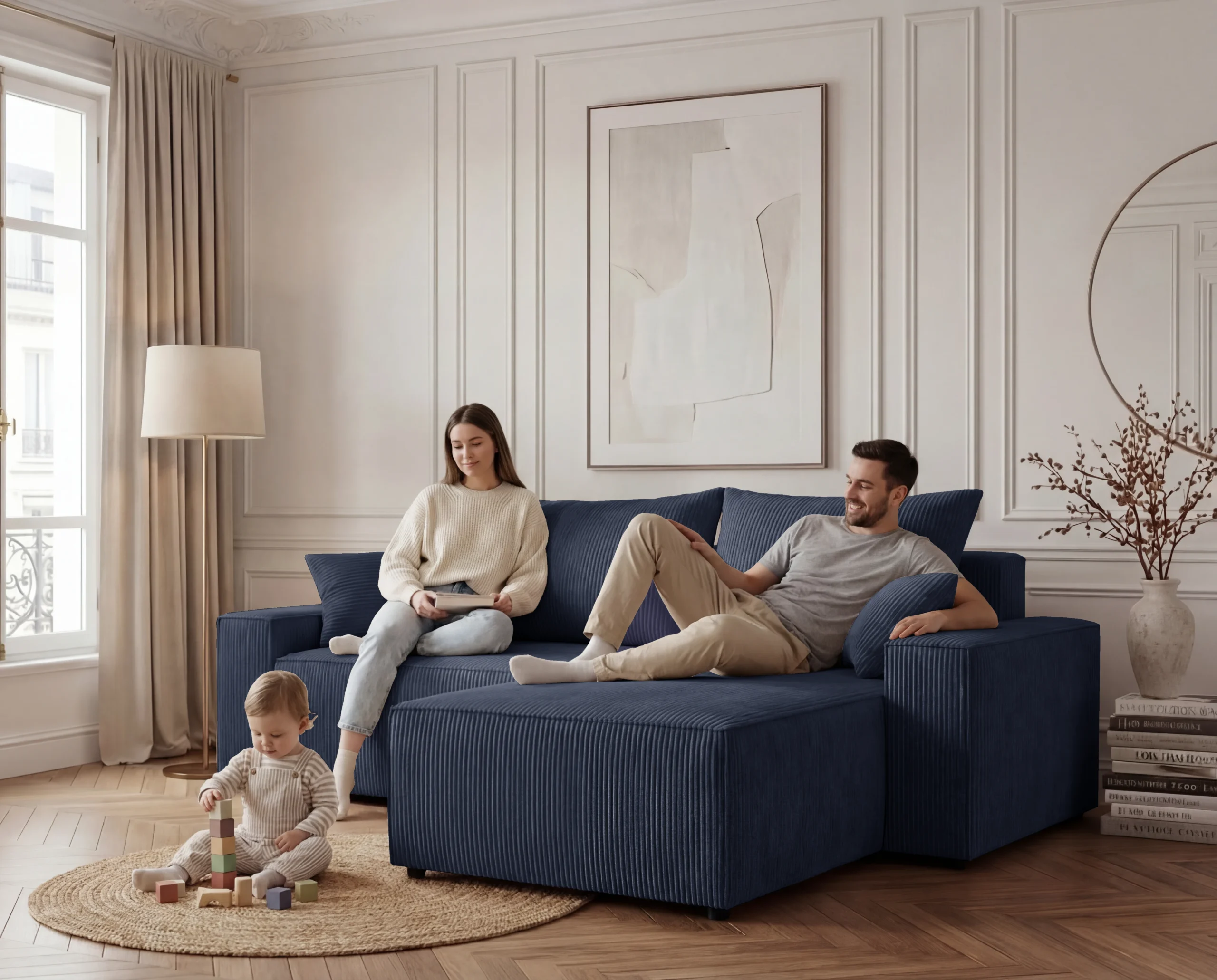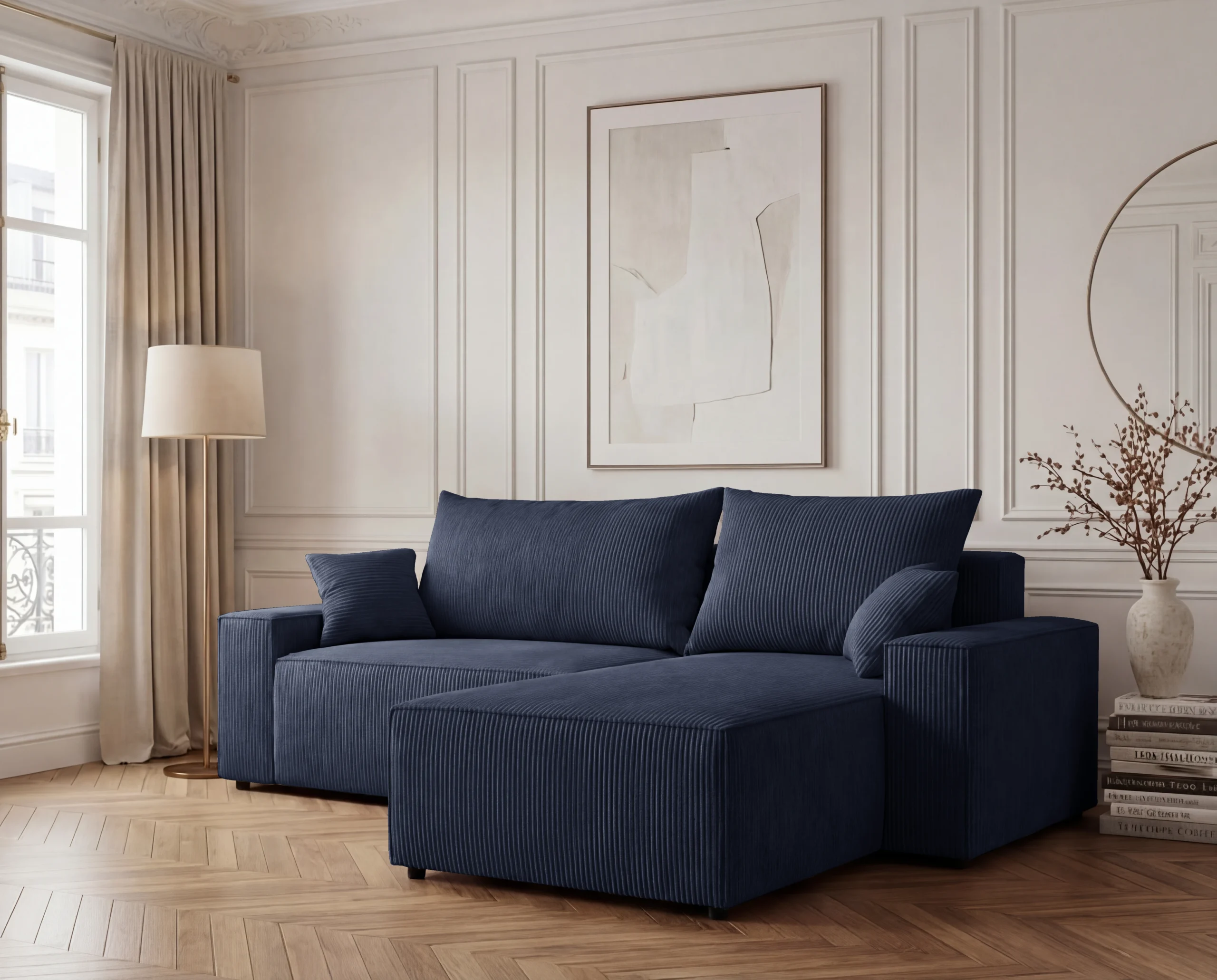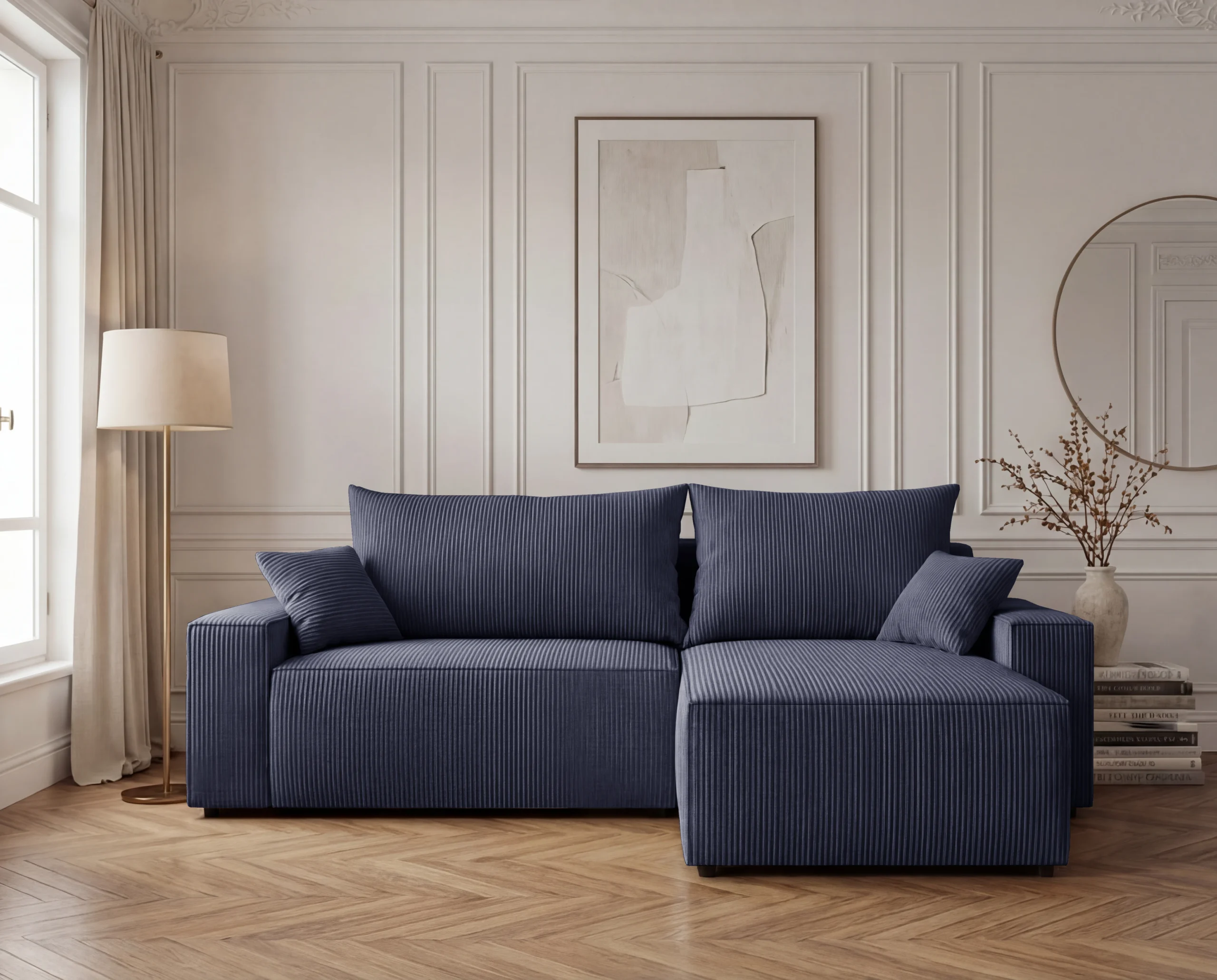 Narożnik L z funkcją spania i pojemnikiem Cord sztruks granatowy