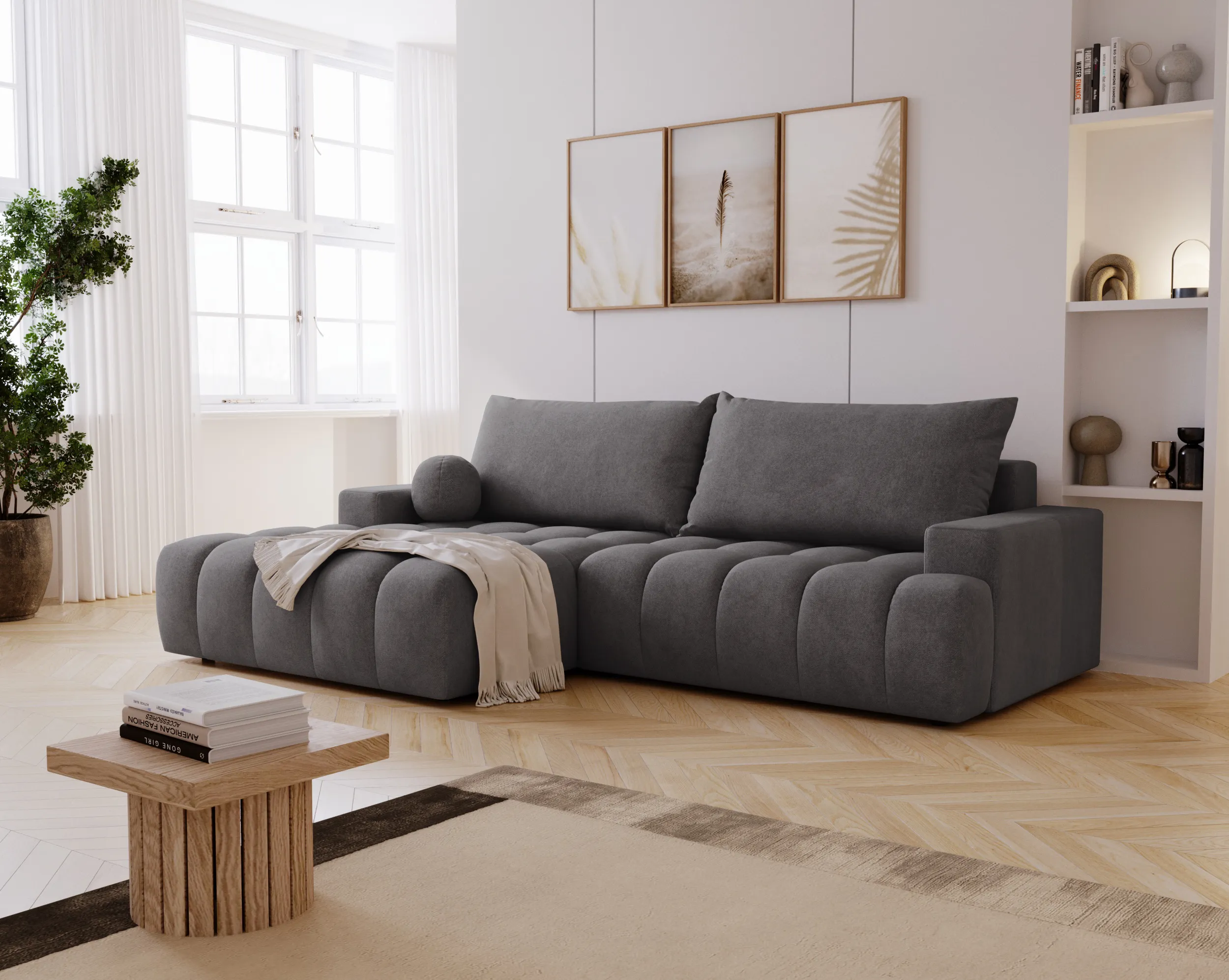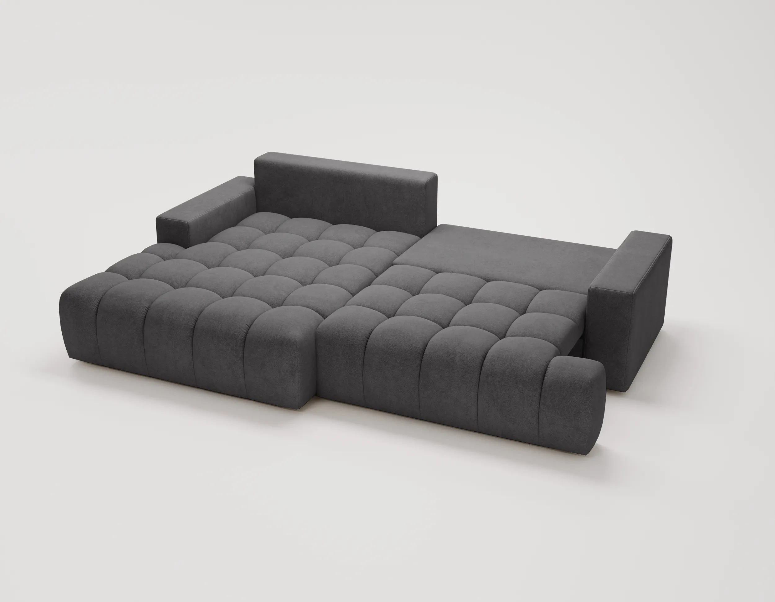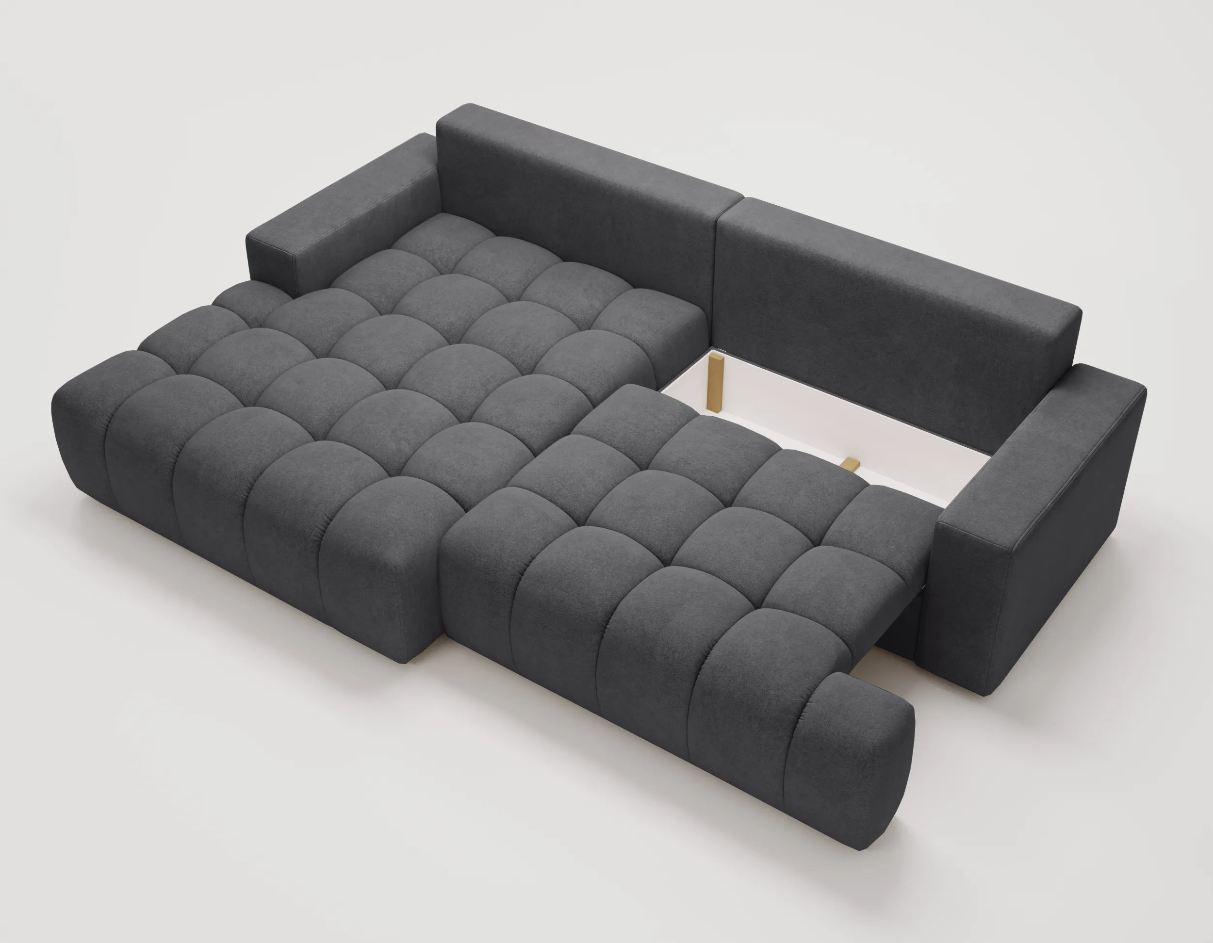 Narożnik Nubi to nie tylko estetyka, ale również funkcjonalność. Wyposażony w funkcję spania, szybko zmienia się w wygodne miejsce do odpoczynku nocnego. Dodatkowy pojemnik na pościel ułatwia przechowywanie i pomaga utrzymać porządek w salonie.