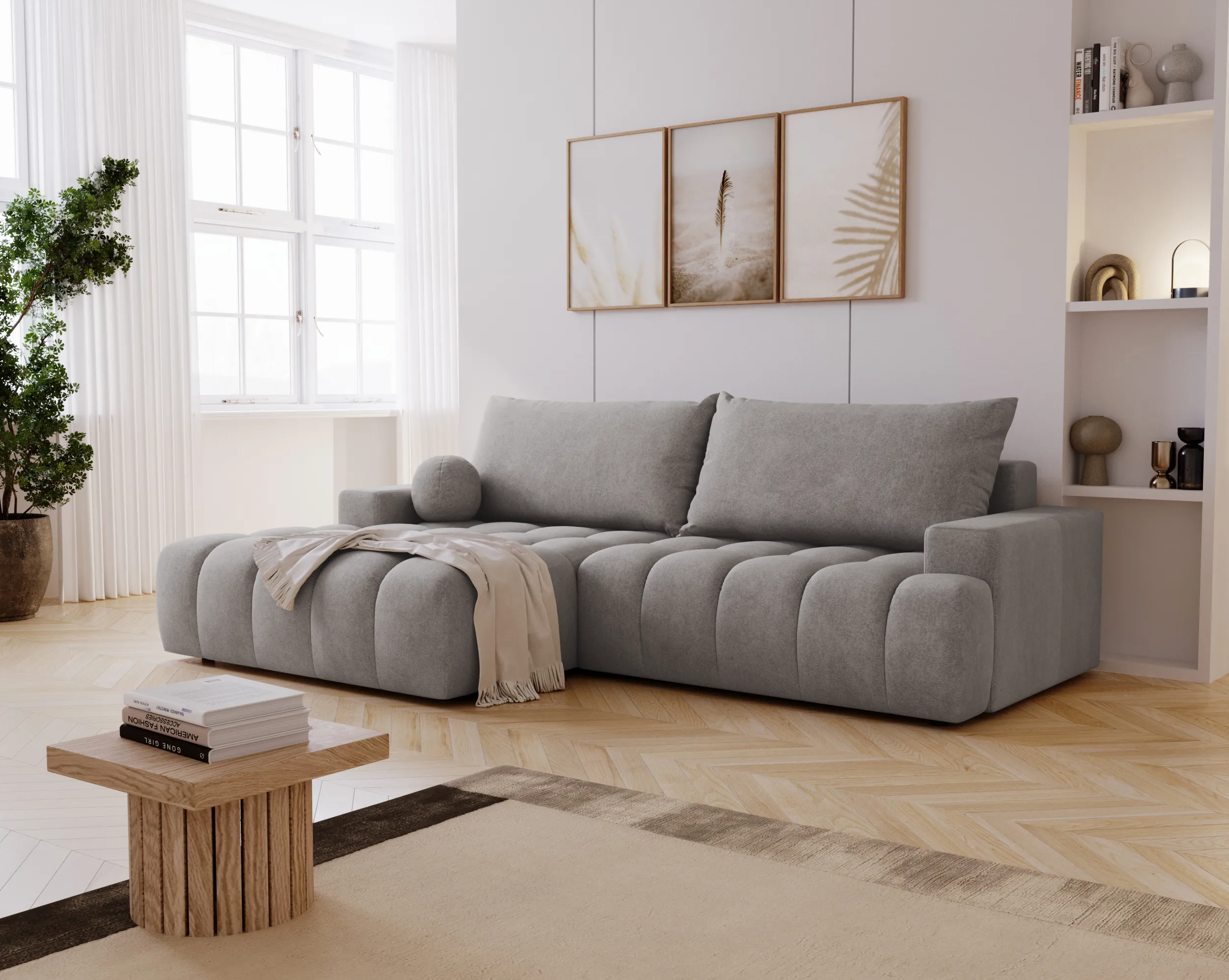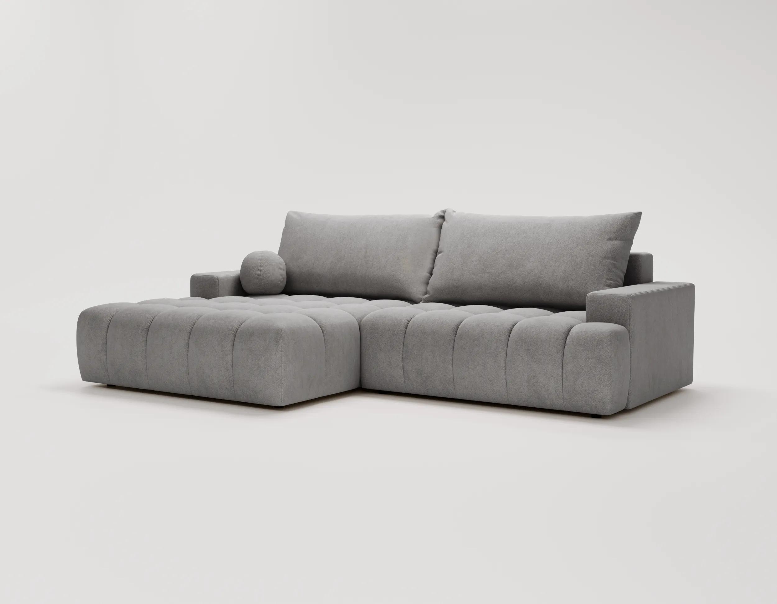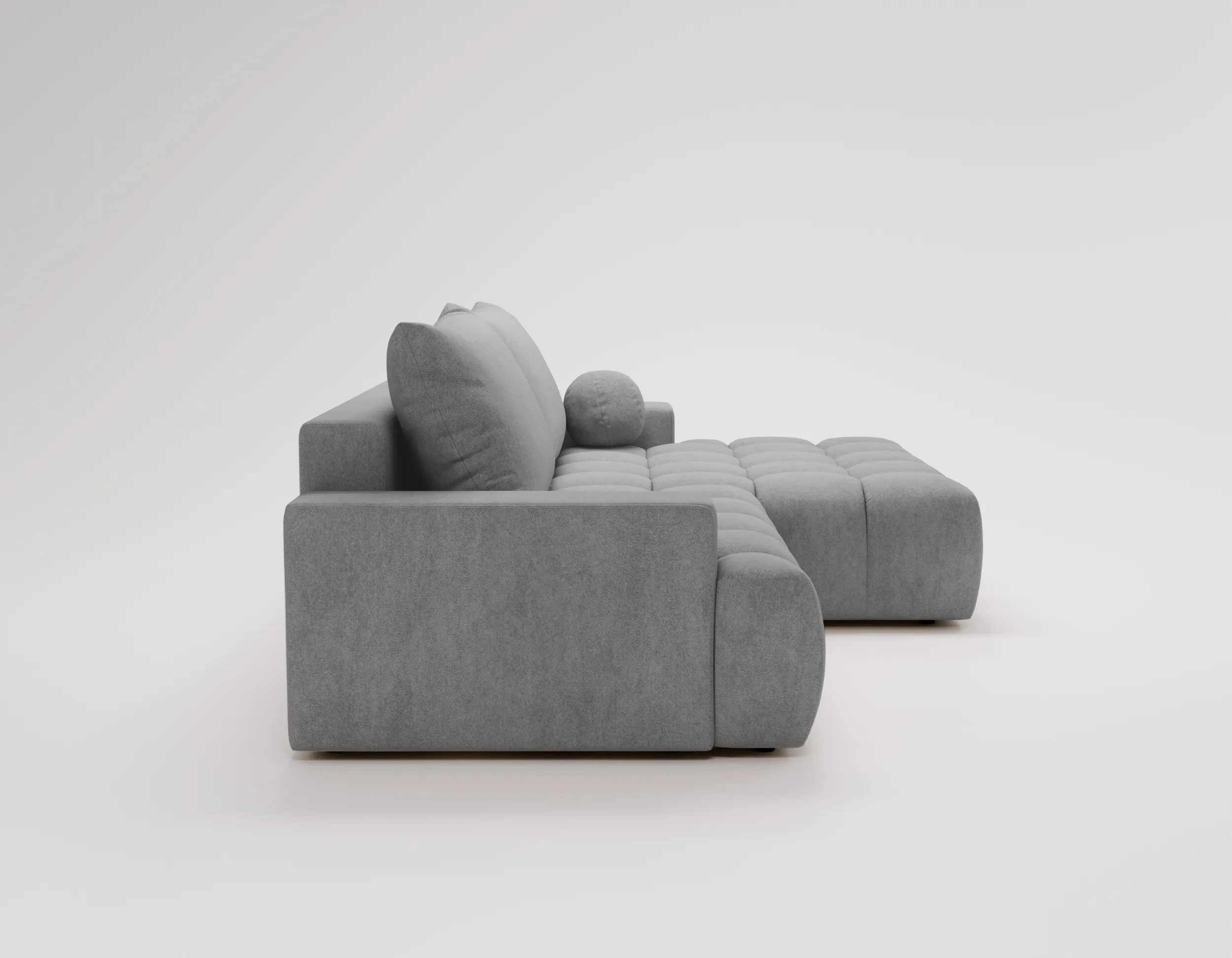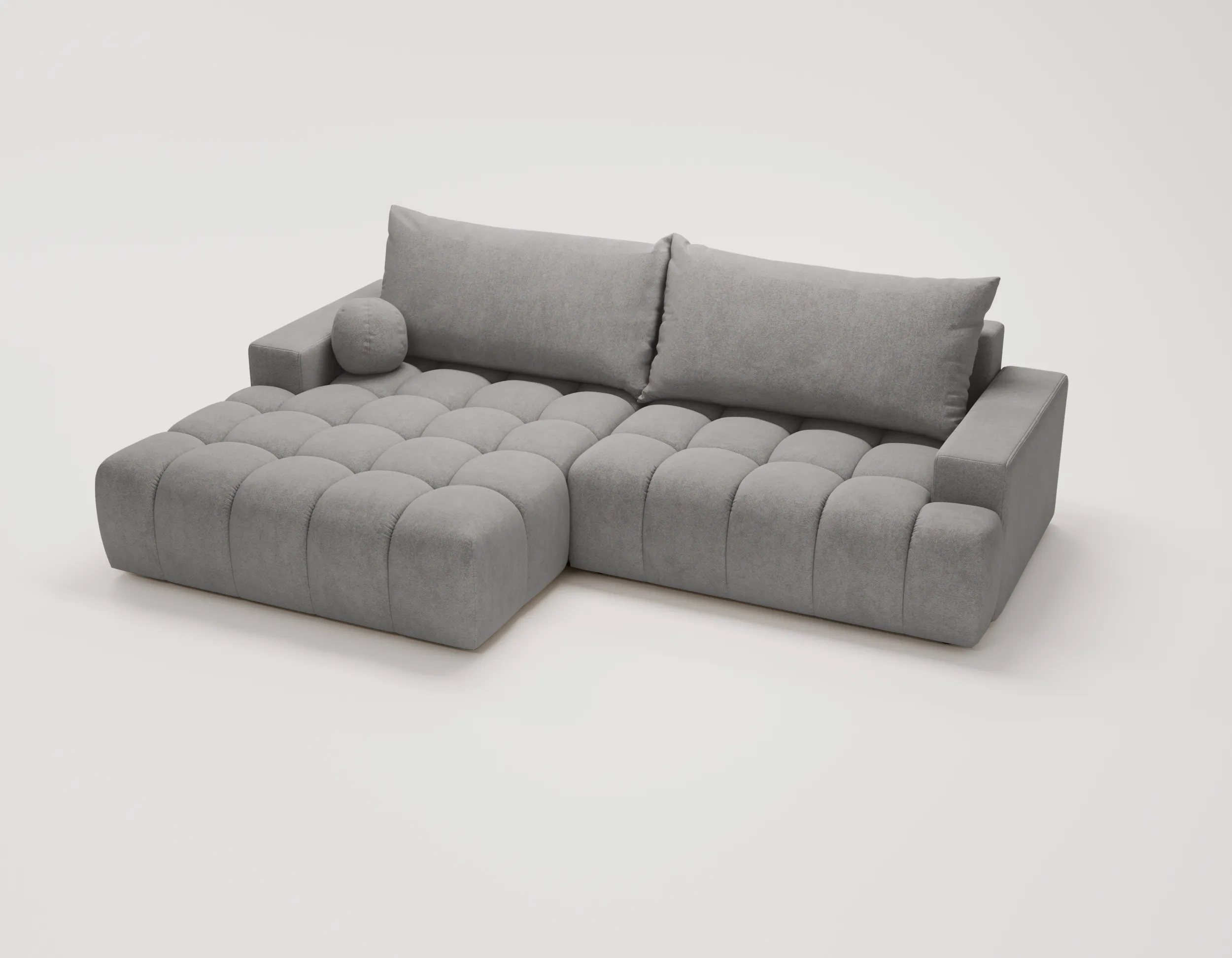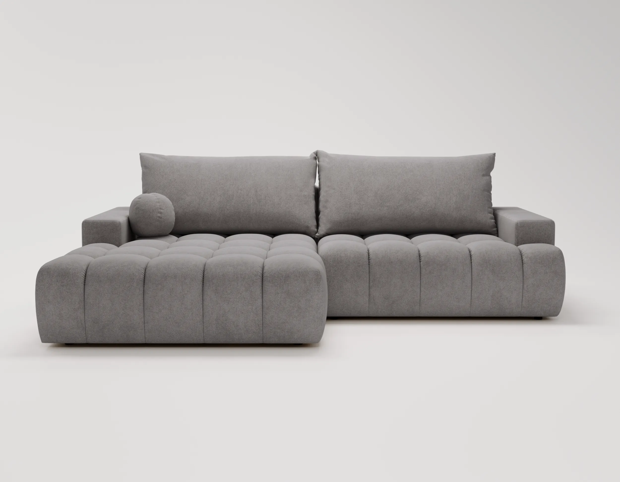 Narożnik Nubi to nie tylko estetyka, ale również funkcjonalność. Wyposażony w funkcję spania, szybko zmienia się w wygodne miejsce do odpoczynku nocnego. Dodatkowy pojemnik na pościel ułatwia przechowywanie i pomaga utrzymać porządek w salonie.