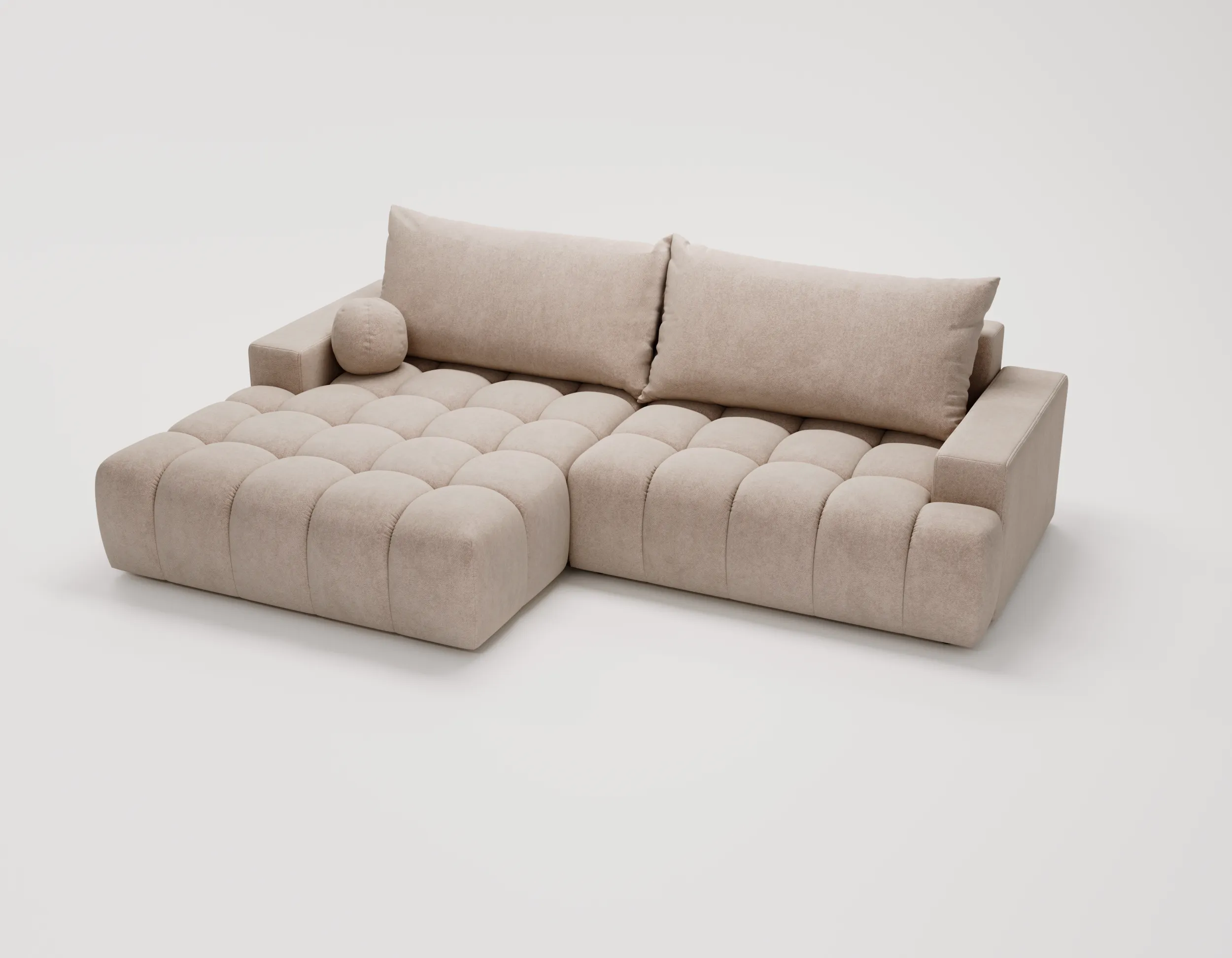Narożnik Nubi to nie tylko estetyka, ale również funkcjonalność. Wyposażony w funkcję spania, szybko zmienia się w wygodne miejsce do odpoczynku nocnego. Dodatkowy pojemnik na pościel ułatwia przechowywanie i pomaga utrzymać porządek w salonie.