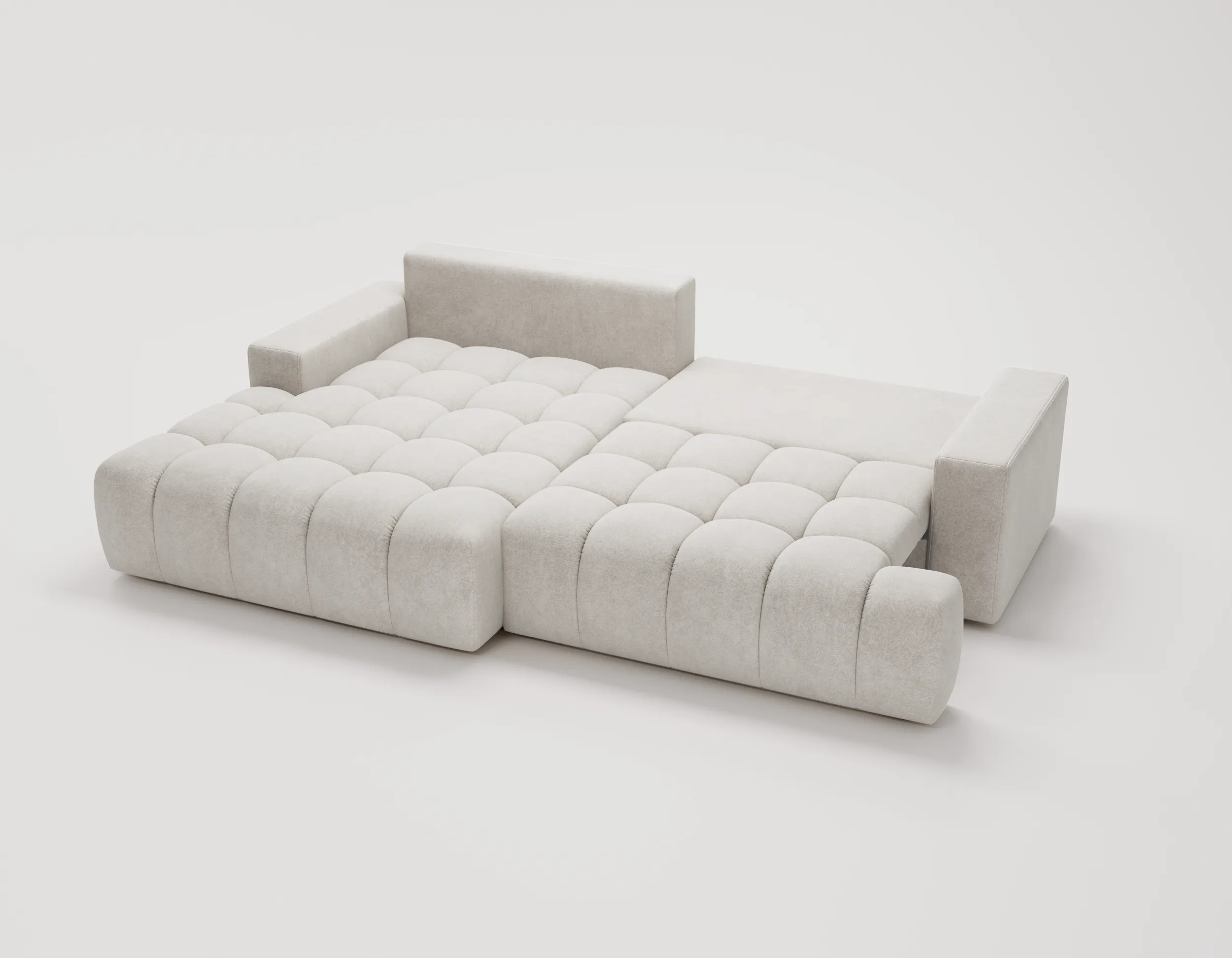 Narożnik Nubi to nie tylko estetyka, ale również funkcjonalność. Wyposażony w funkcję spania, szybko zmienia się w wygodne miejsce do odpoczynku nocnego. Dodatkowy pojemnik na pościel ułatwia przechowywanie i pomaga utrzymać porządek w salonie.