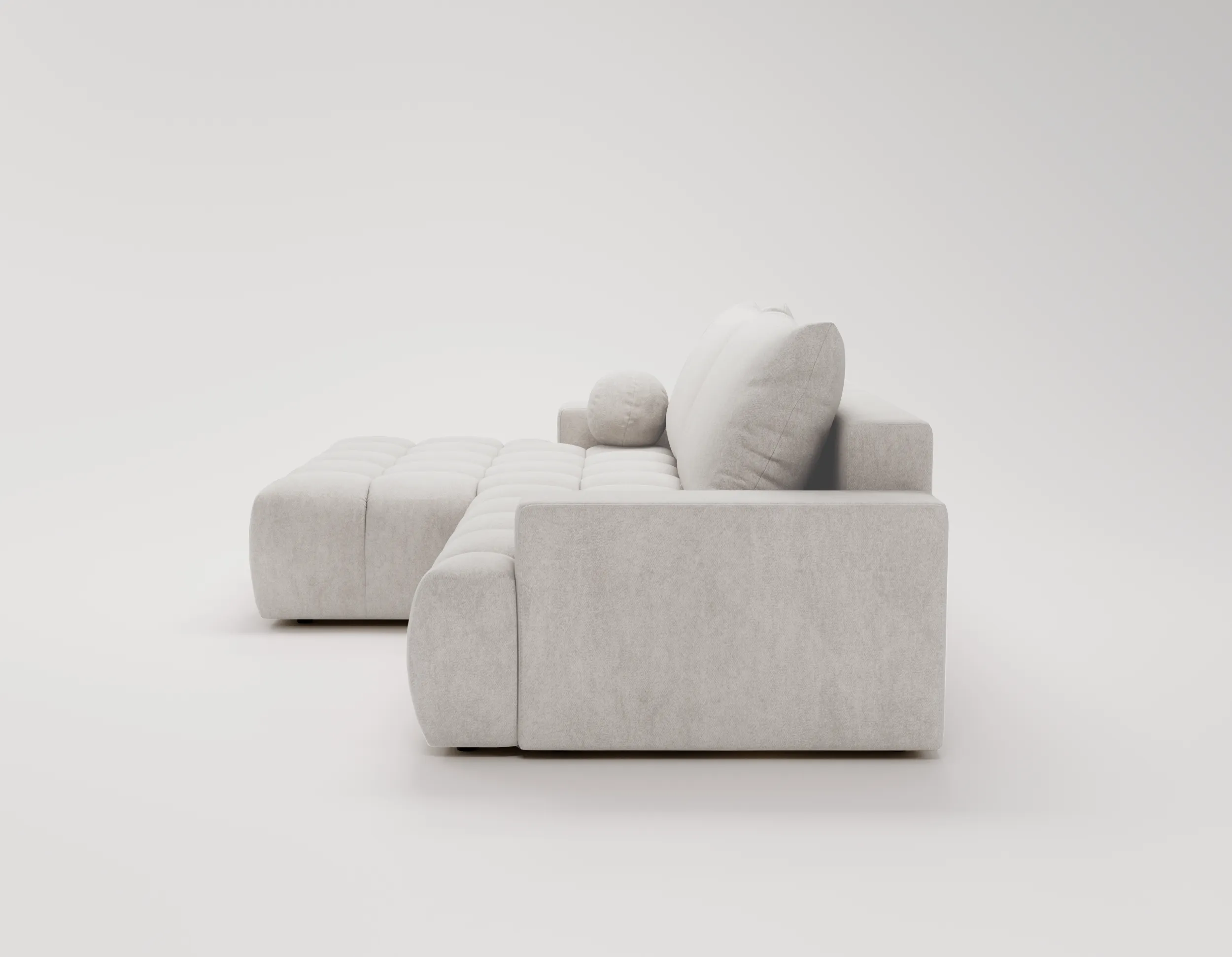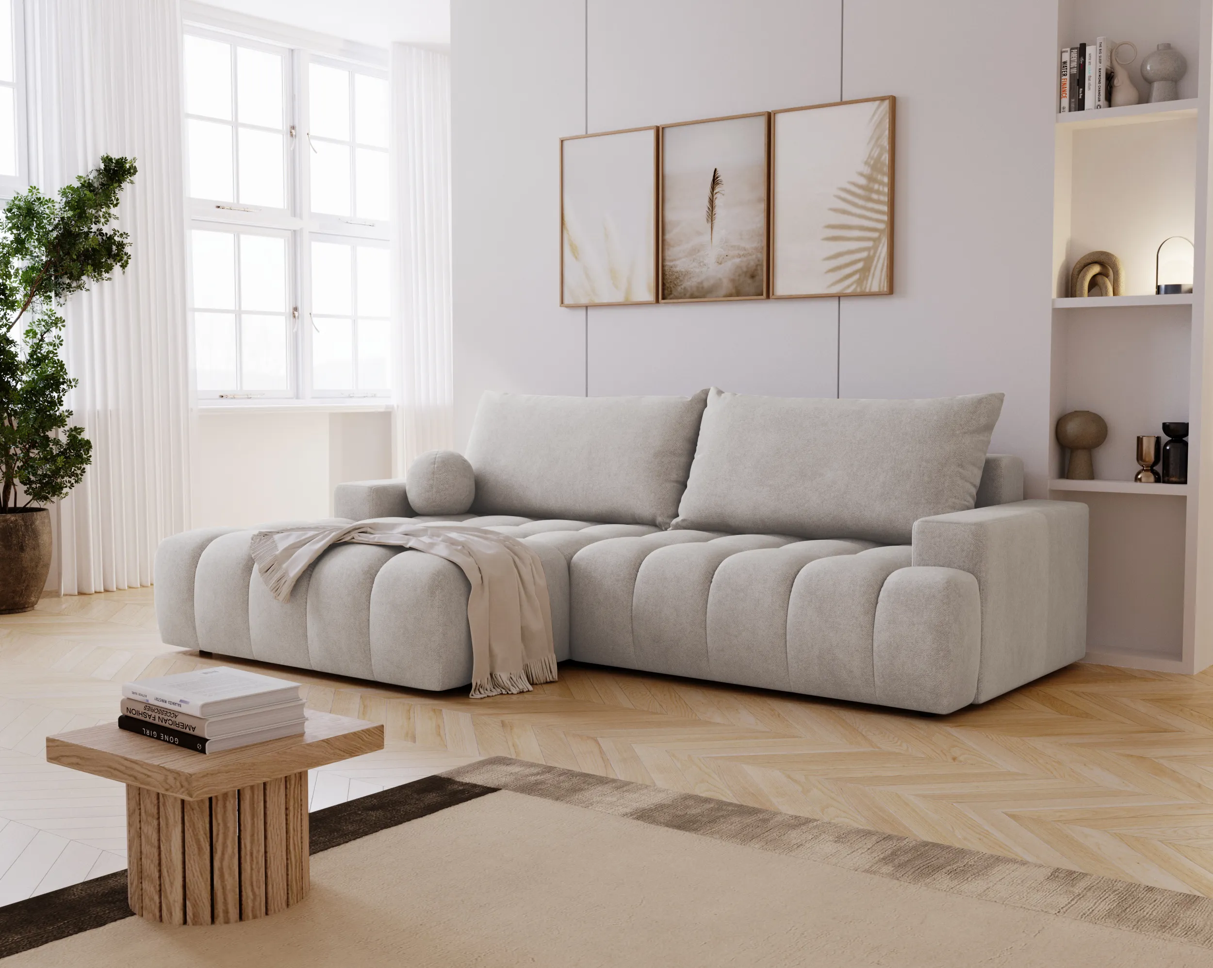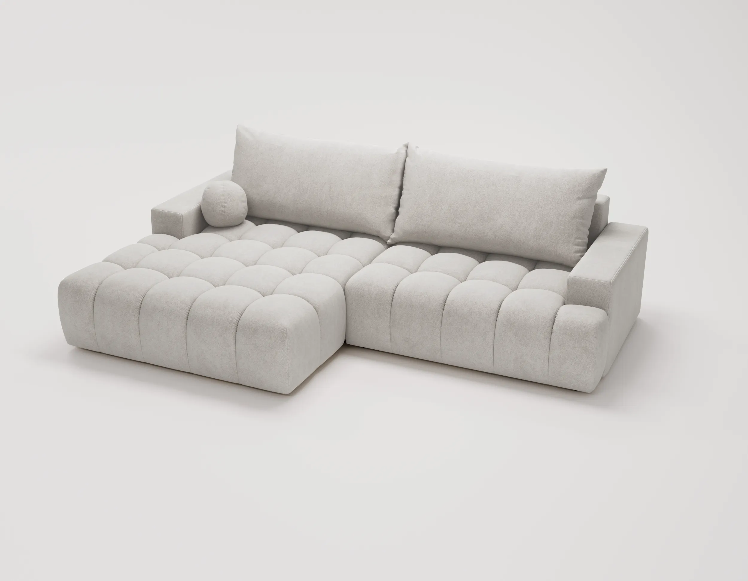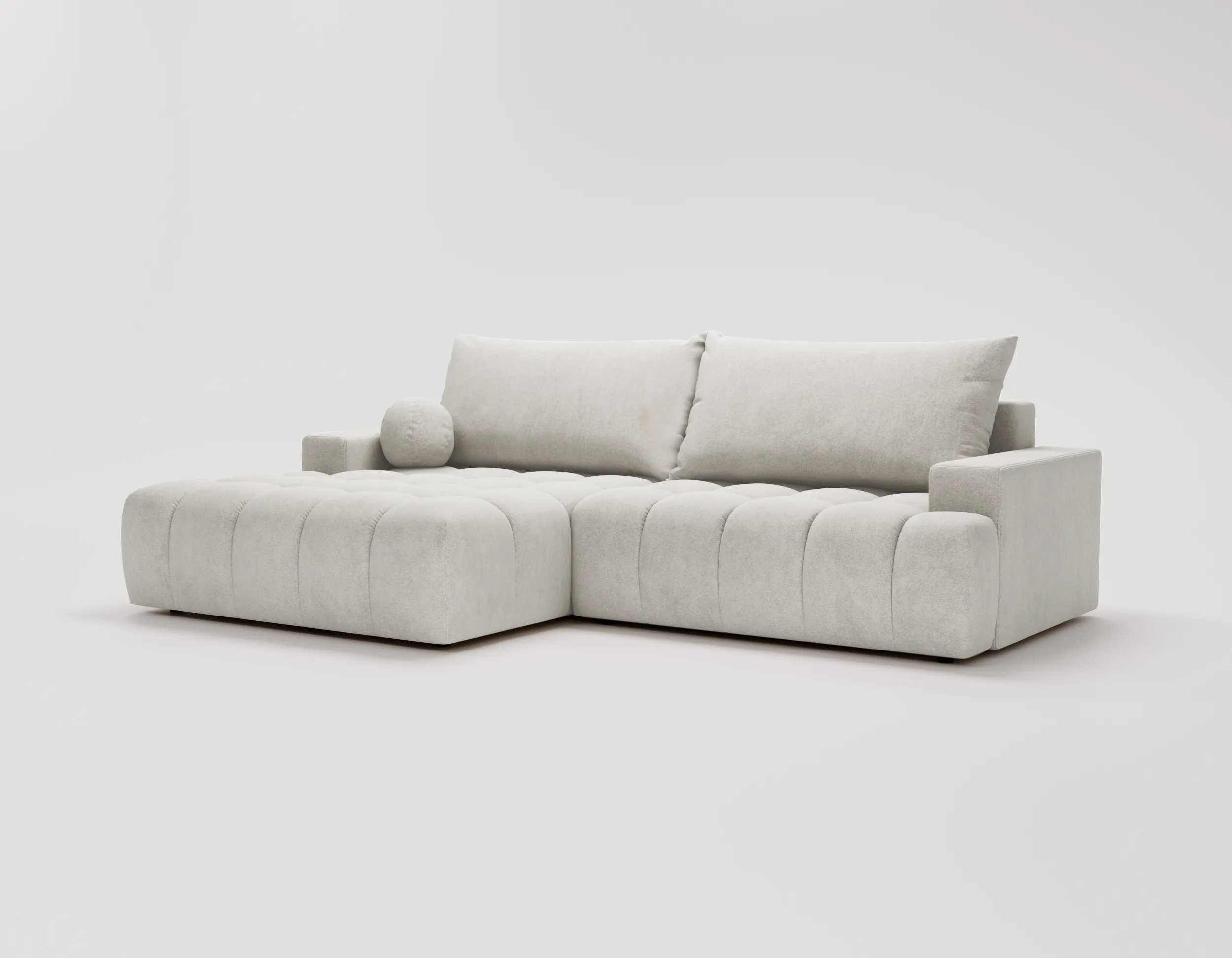 Narożnik Nubi to nie tylko estetyka, ale również funkcjonalność. Wyposażony w funkcję spania, szybko zmienia się w wygodne miejsce do odpoczynku nocnego. Dodatkowy pojemnik na pościel ułatwia przechowywanie i pomaga utrzymać porządek w salonie.