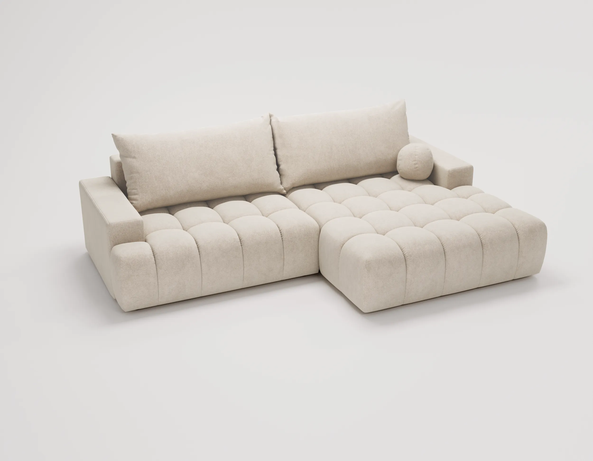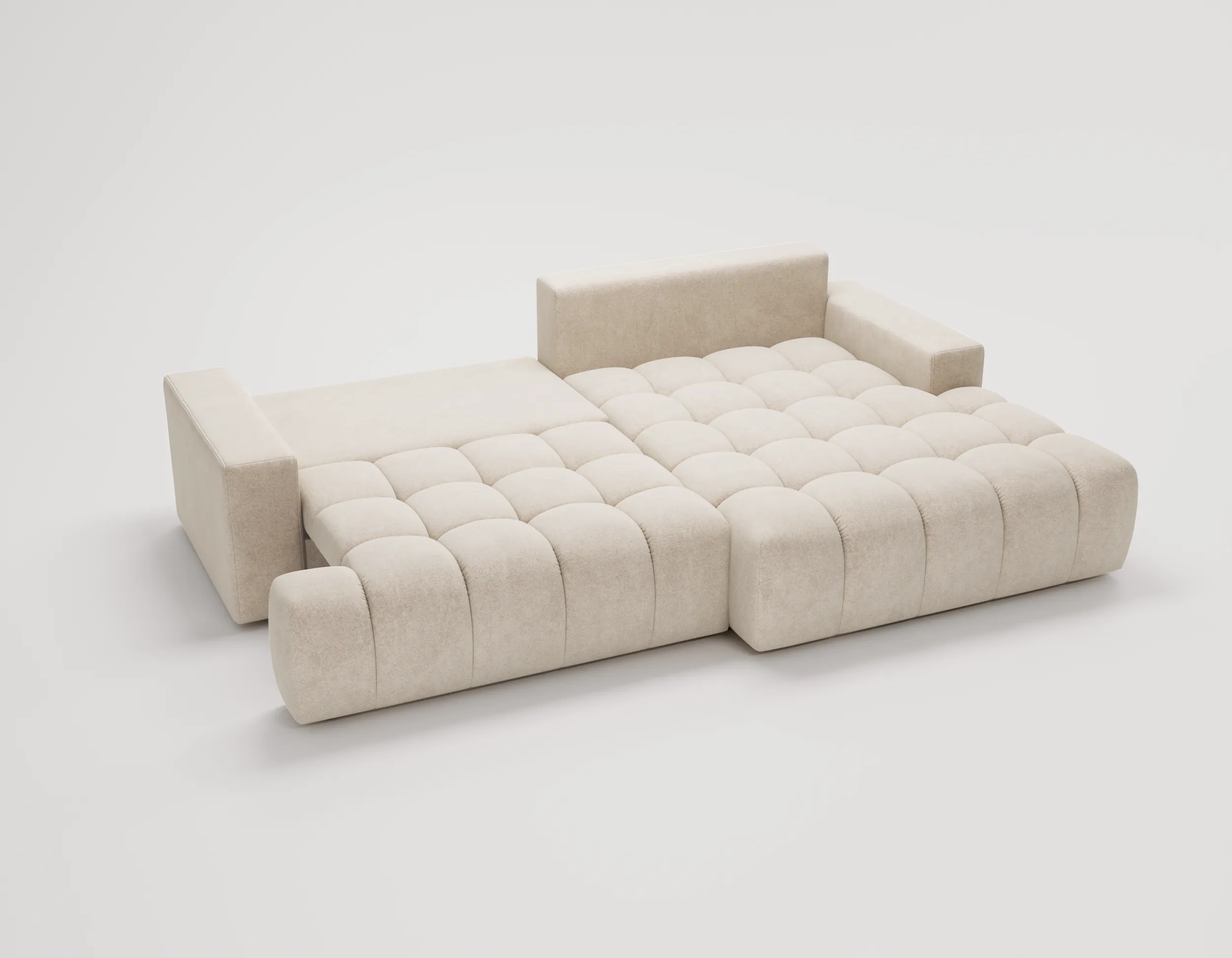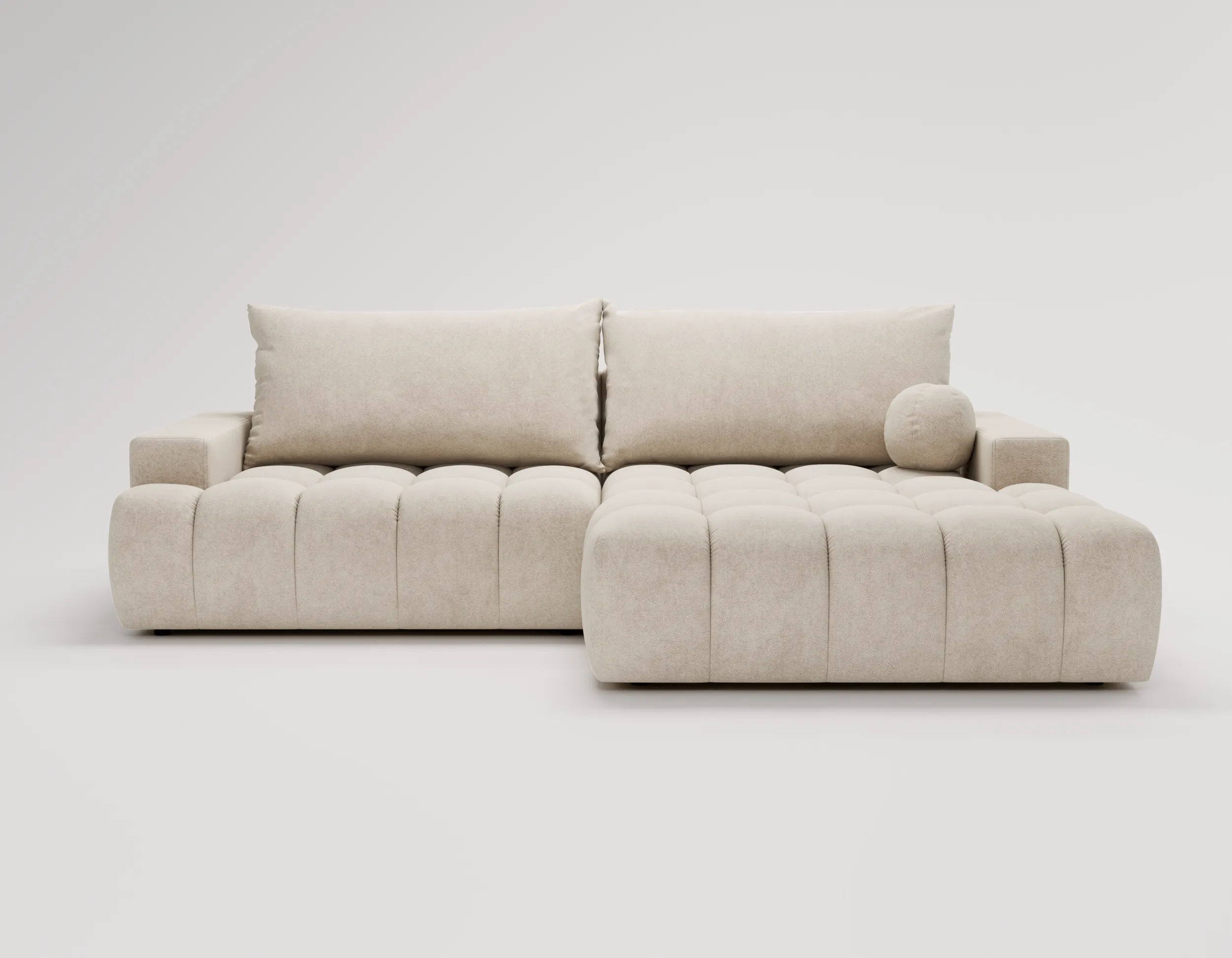 Narożnik Nubi to nie tylko estetyka, ale również funkcjonalność. Wyposażony w funkcję spania, szybko zmienia się w wygodne miejsce do odpoczynku nocnego. Dodatkowy pojemnik na pościel ułatwia przechowywanie i pomaga utrzymać porządek w salonie.