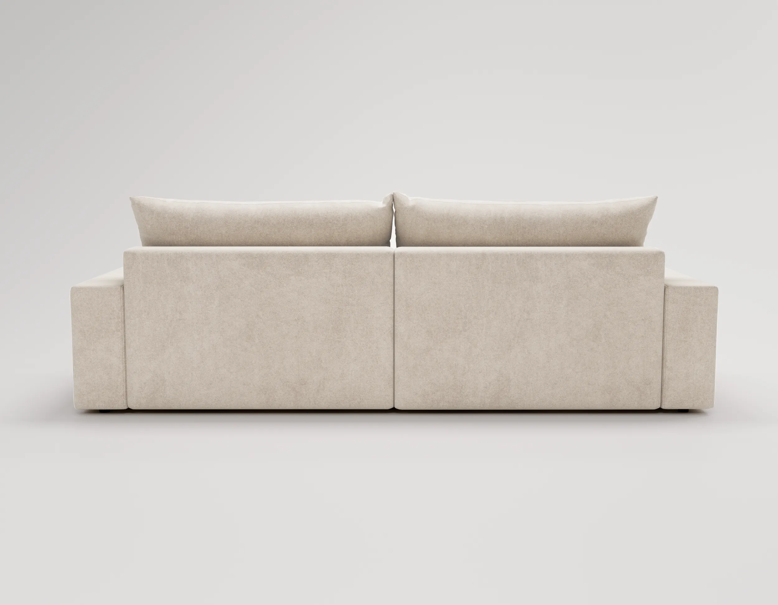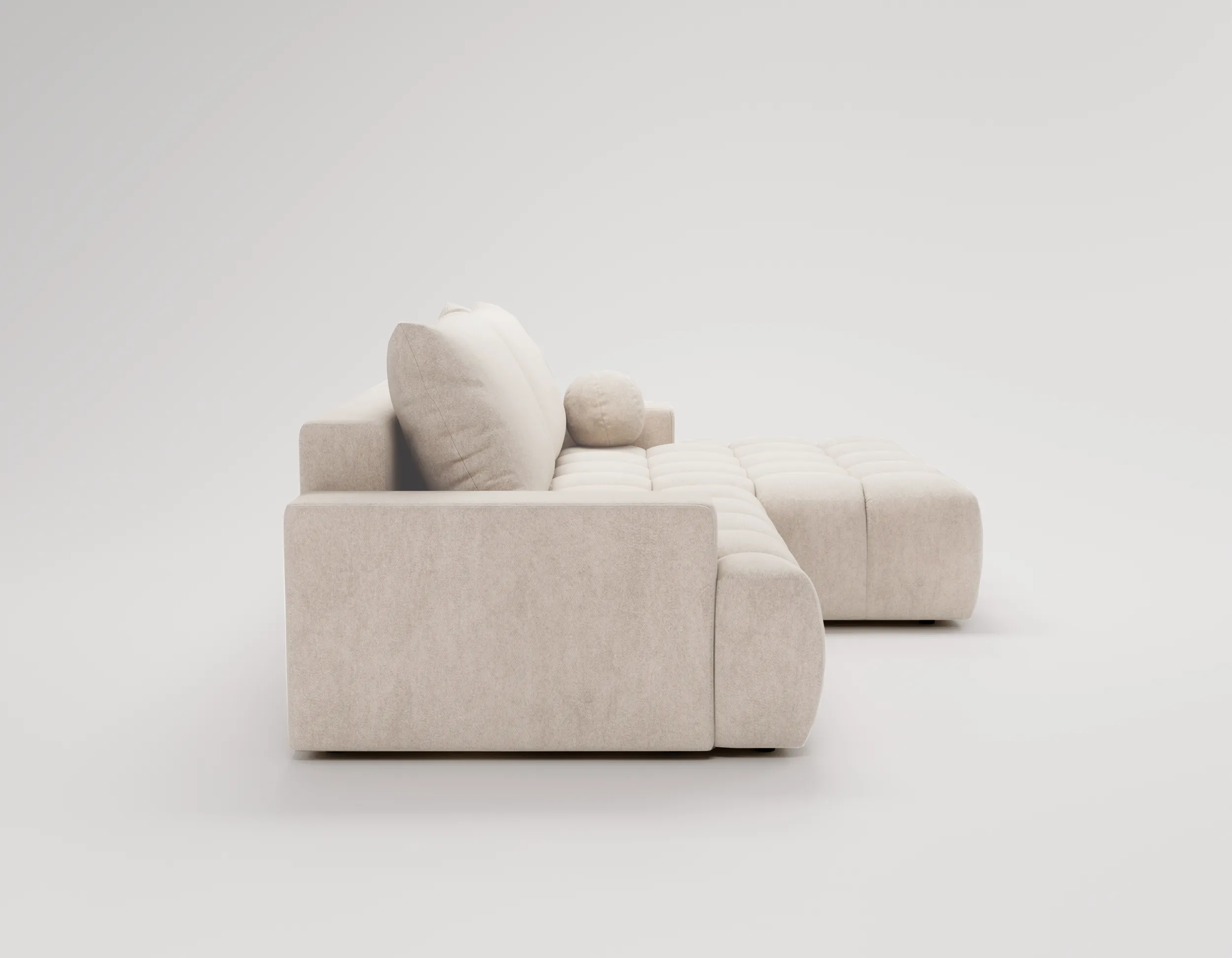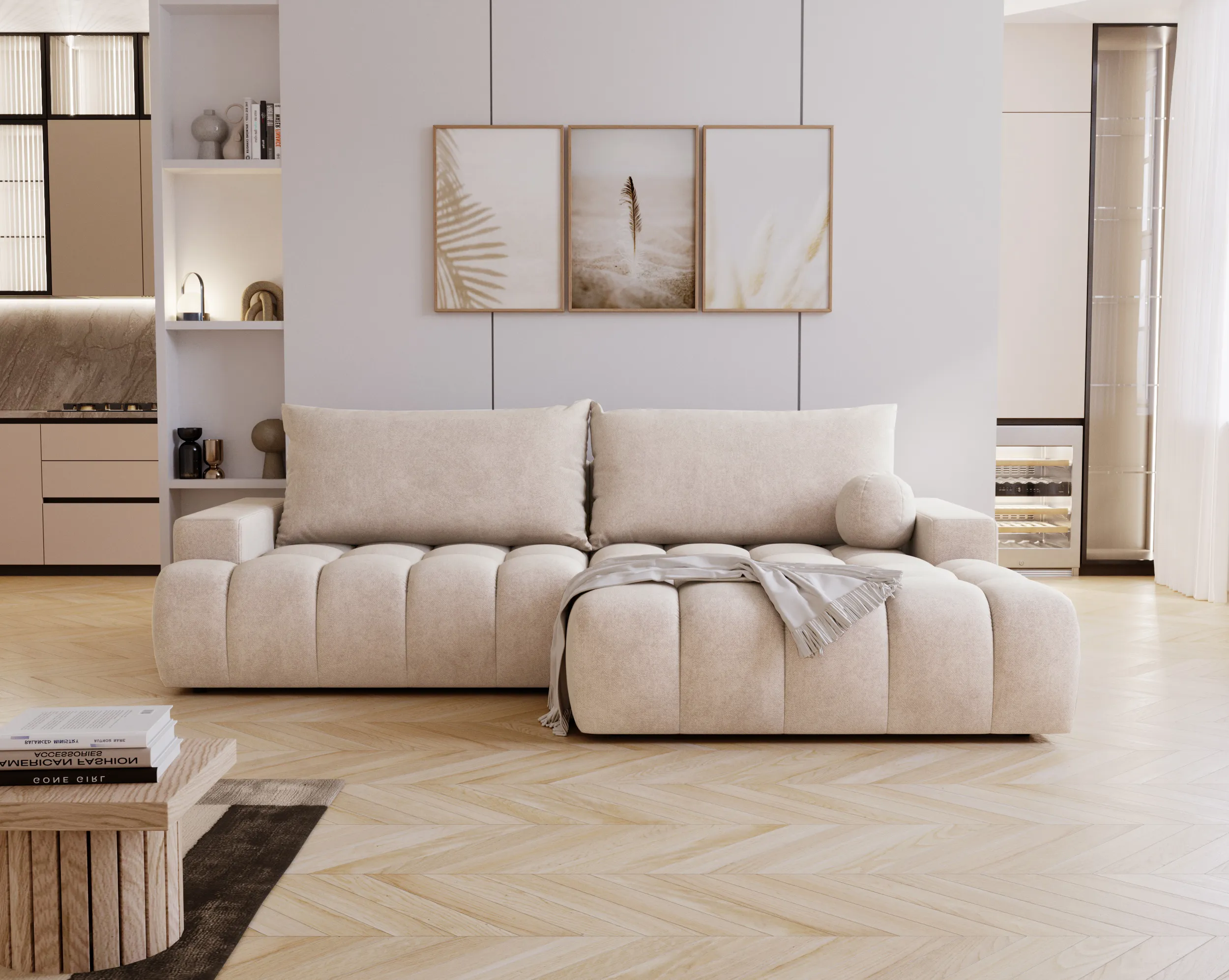Narożnik Nubi to nie tylko estetyka, ale również funkcjonalność. Wyposażony w funkcję spania, szybko zmienia się w wygodne miejsce do odpoczynku nocnego. Dodatkowy pojemnik na pościel ułatwia przechowywanie i pomaga utrzymać porządek w salonie.