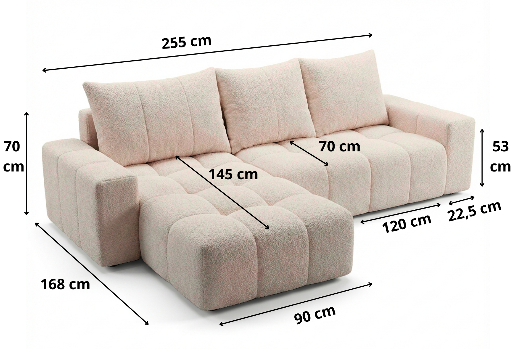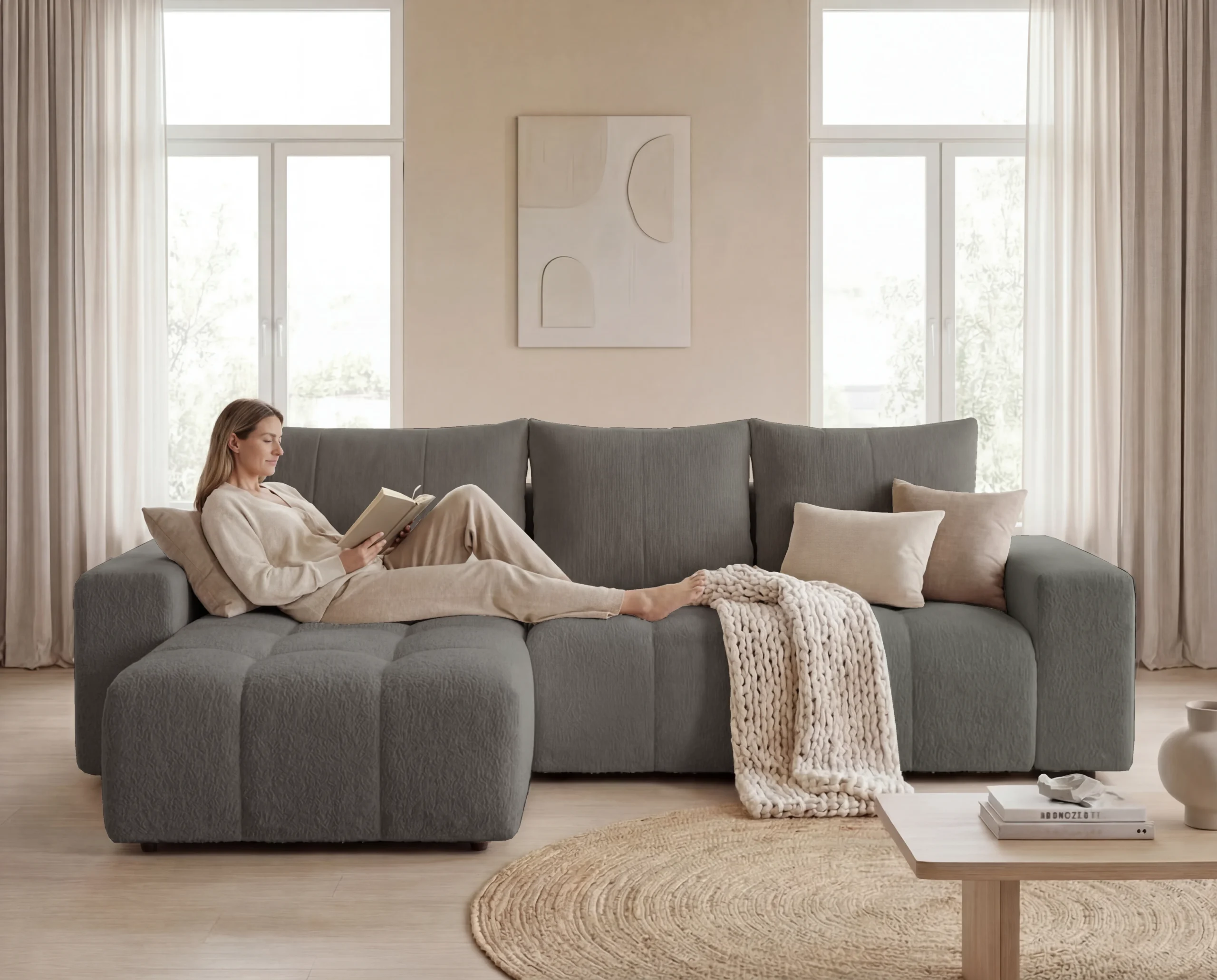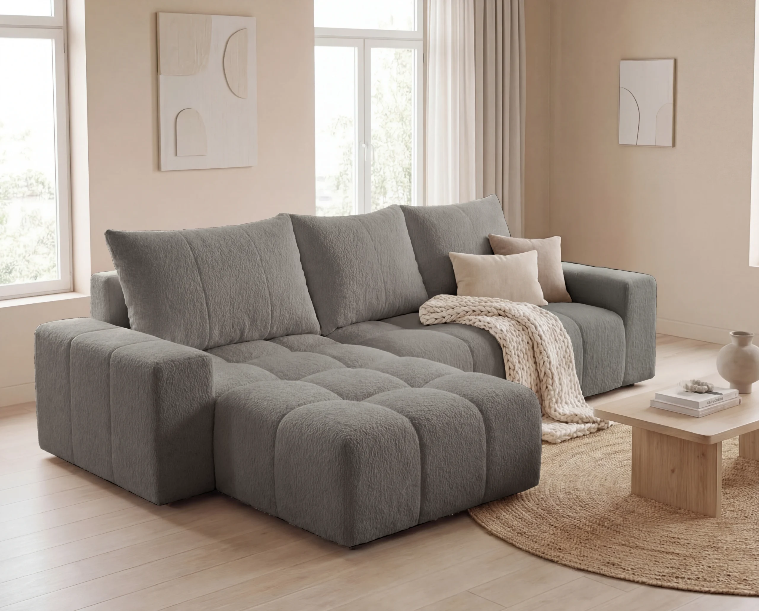 Postaw na narożnik L do salonu w tkaninie bouclé, który łączy styl, wygodę i funkcjonalność. To mebel, który stanie się centralnym punktem Twojego wnętrza i zapewni komfort na lata.