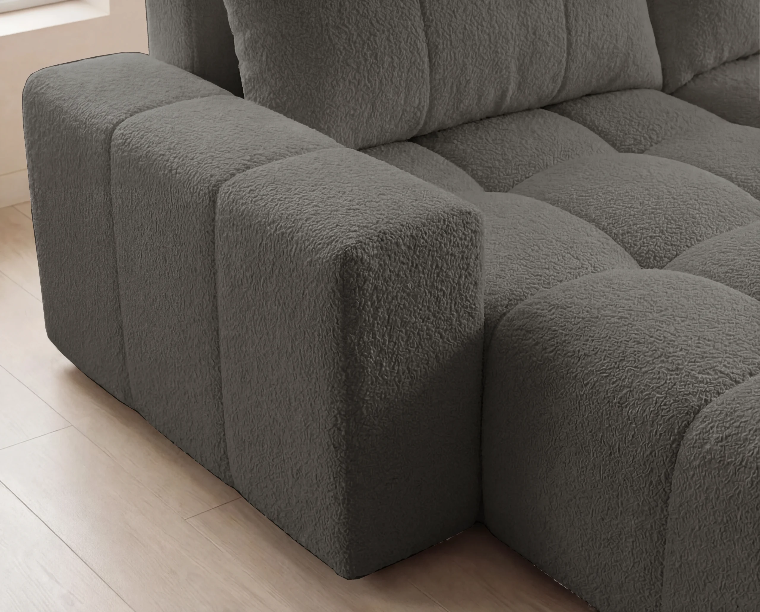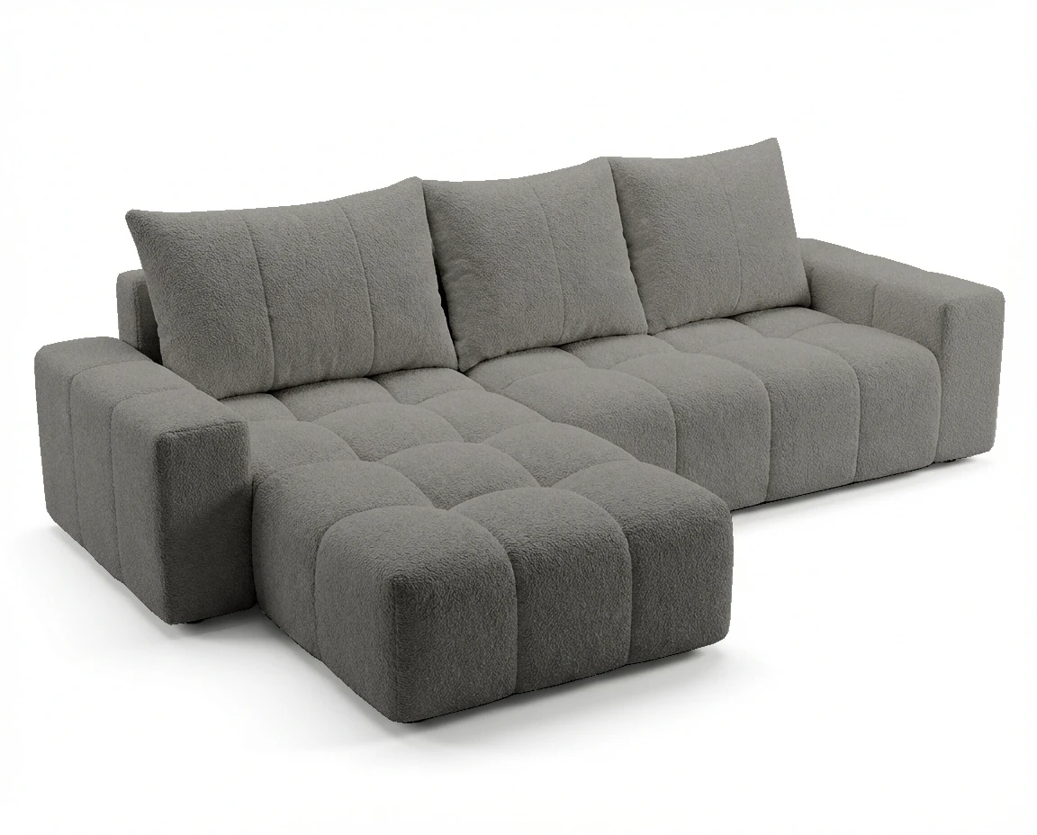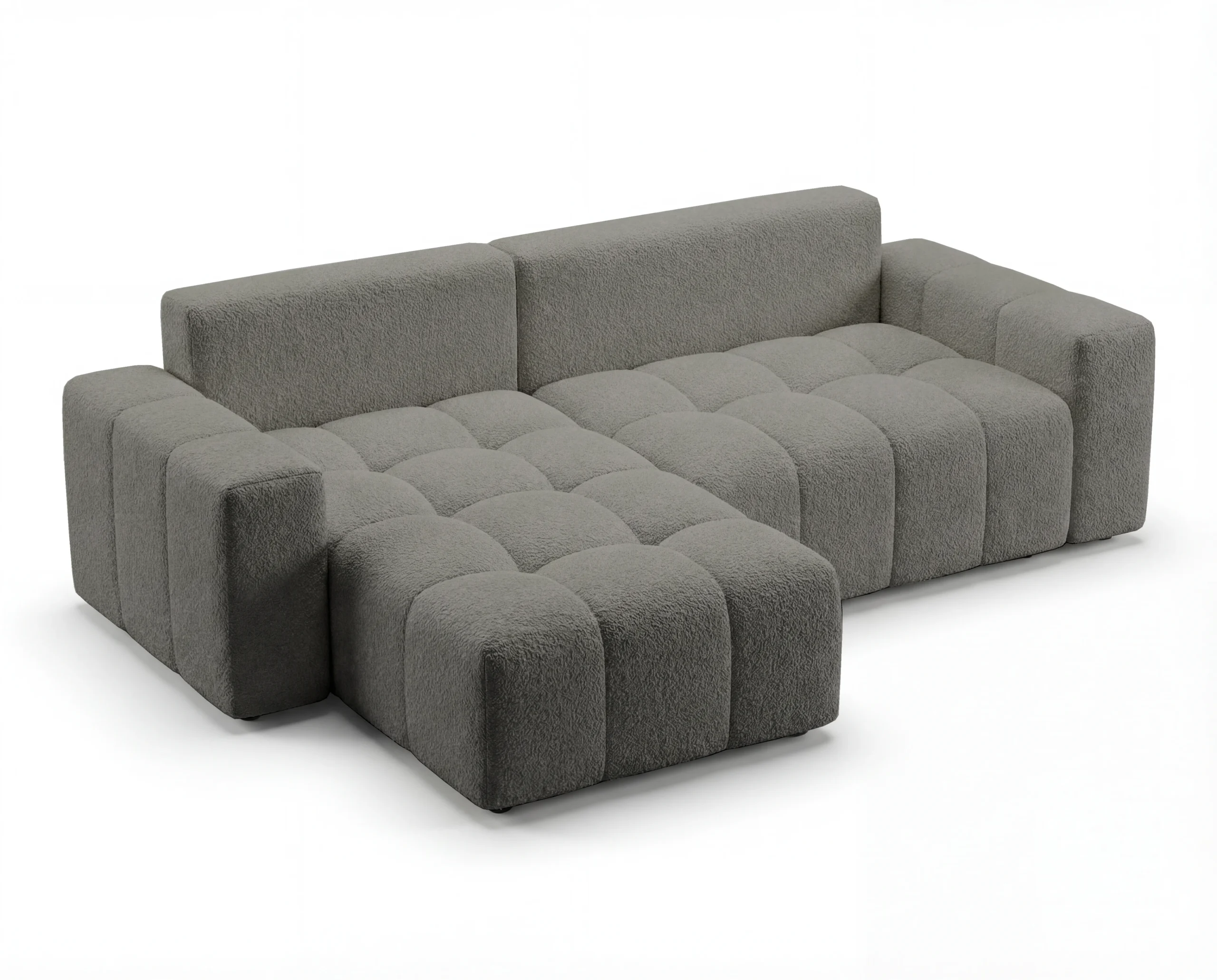 Narożnik uniwersalny L z głębokim pikowaniem – tkanina Lambi (bouclé) – styl boho