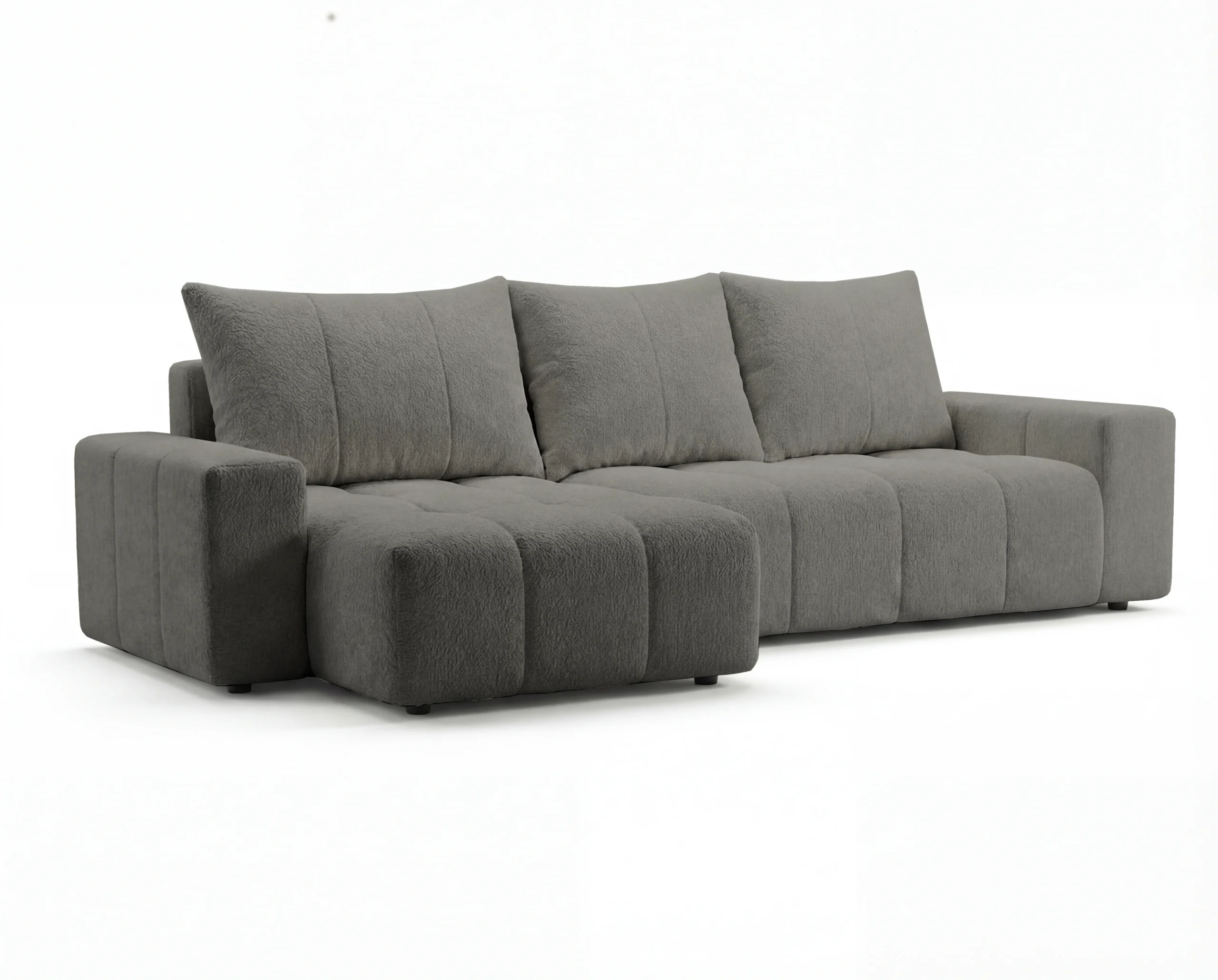 Nowoczesny narożnik w kształcie litery L to połączenie wyjątkowego designu, komfortu i funkcjonalności. Model wyróżnia się głębokimi pikowaniami, które nadają mu luksusowy, designerski charakter oraz podkreślają miękką, przytulną formę mebla. To idealny narożnik do salonu urządzonego w stylu boho, japandi, nowoczesnym lub soft loft.