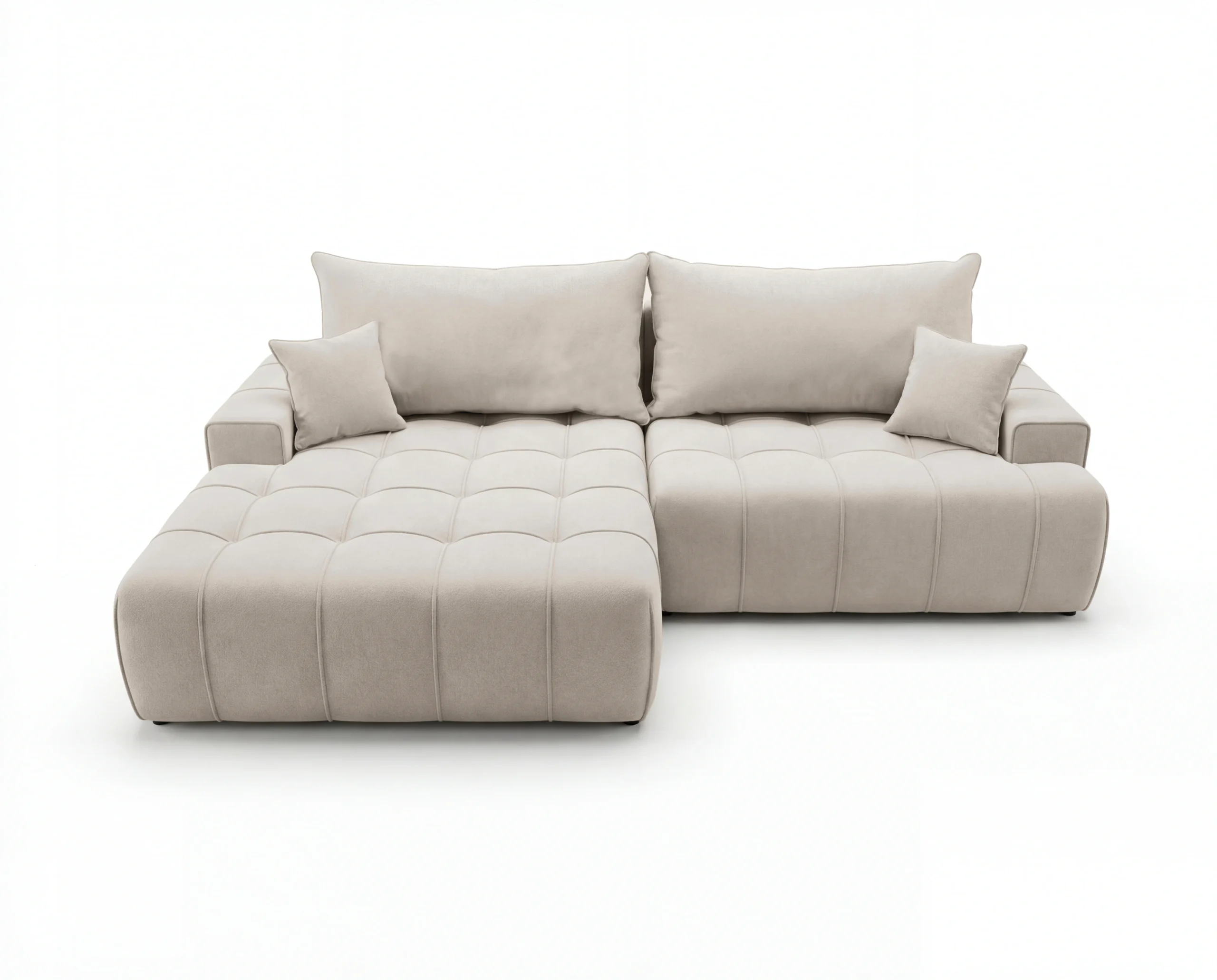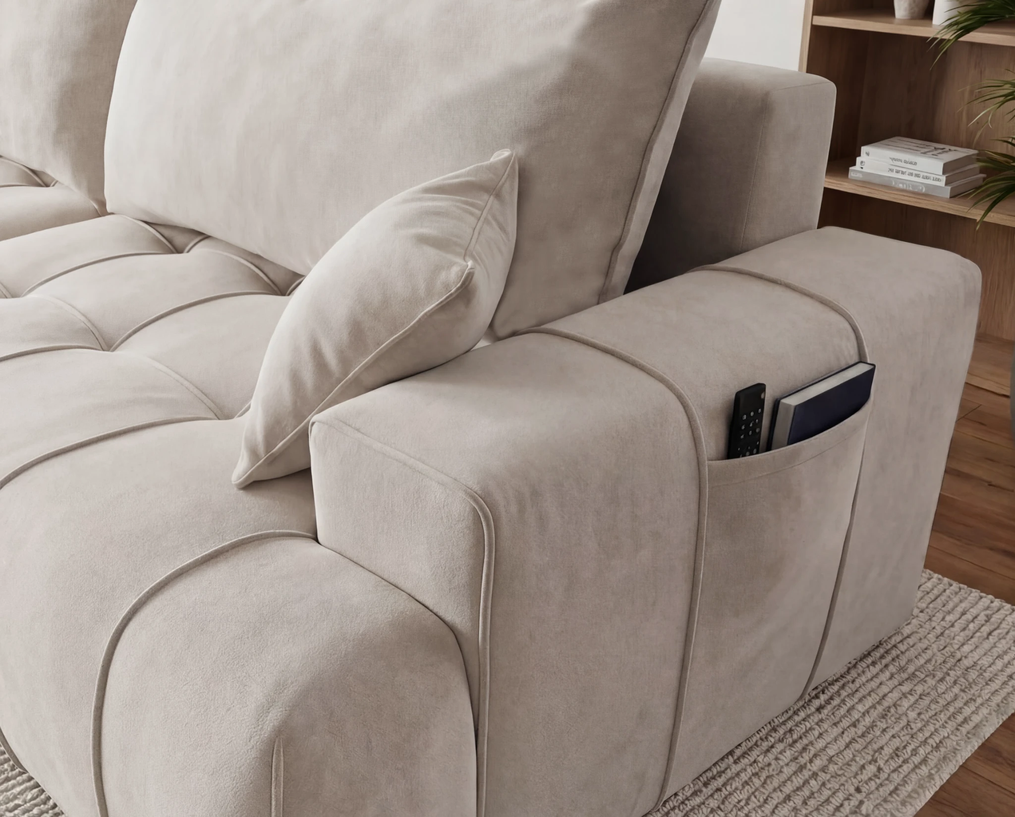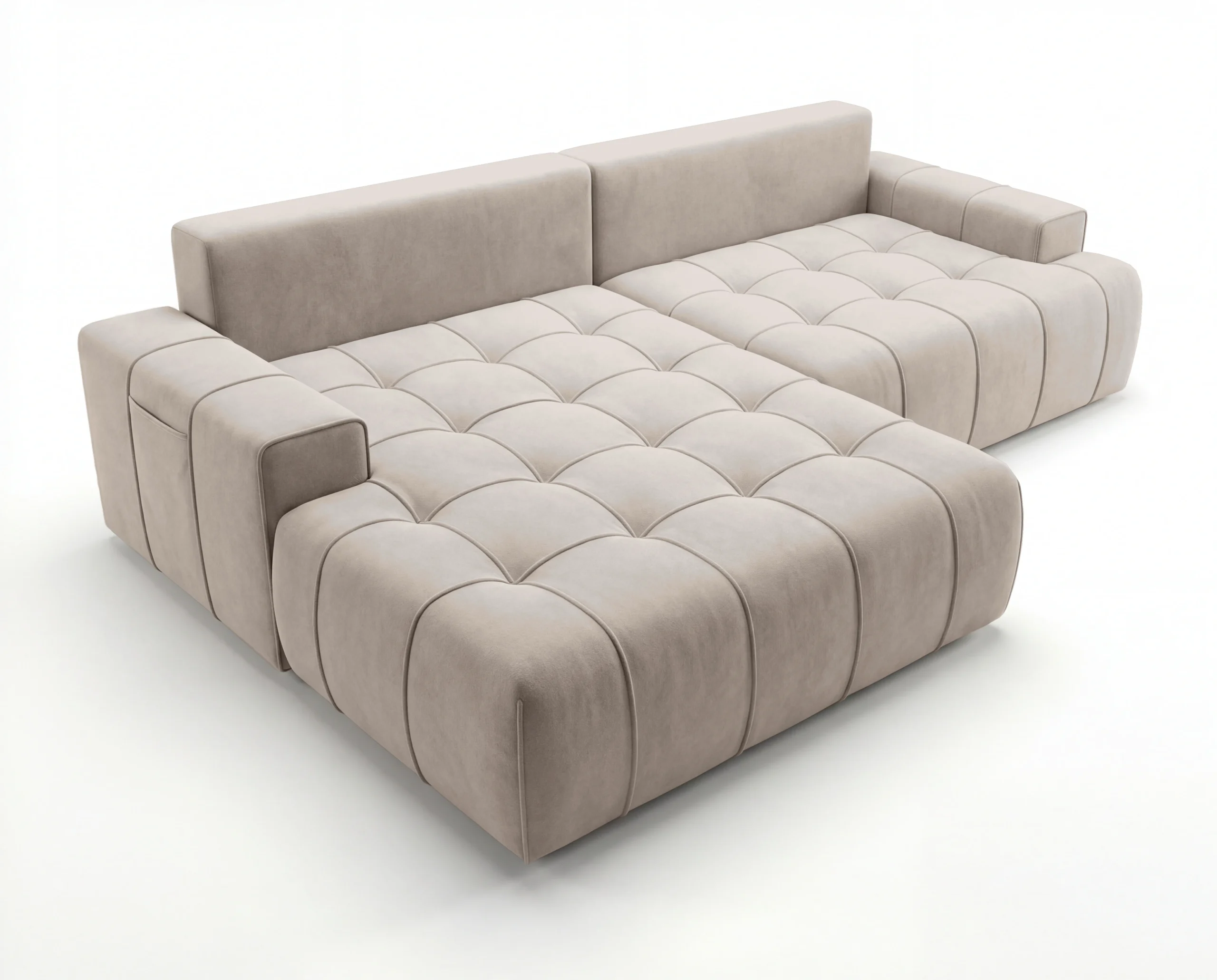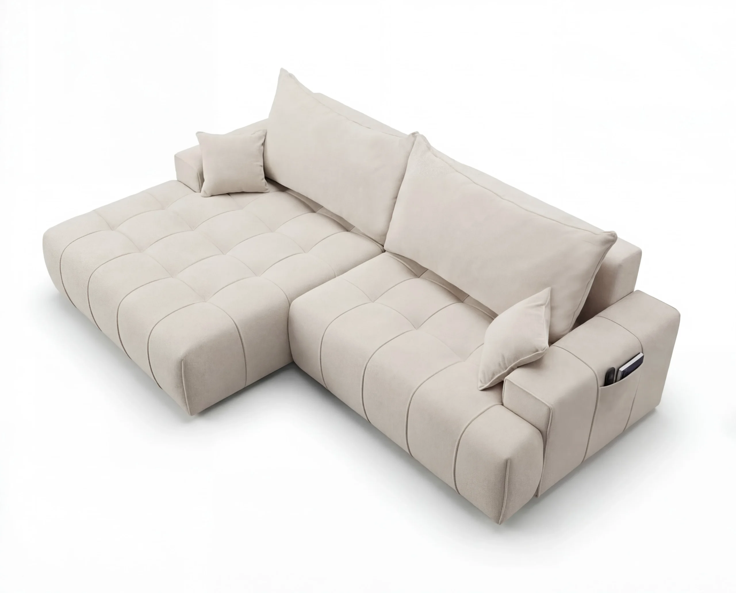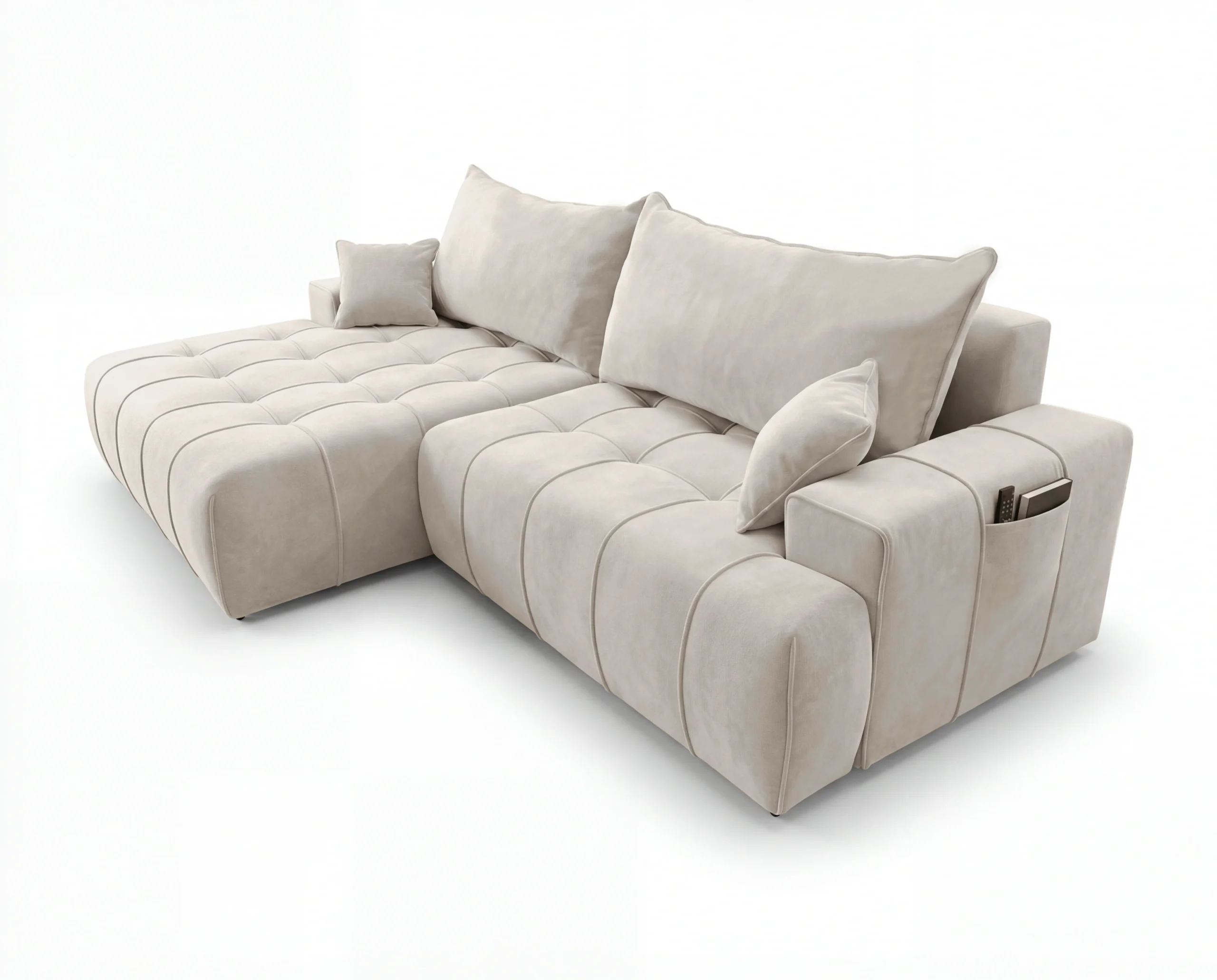 Dodatkowym atutem są praktyczne kieszonki na boczkach, idealne na książkę, pilot czy telefon. To wolnostojący narożnik tapicerowany, doskonały wybór do nowoczesnego salonu, mieszkania lub apartamentu, gdzie liczy się wygoda i estetyka.