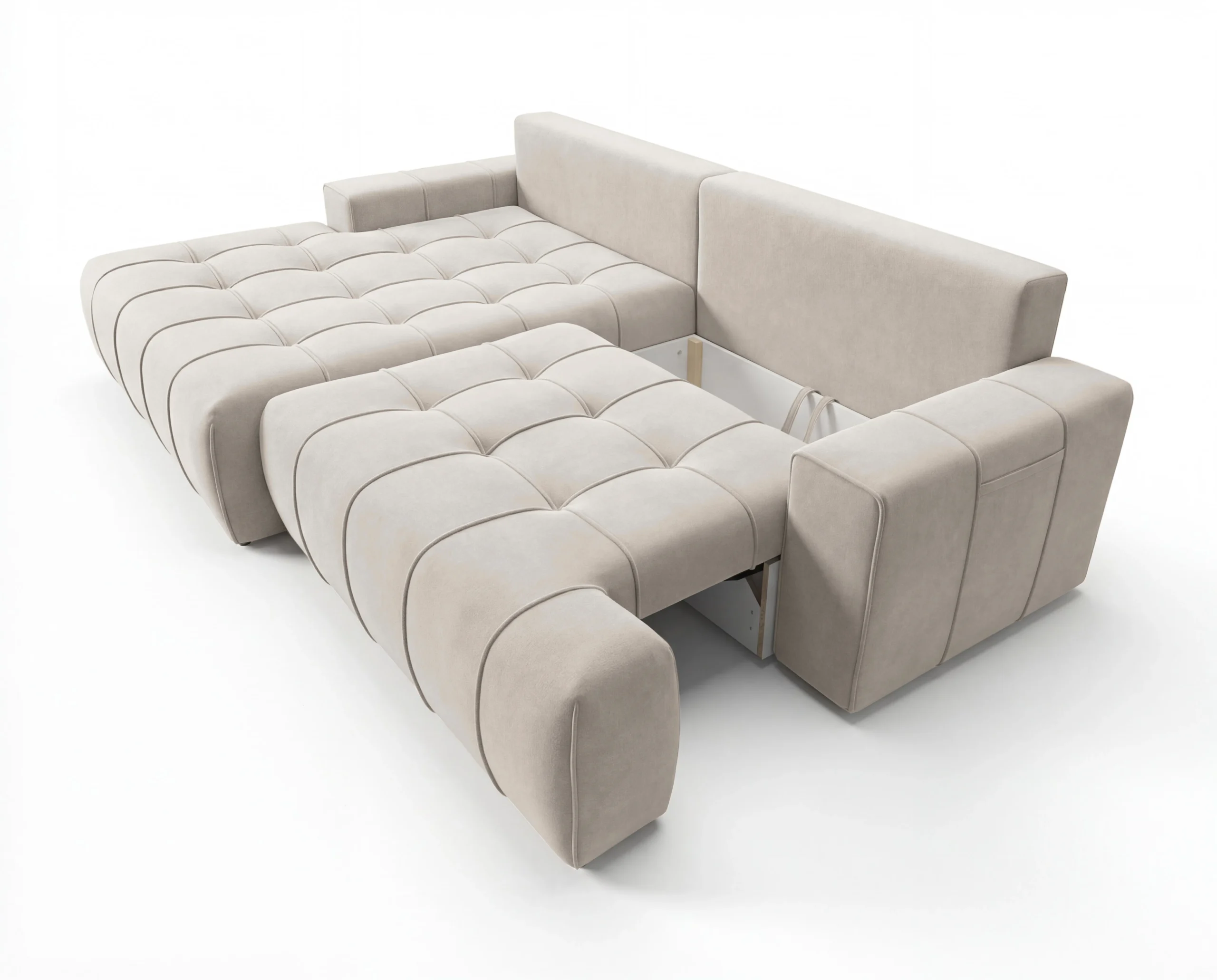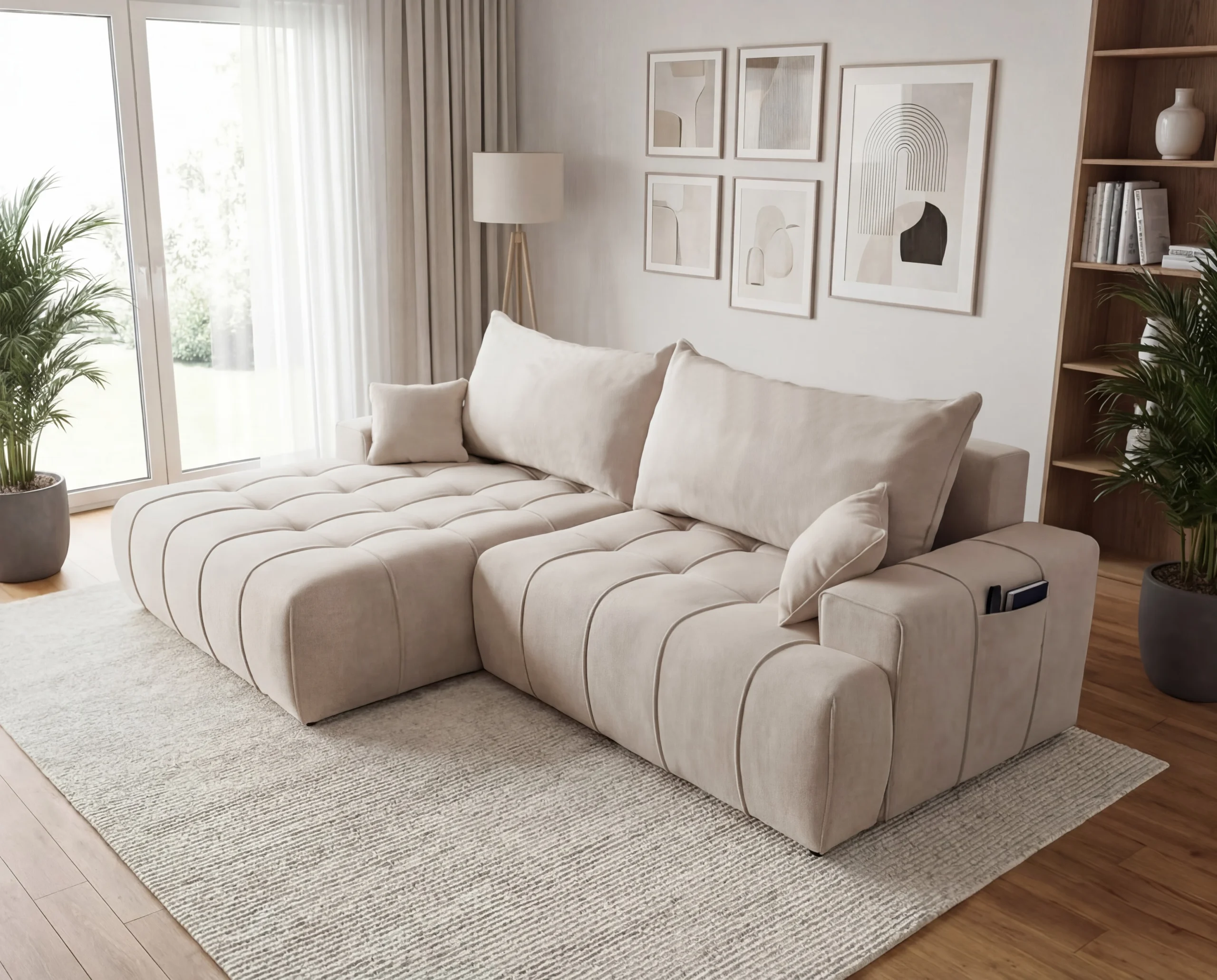 Nowoczesny narożnik z funkcją spania, pojemnikiem i kieszonką na boczkach Capri lewostronny beżowy