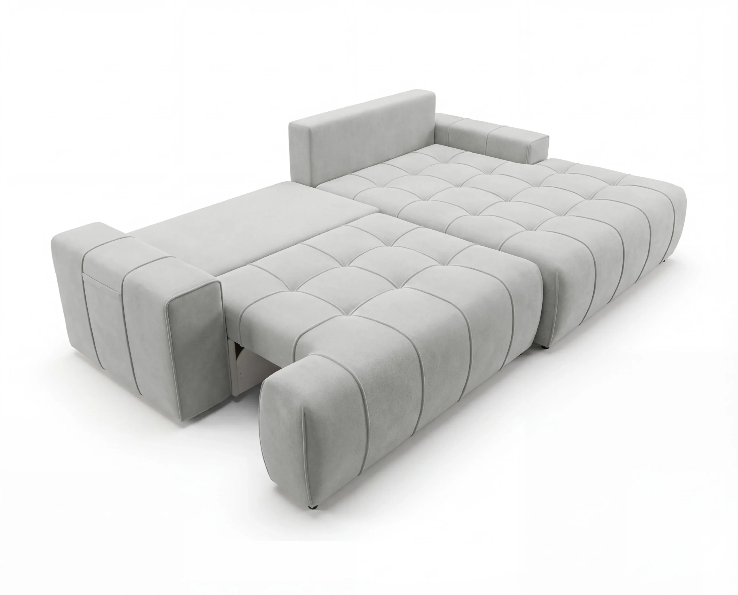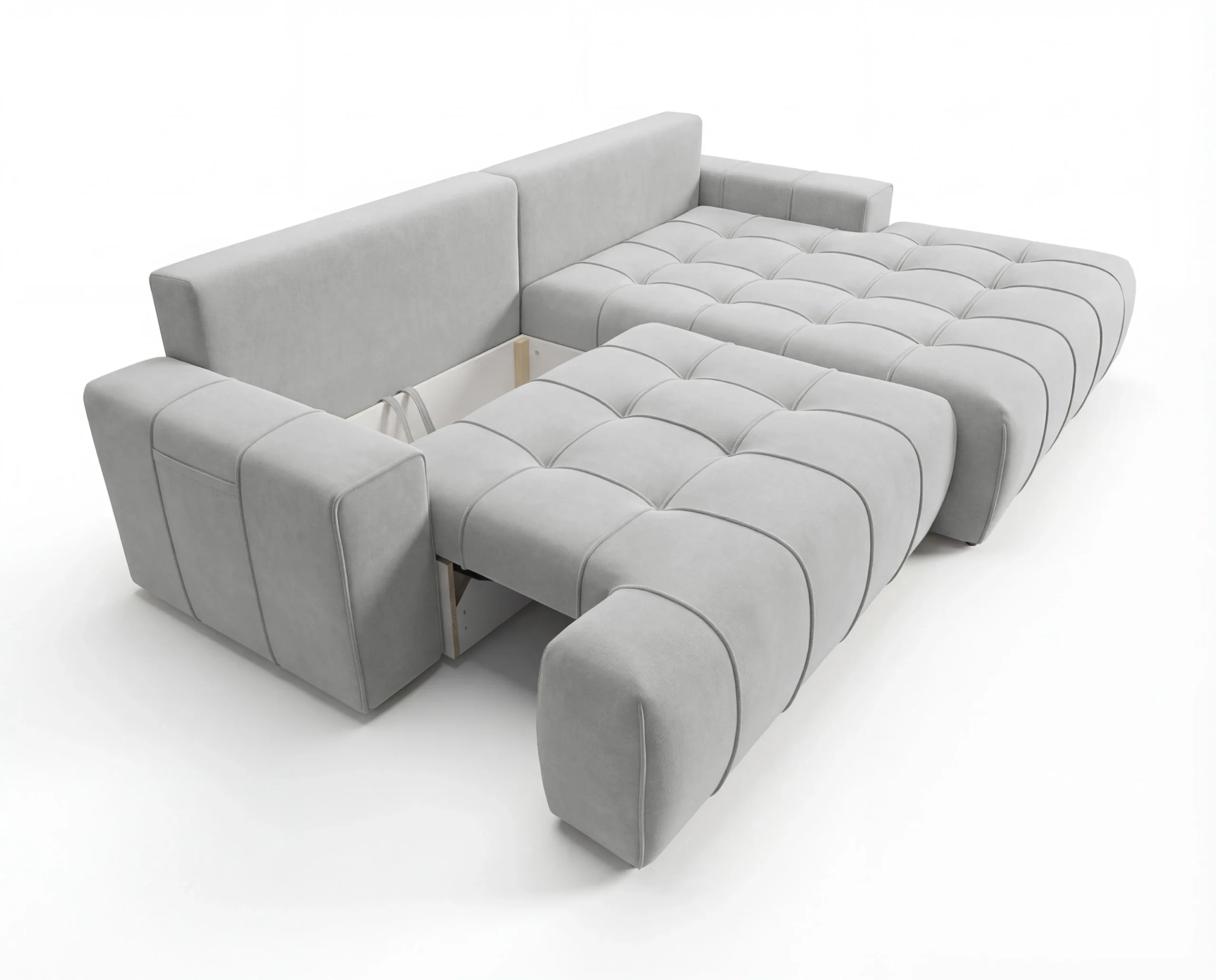 Nowoczesny narożnik z funkcją spania, pojemnikiem i kieszonką na boczkach Capri prawostronny jasnoszary