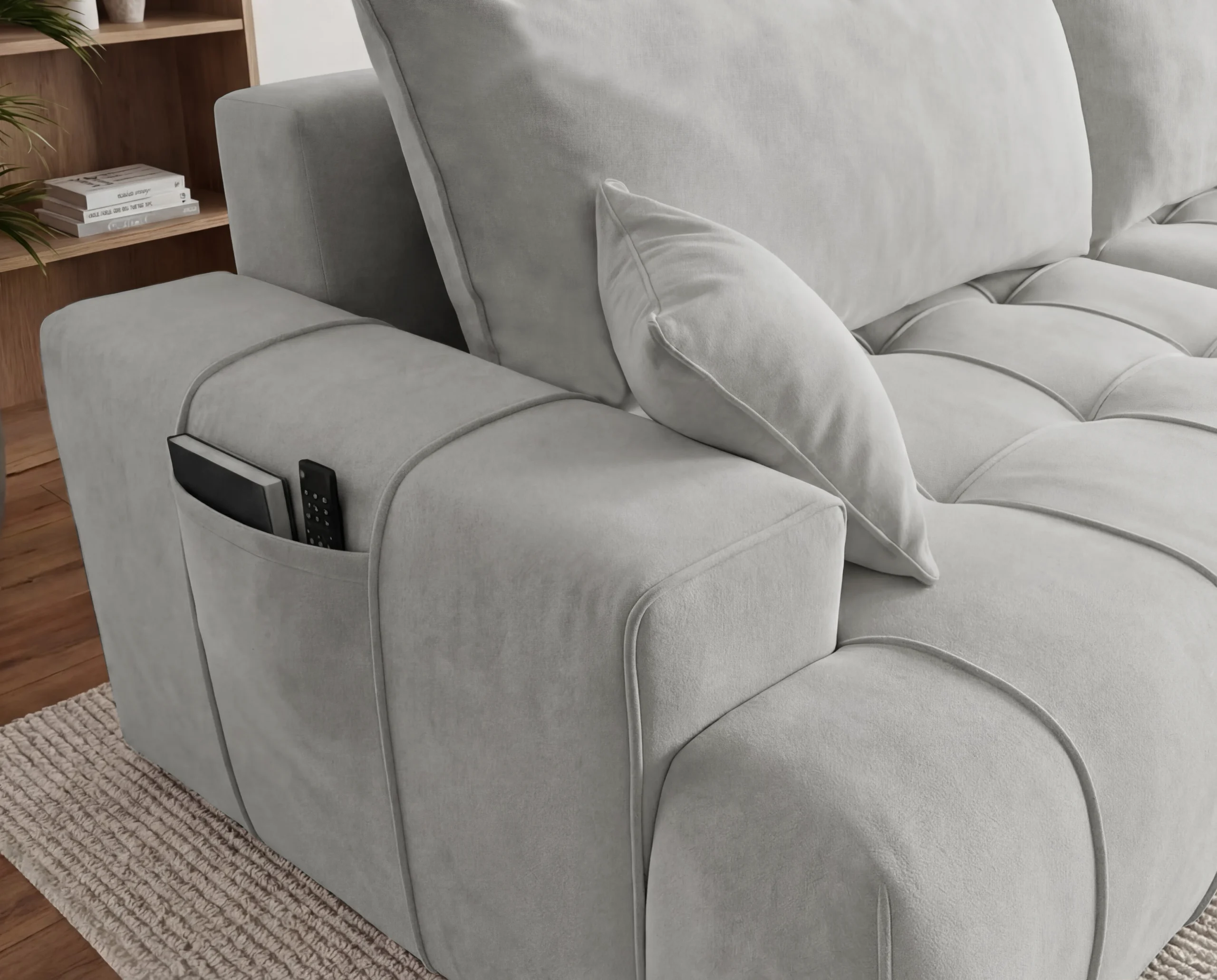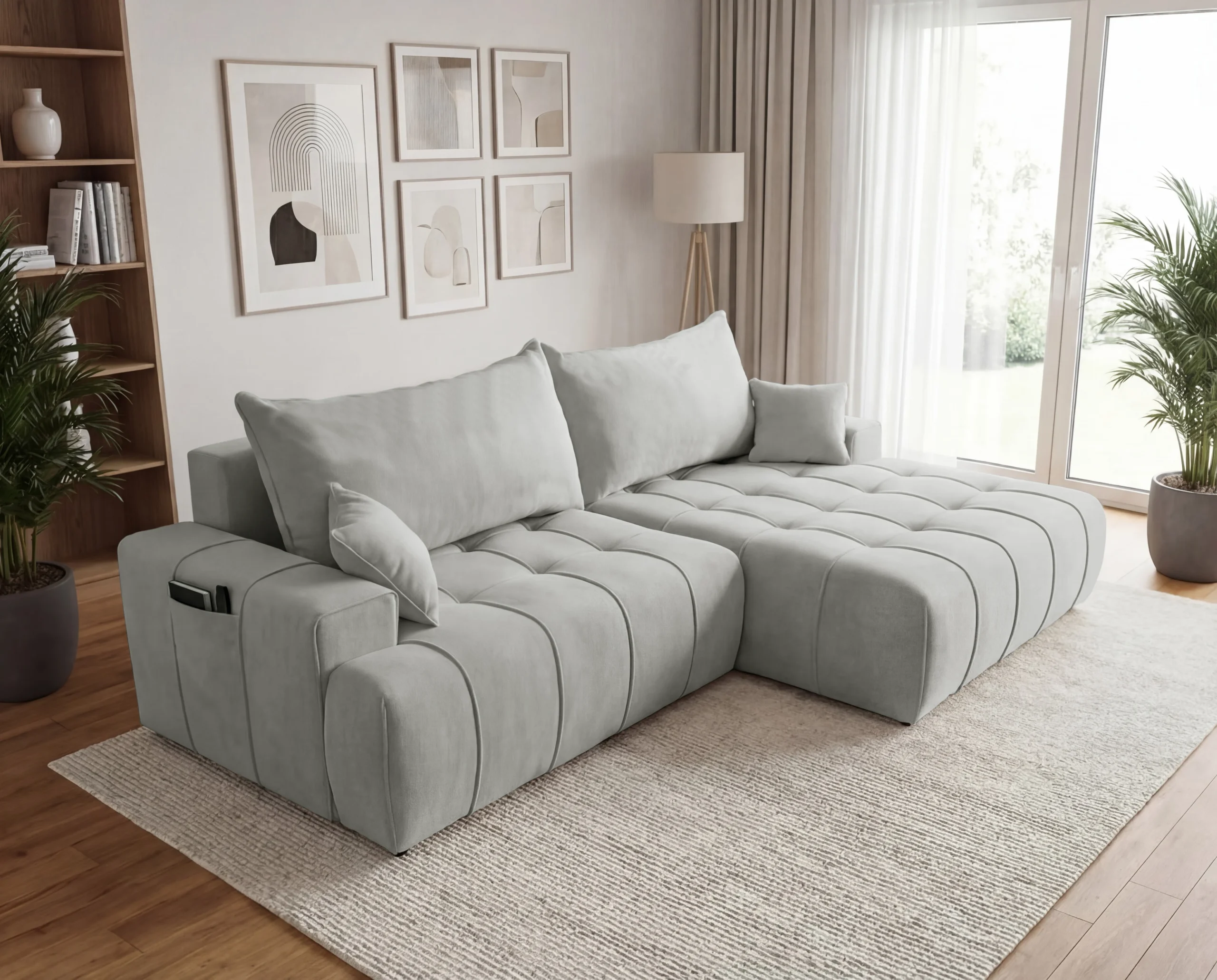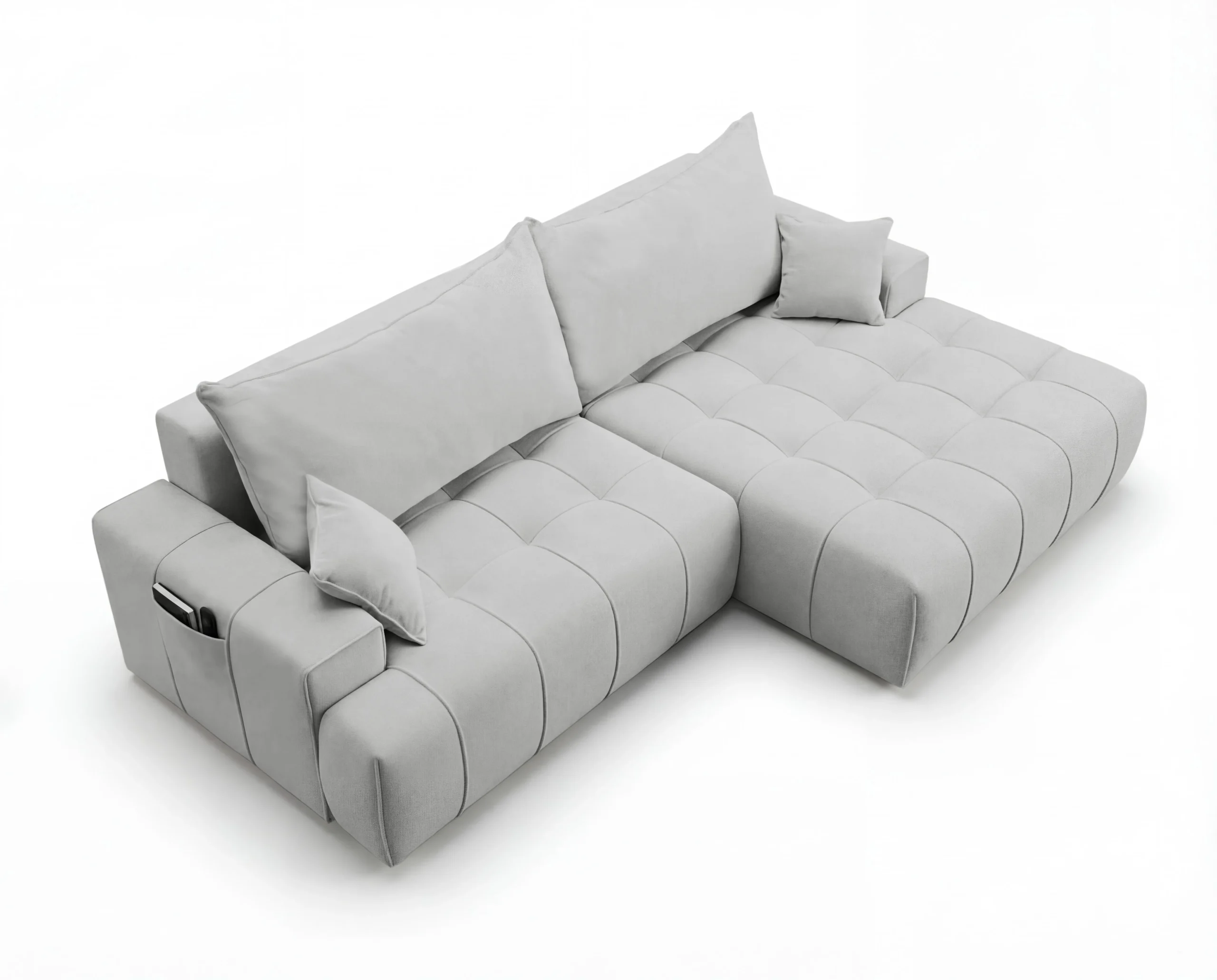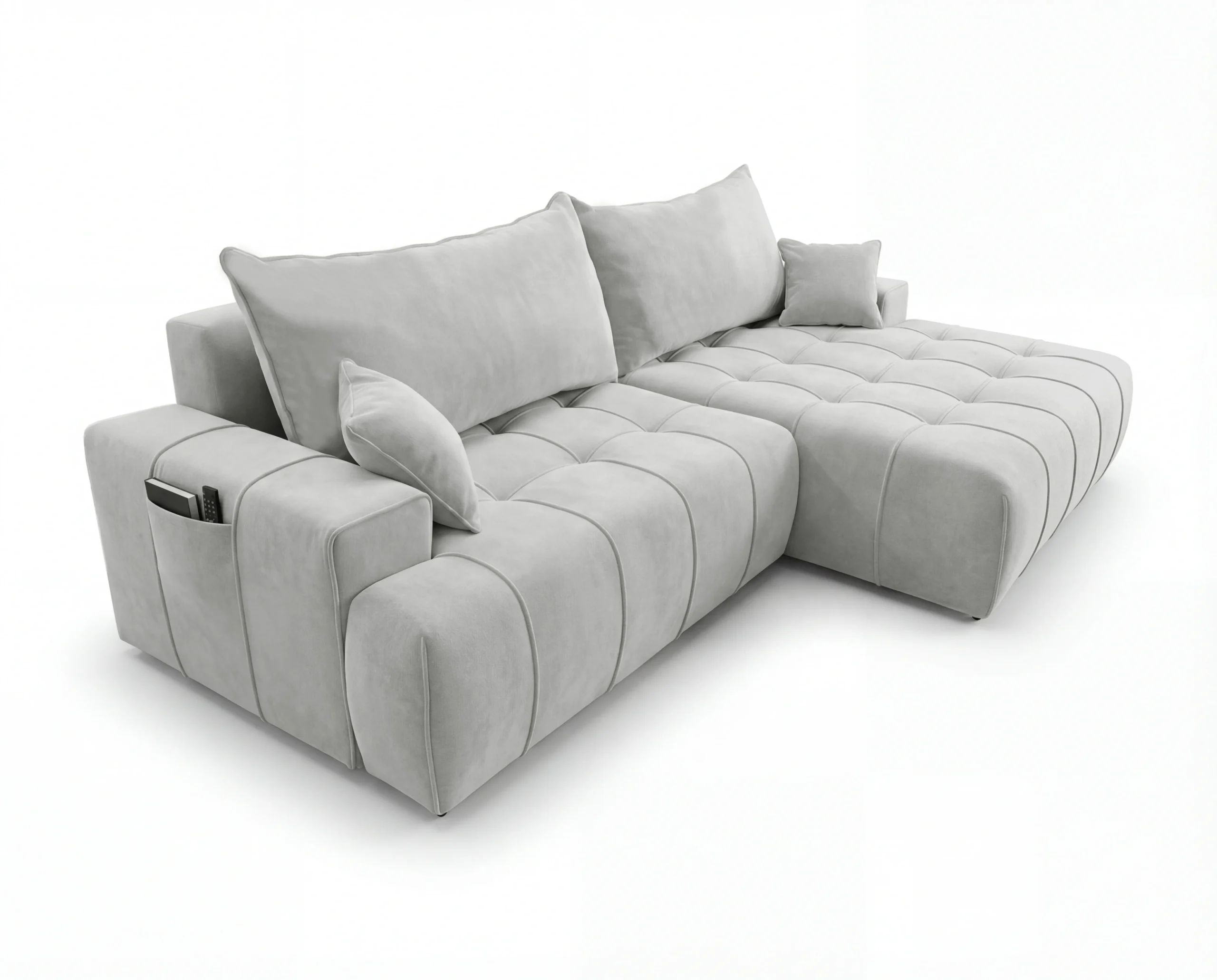 Dodatkowym atutem są praktyczne kieszonki na boczkach, idealne na książkę, pilot czy telefon. To wolnostojący narożnik tapicerowany, doskonały wybór do nowoczesnego salonu, mieszkania lub apartamentu, gdzie liczy się wygoda i estetyka.