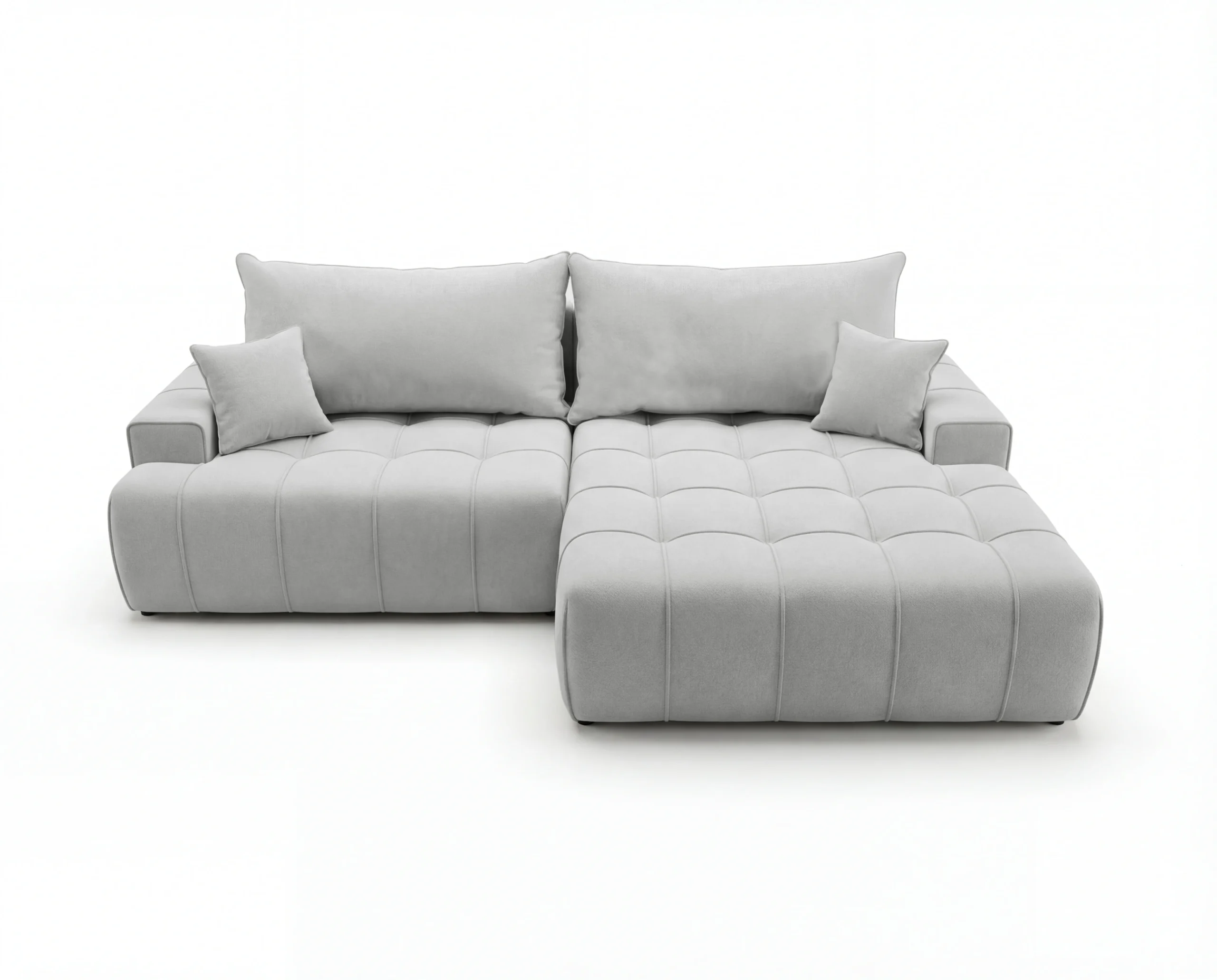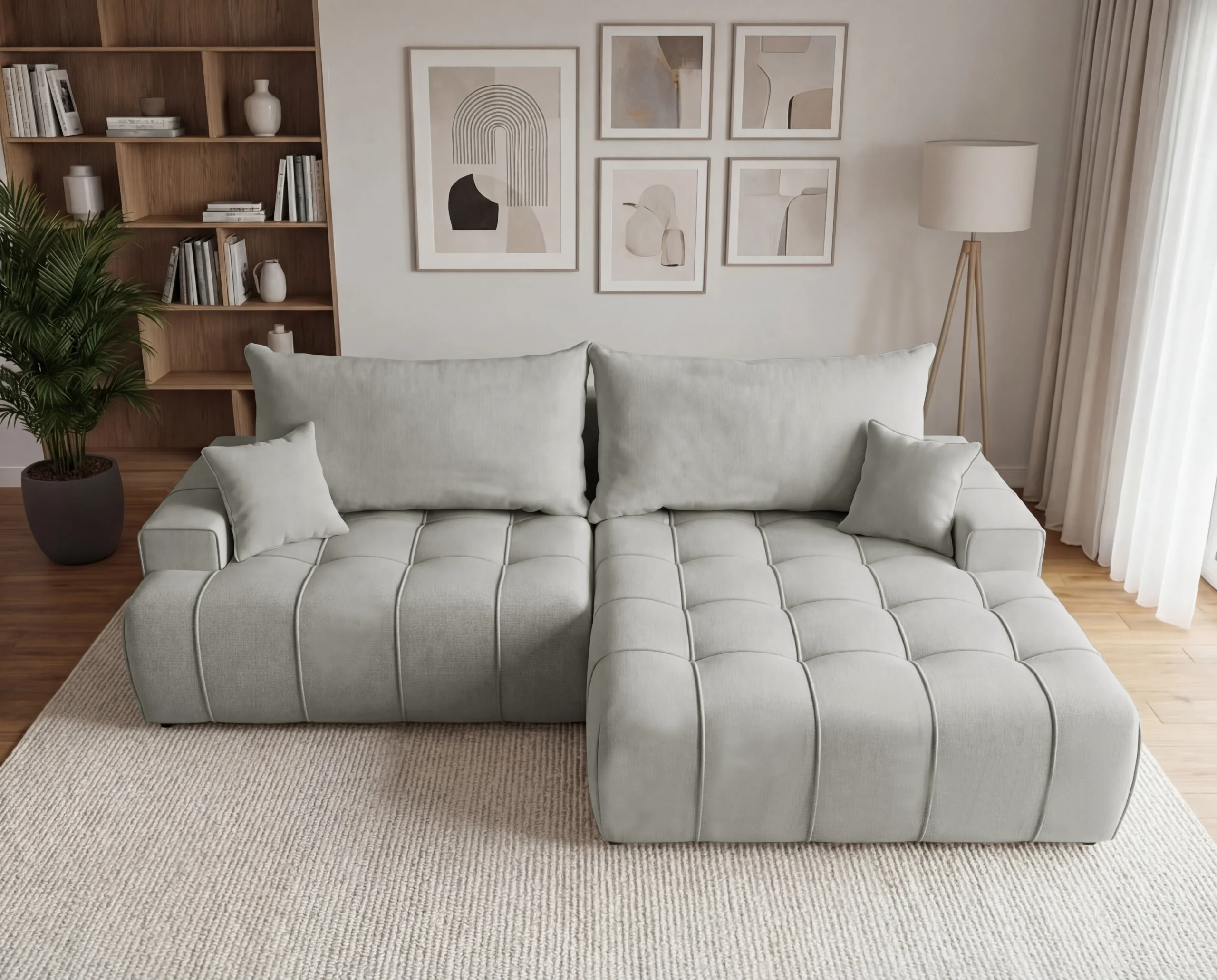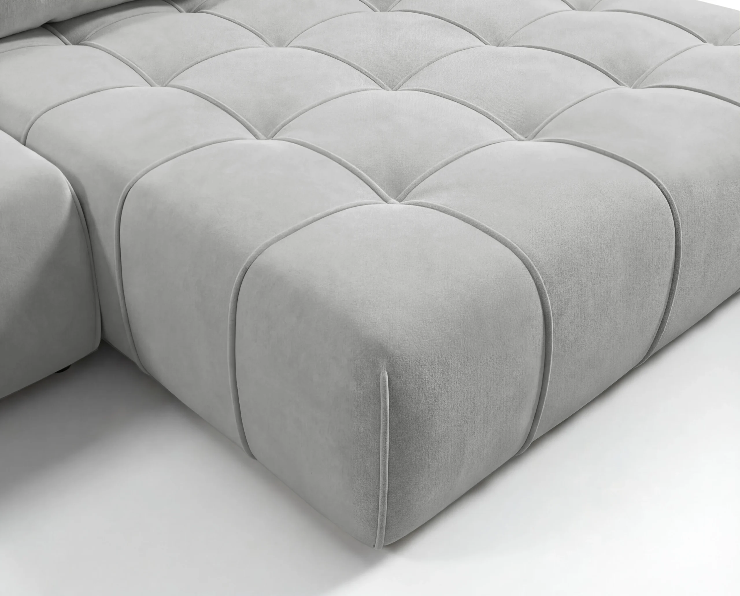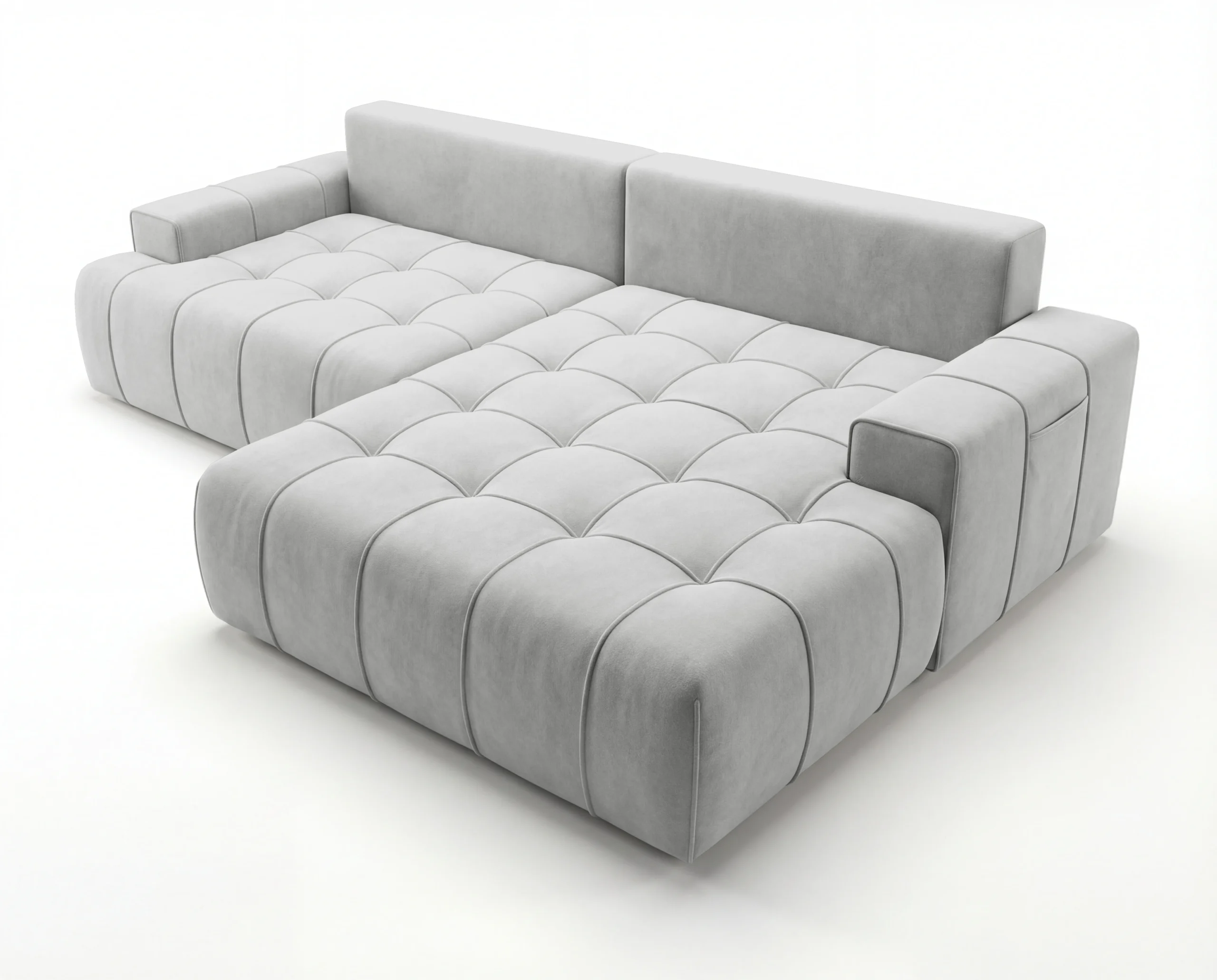 Dodatkowym atutem są praktyczne kieszonki na boczkach, idealne na książkę, pilot czy telefon. To wolnostojący narożnik tapicerowany, doskonały wybór do nowoczesnego salonu, mieszkania lub apartamentu, gdzie liczy się wygoda i estetyka.