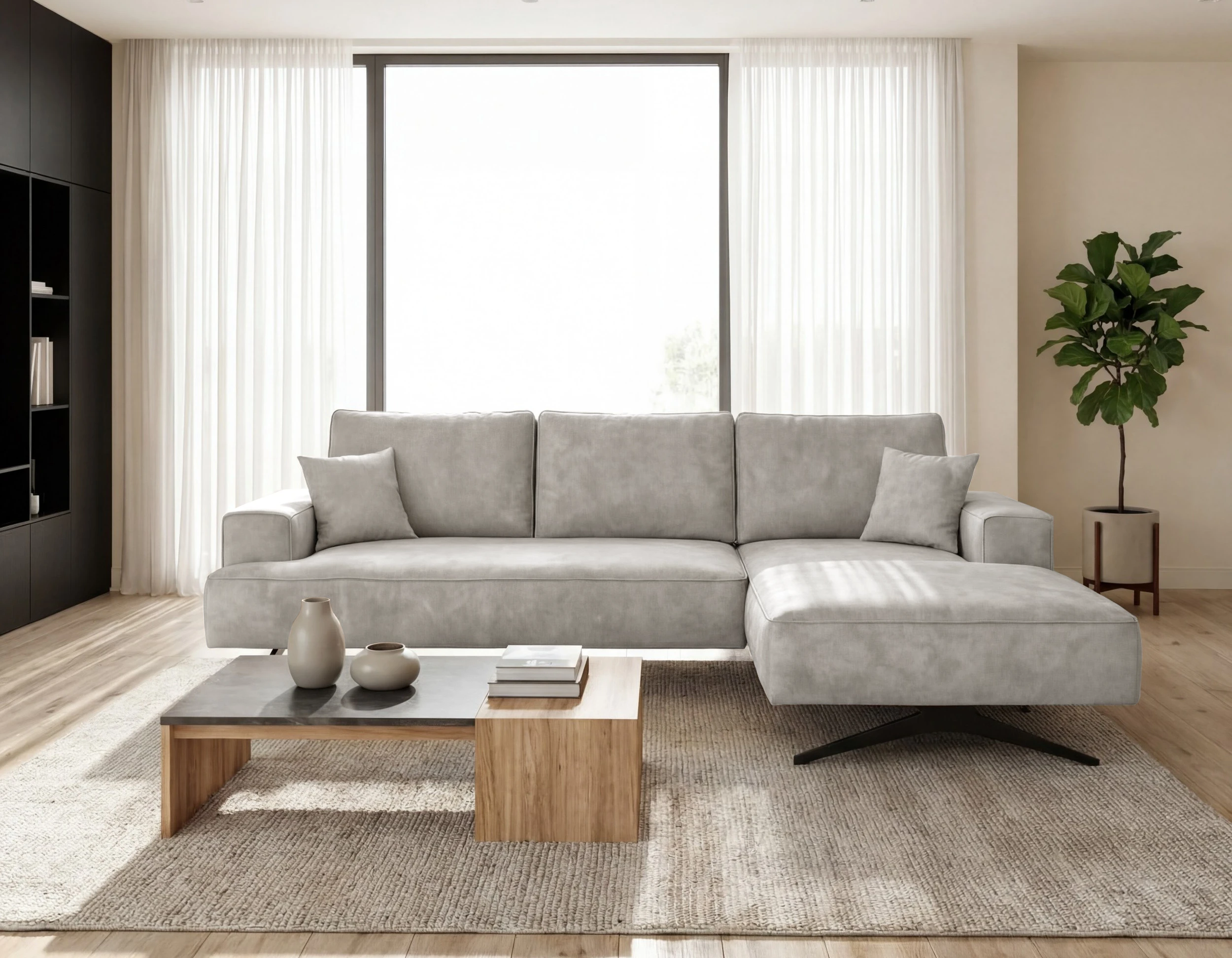 Sofa narożna Capitol to propozycja dla osób ceniących minimalistyczny styl, wygodę oraz wysoką jakość wykonania. Model bez funkcji spania doskonale sprawdzi się w eleganckim salonie, przestronnym apartamencie czy nowoczesnym biurze. Prosta, geometryczna bryła w połączeniu z designerskimi metalowymi nogami typu płozy tworzy efektowny mebel, który przyciąga wzrok i nadaje wnętrzu lekkości.