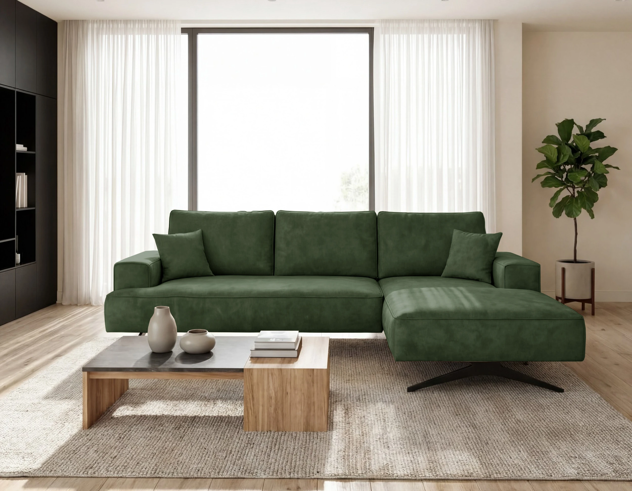Sofa narożna L bez funkcji spania i na wysokich nogach Capitol prawostronny zielony