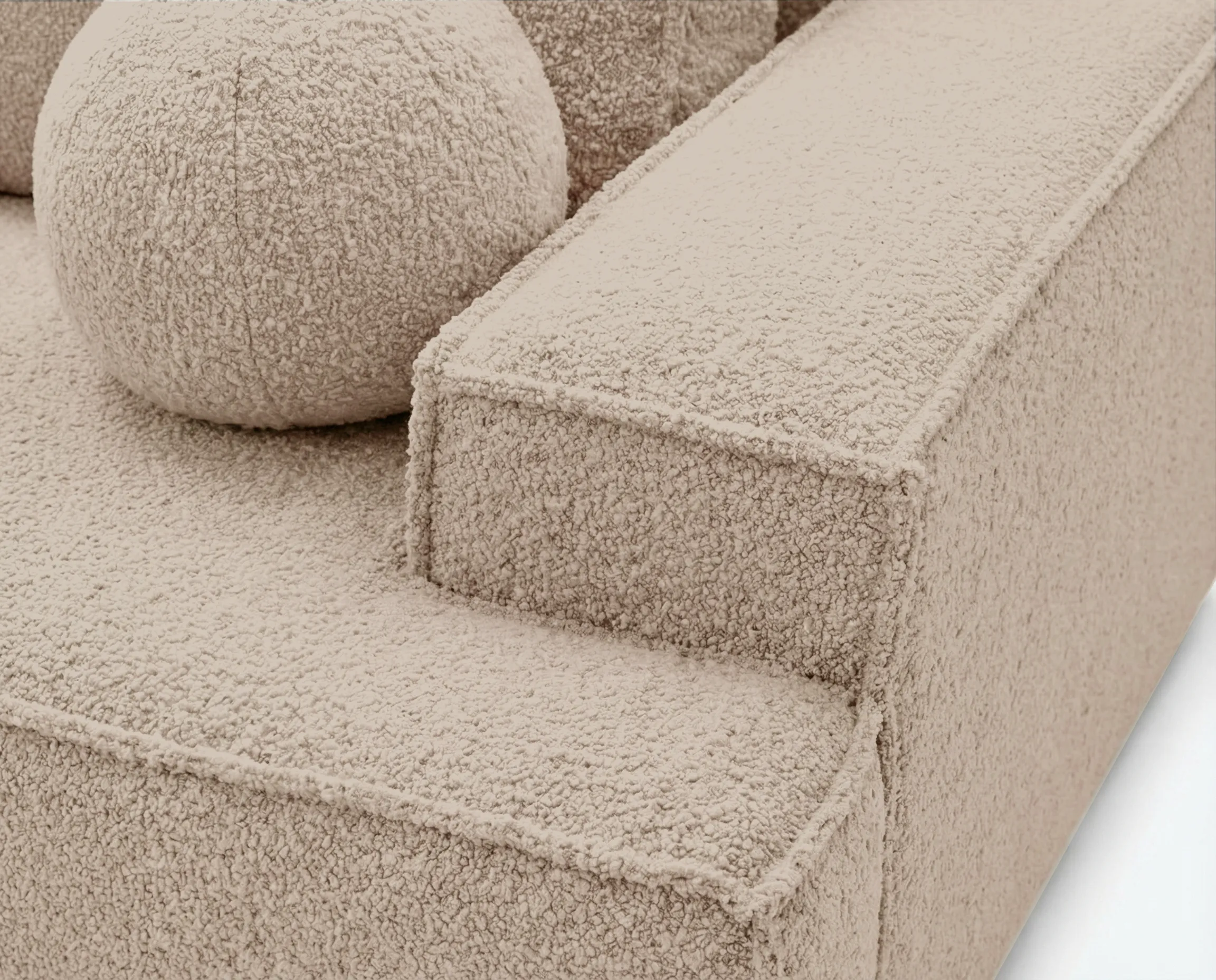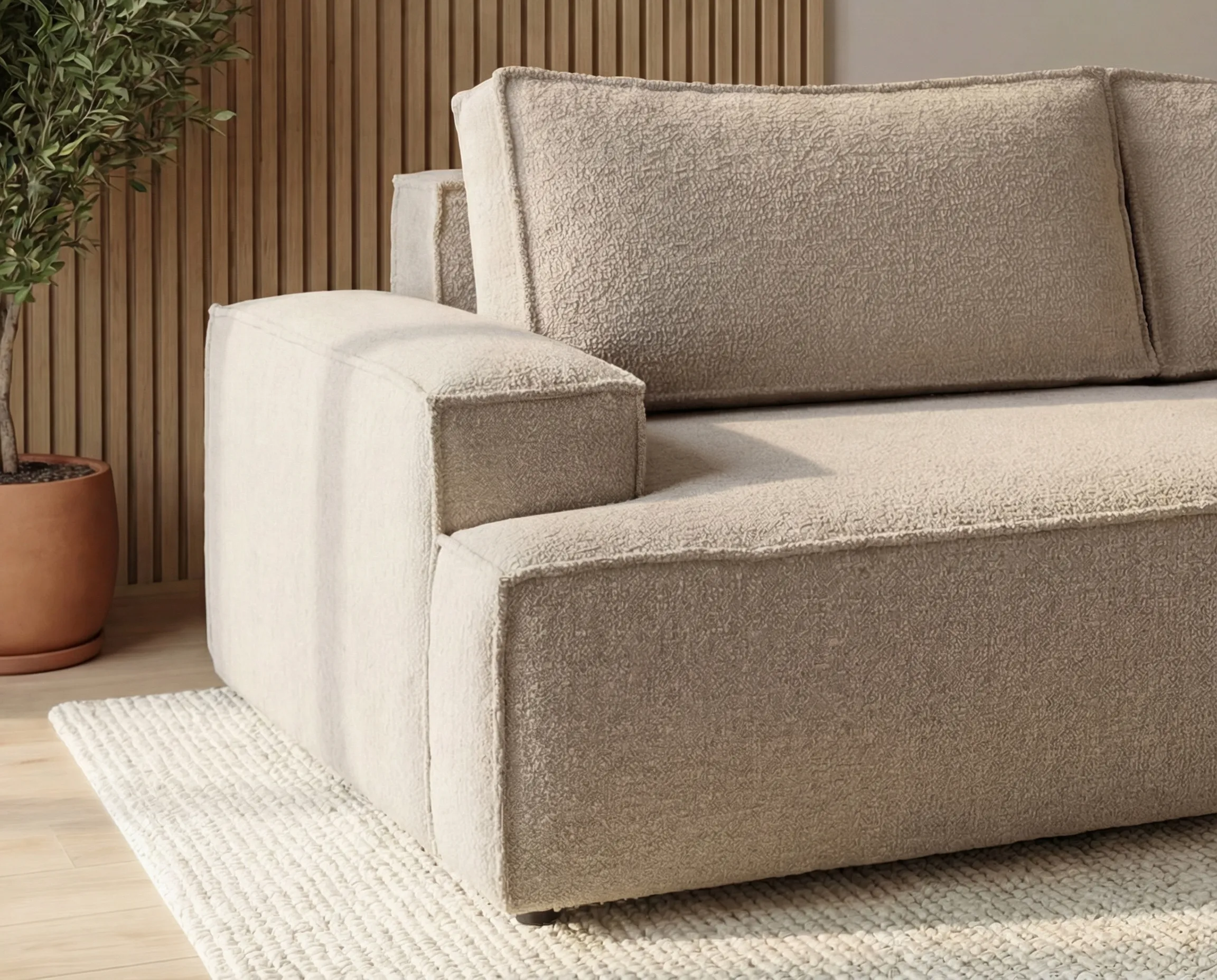 Model Ines został obity modną tkaniną typu bouclé, która wyróżnia się charakterystyczną, miękką i przyjemną w dotyku strukturą. Materiał ten nie tylko nadaje sofie elegancki i przytulny wygląd, ale również cechuje się dobrą odpornością na codzienne użytkowanie.