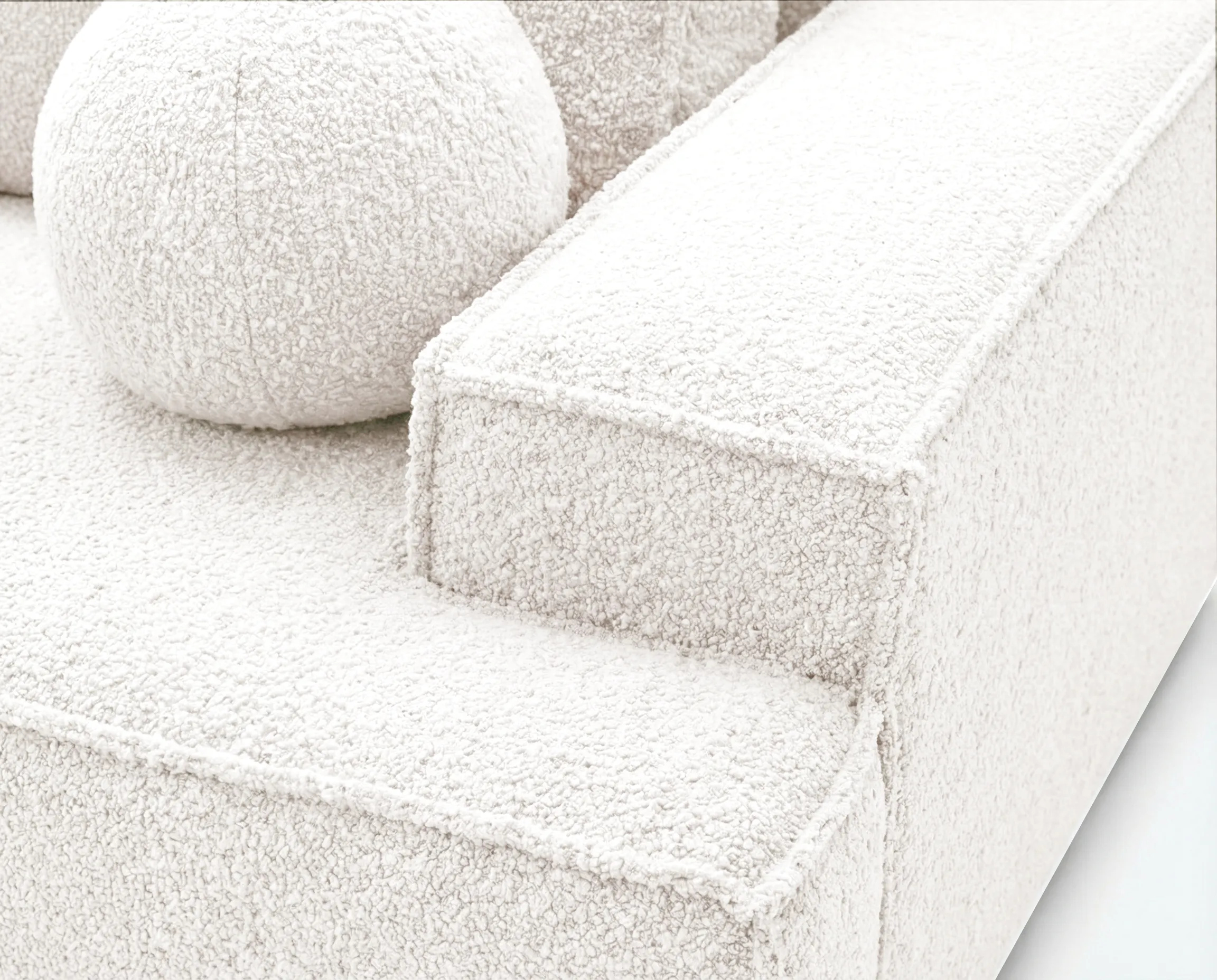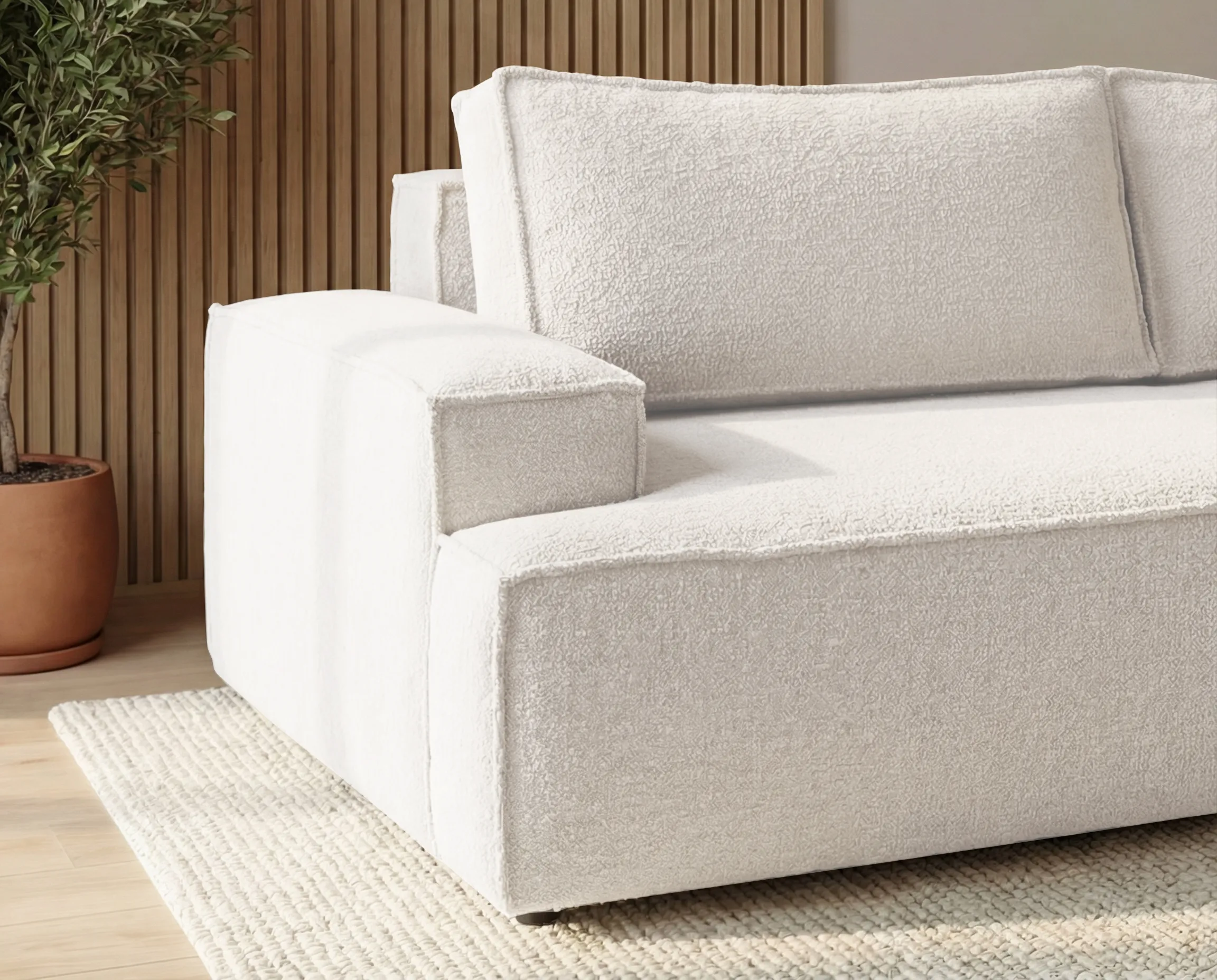 Model Ines został obity modną tkaniną typu bouclé, która wyróżnia się charakterystyczną, miękką i przyjemną w dotyku strukturą. Materiał ten nie tylko nadaje sofie elegancki i przytulny wygląd, ale również cechuje się dobrą odpornością na codzienne użytkowanie.
