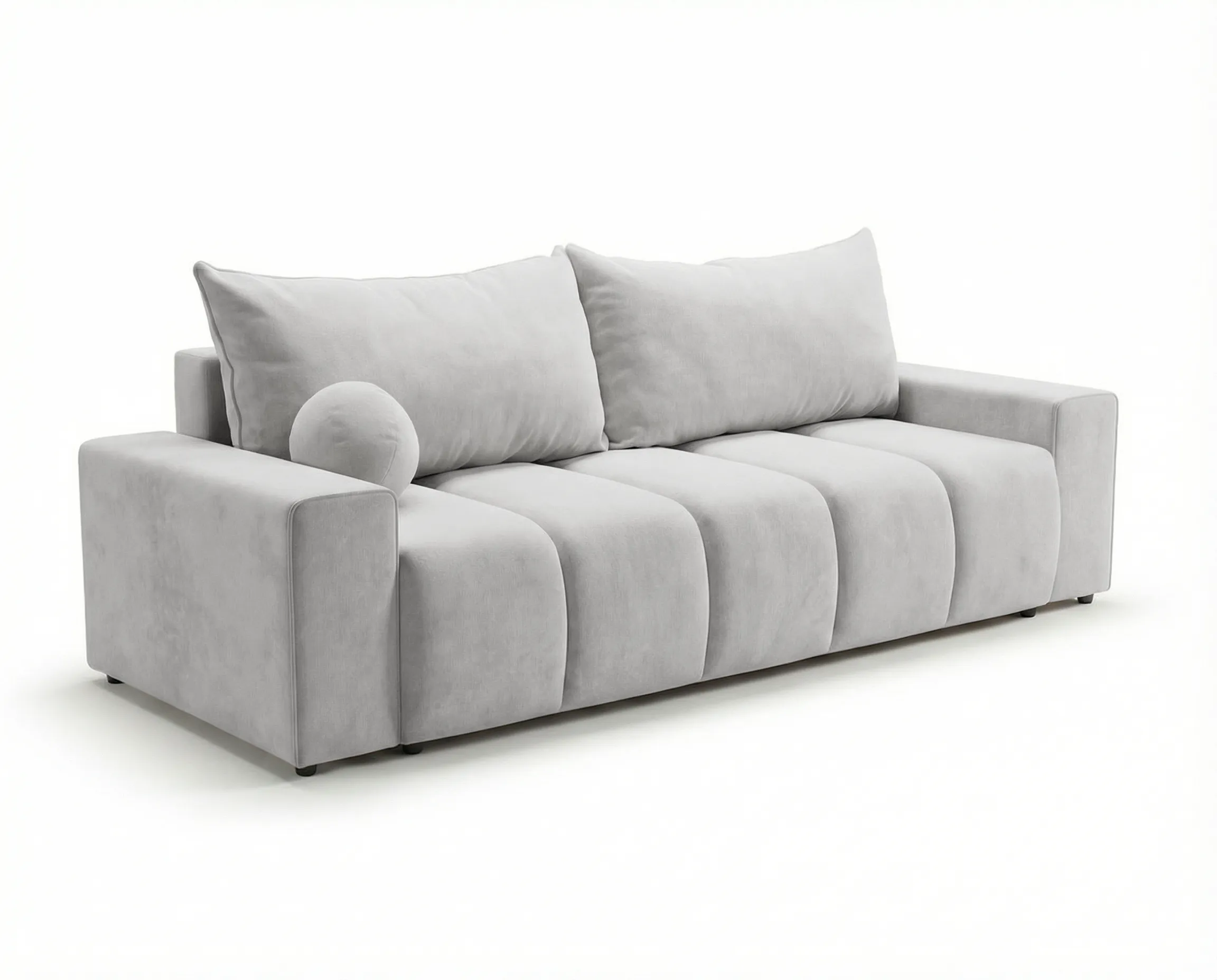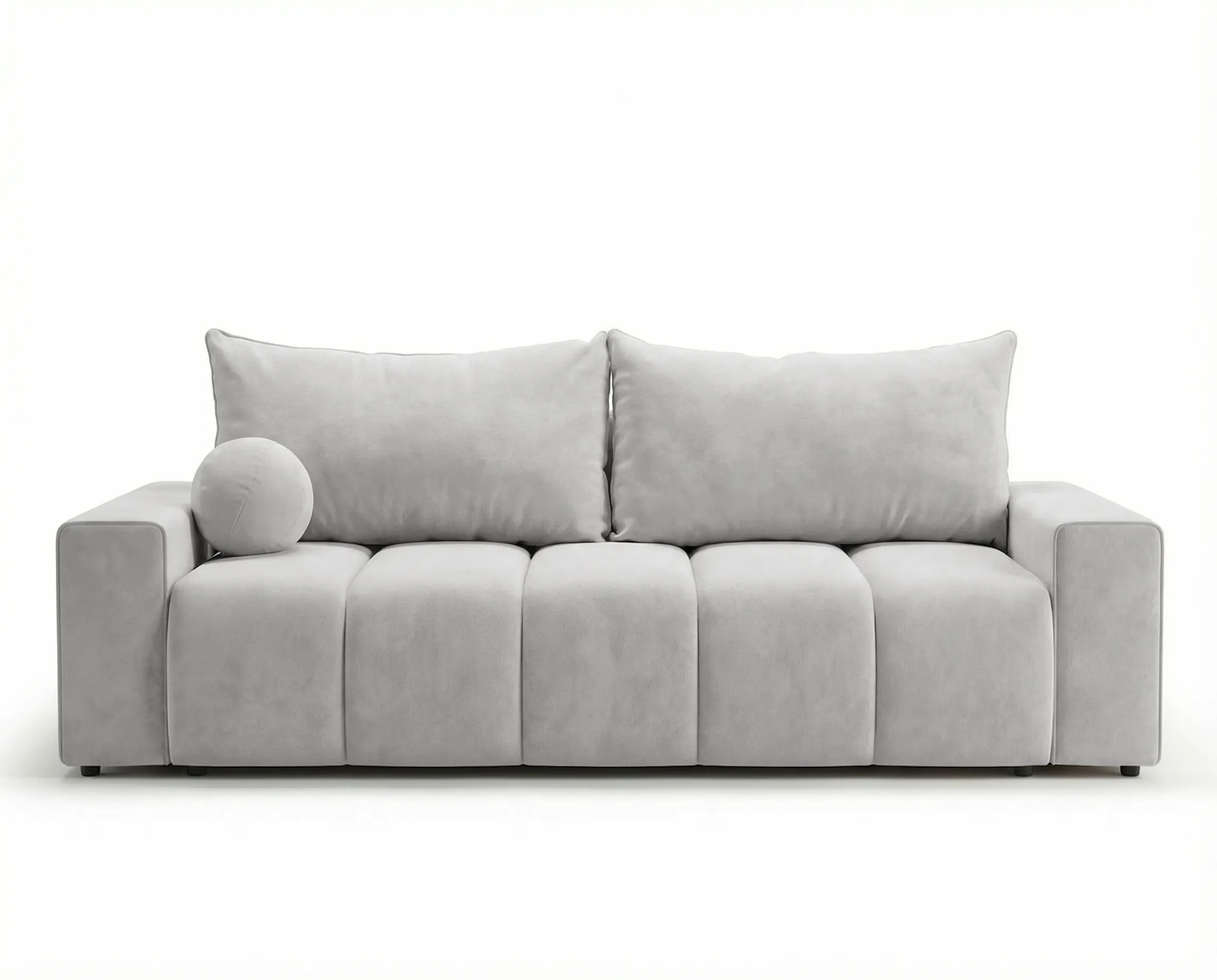 Siedzisko wykonano z wygodnej pianki w połączeniu ze sprężyną falistą, co zapewnia odpowiednie podparcie, trwałość oraz komfort podczas siedzenia i snu. W komplecie znajdują się dwie duże poduszki z wypełnieniem z kulki silikonowej oraz dwie mniejsze poduszki dekoracyjne, które zwiększają wygodę użytkowania i nadają sofie przytulnego charakteru.