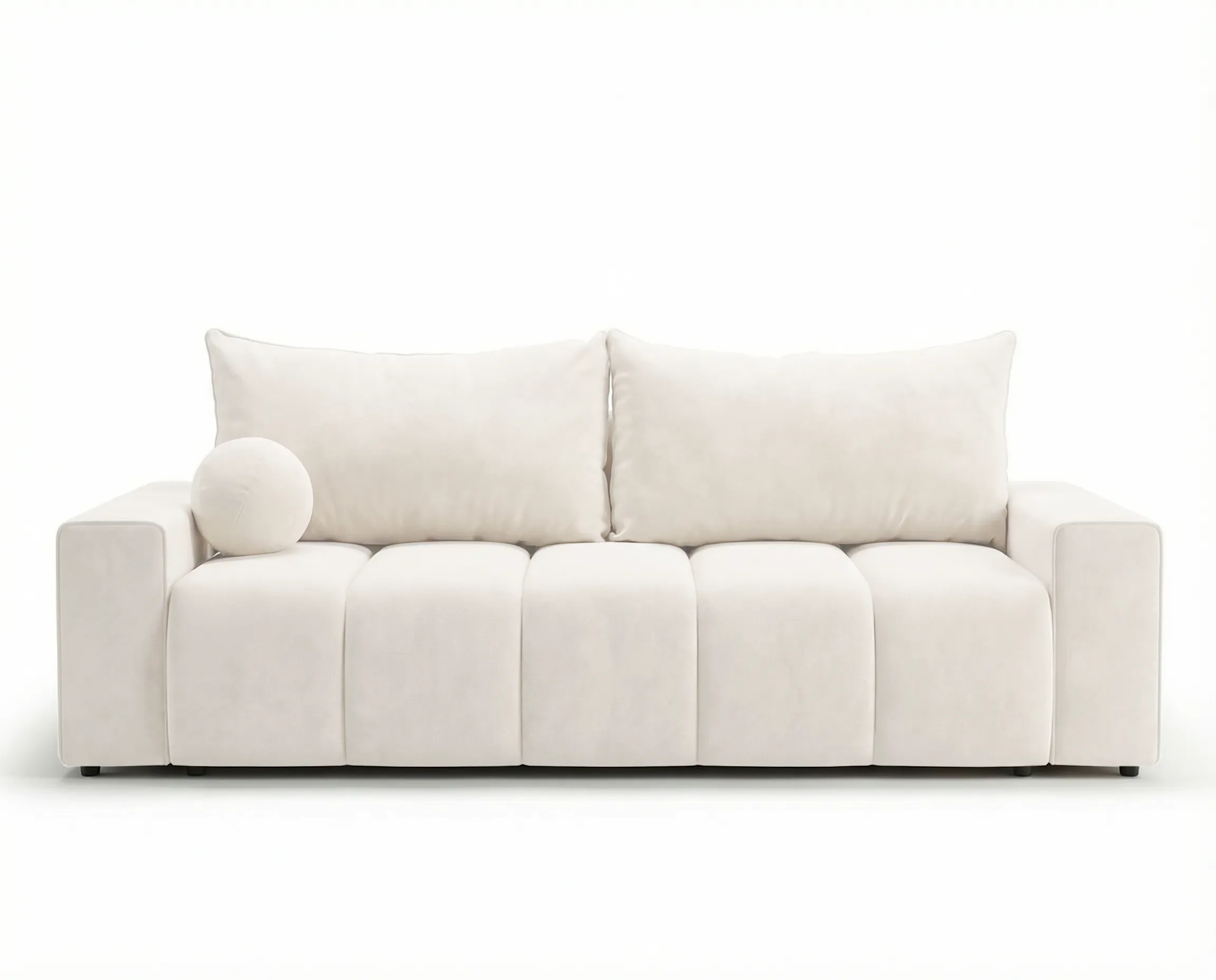 Siedzisko wykonano z wygodnej pianki w połączeniu ze sprężyną falistą, co zapewnia odpowiednie podparcie, trwałość oraz komfort podczas siedzenia i snu. W komplecie znajdują się dwie duże poduszki z wypełnieniem z kulki silikonowej oraz dwie mniejsze poduszki dekoracyjne, które zwiększają wygodę użytkowania i nadają sofie przytulnego charakteru.